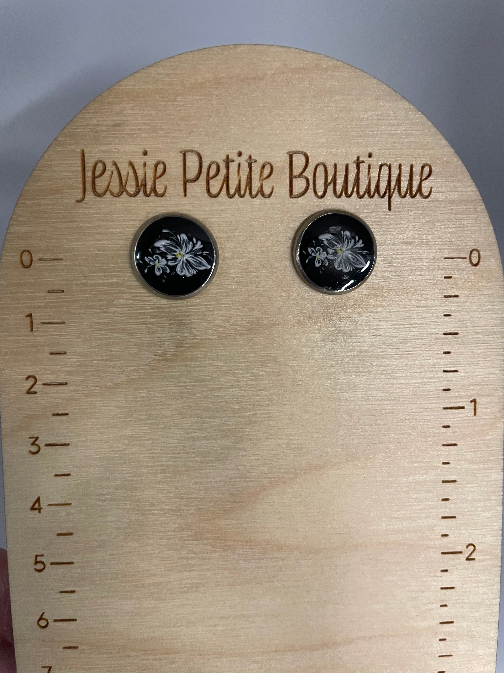 Timeless and elegant, these stainless steel stud earrings feature a refined black base adorned with delicate white floral accents. Handcrafted with resin, mica powder, and intricate stickers, they create a soft glossy finish that catches the light beautifully — a perfect everyday accessory that pairs effortlessly with any outfit.