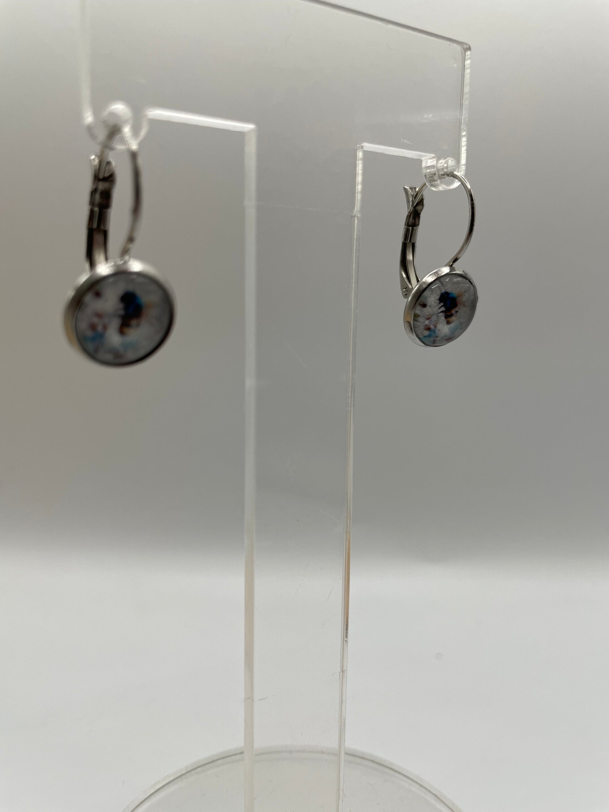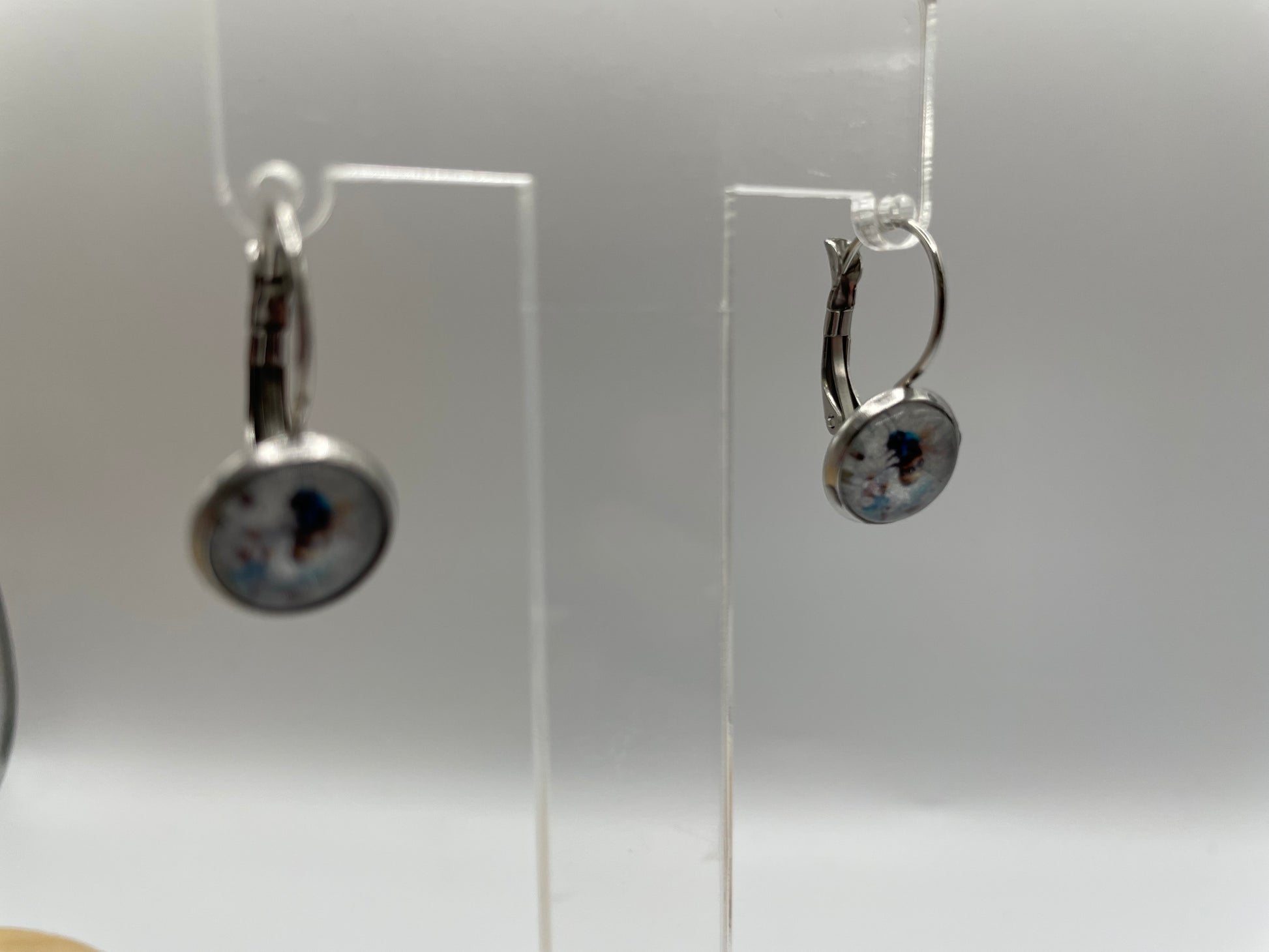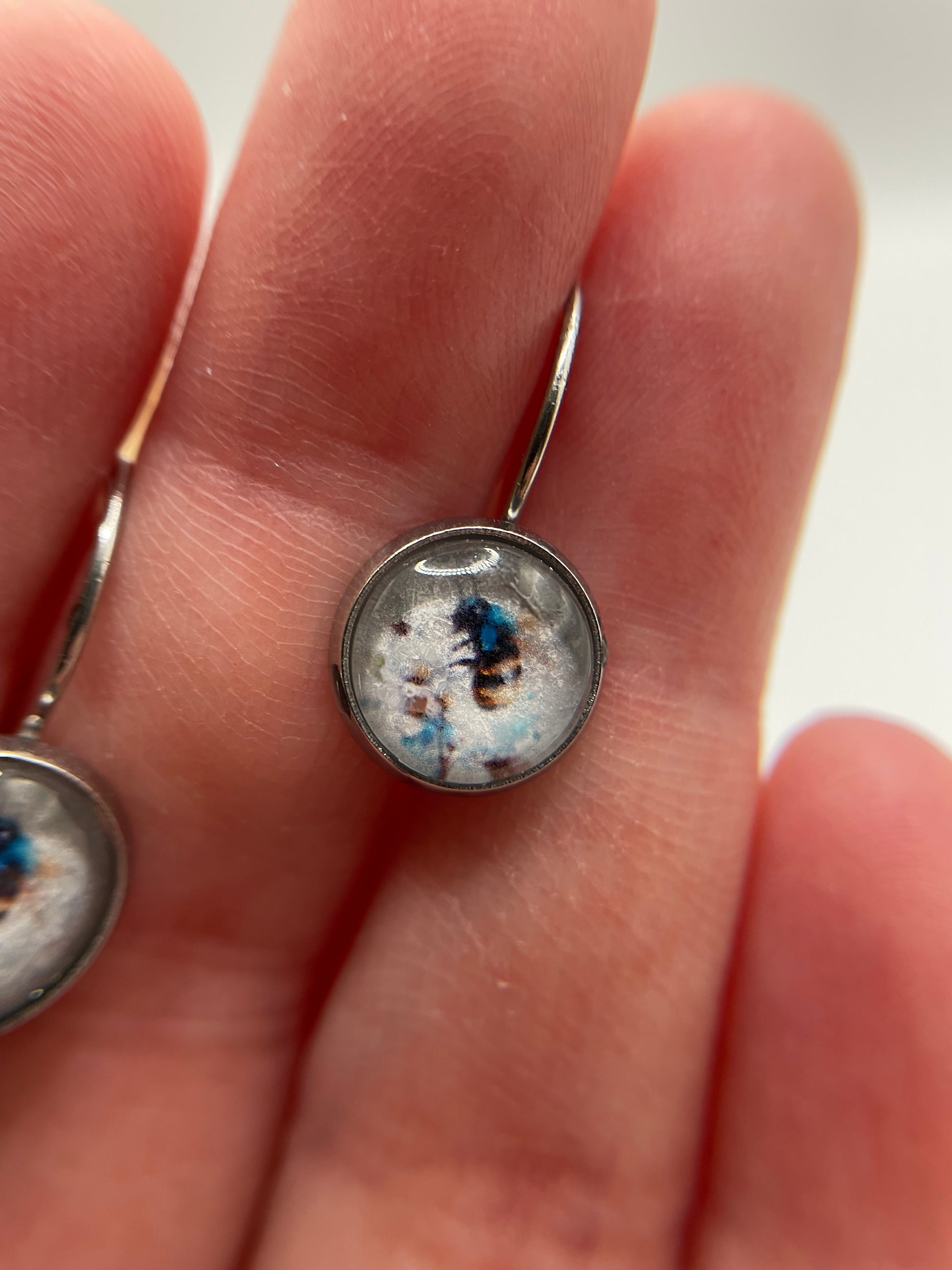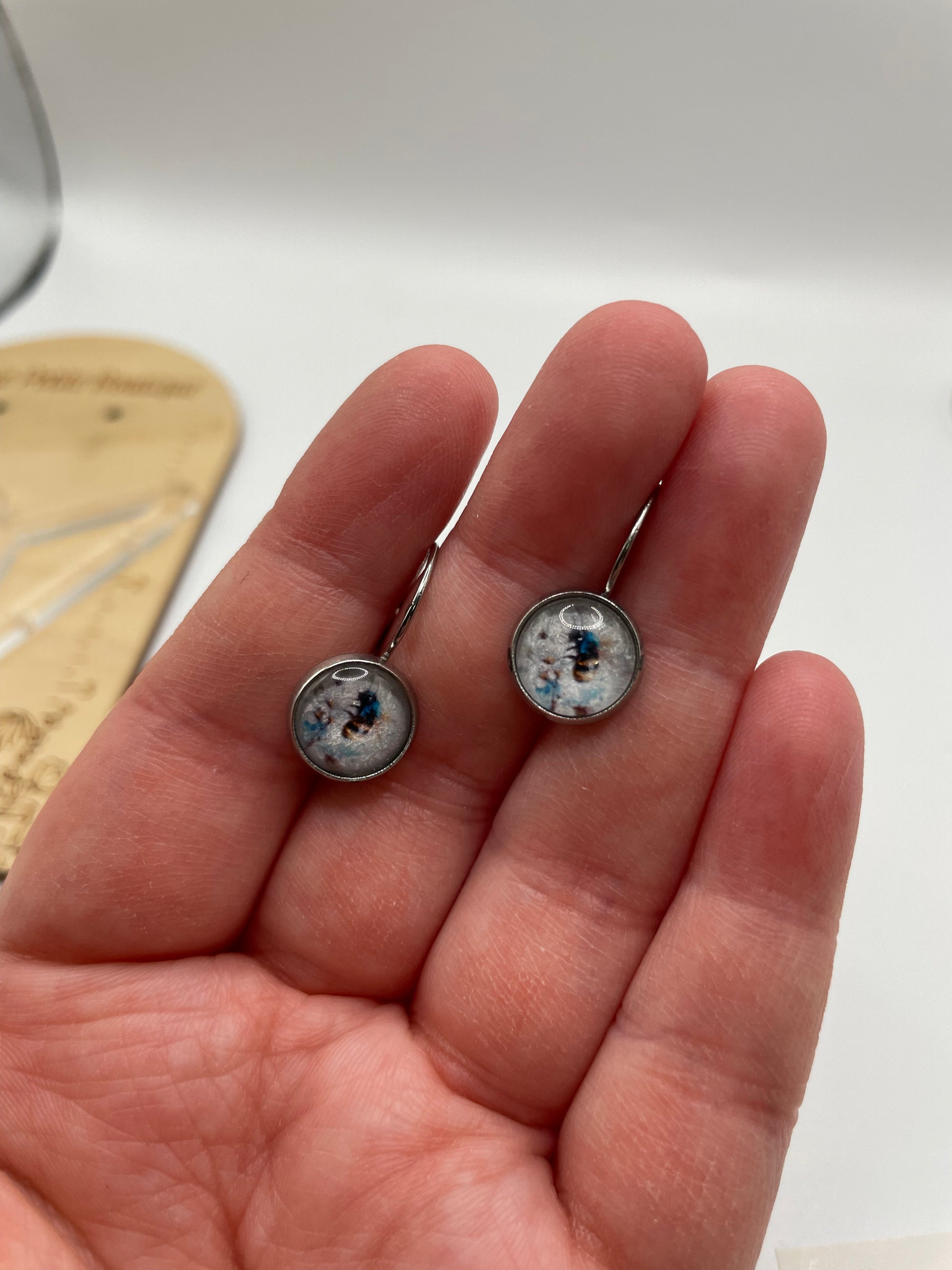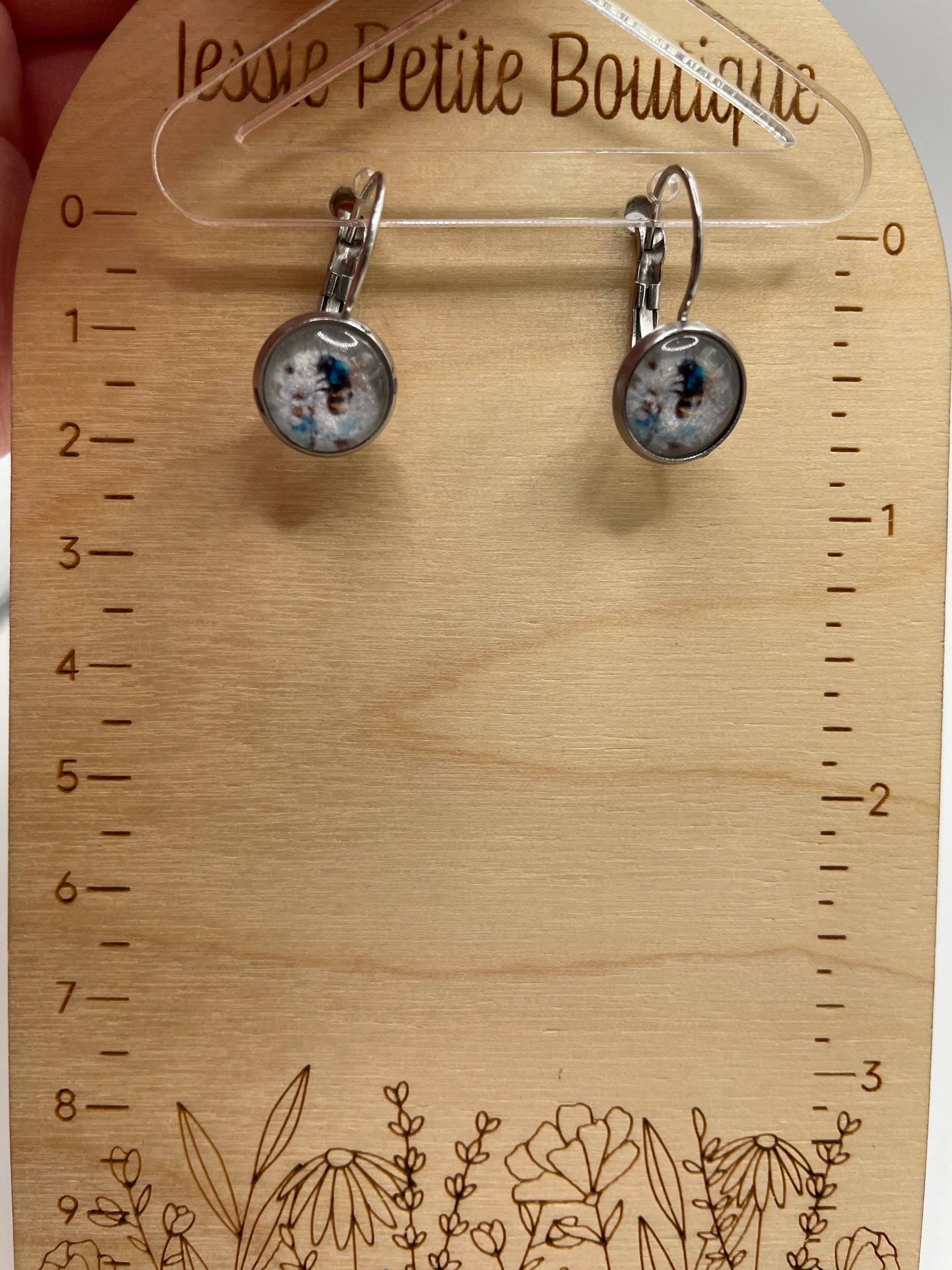 Delicate and modern, these Blue Bee earrings showcase a minimalist artistic pattern captured beneath a smooth glass cabochon.