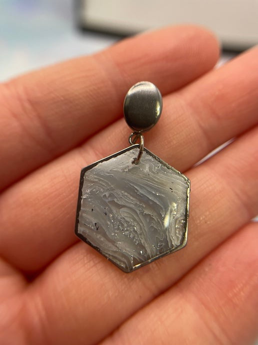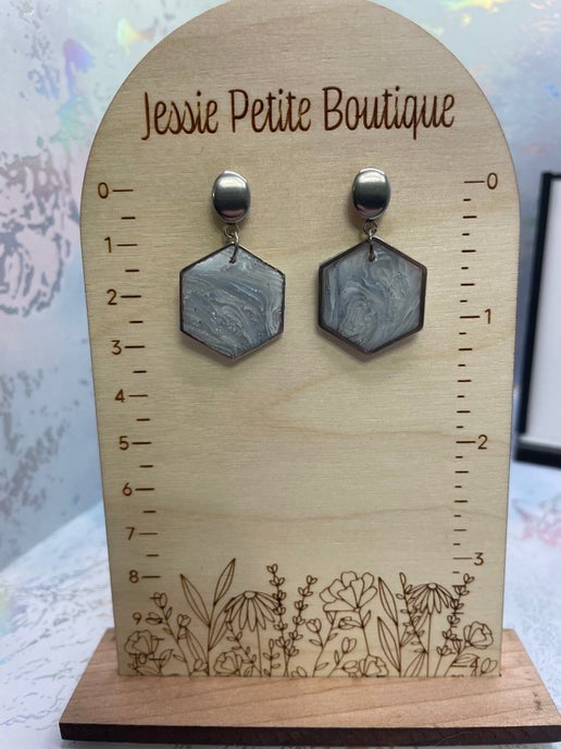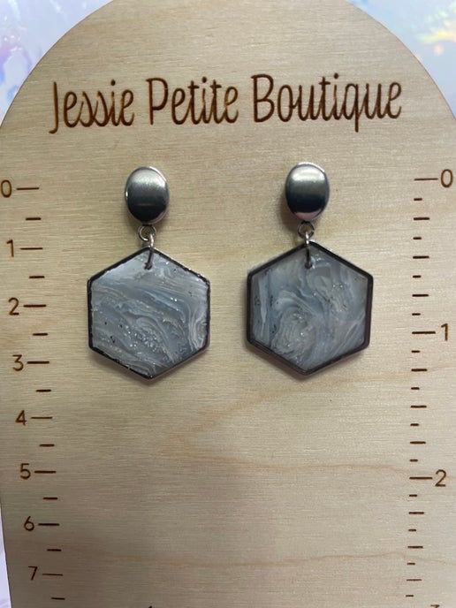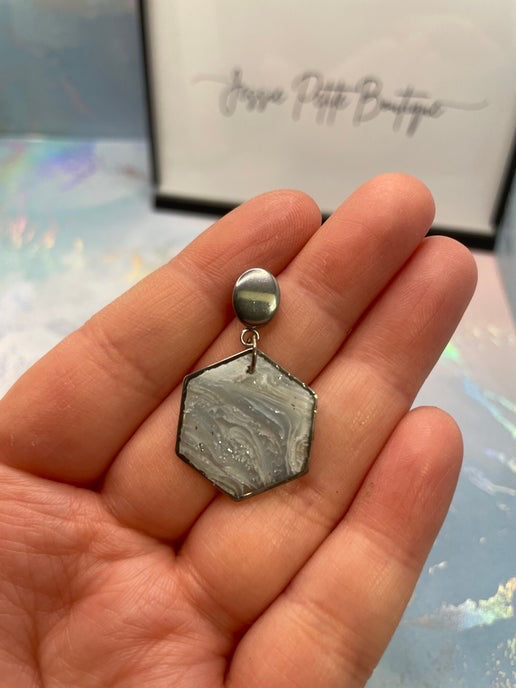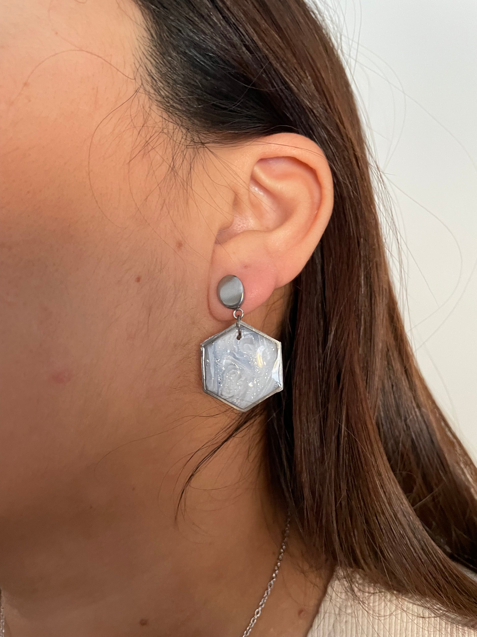 Elevate your accessory game with our Blue Marble Hexagon Earrings! These eye-catching earrings showcase a unique hexagonal shape crafted from a stunning mix of blue, silver, and white colors, beautifully accented with flakes and resin. The elegant design is complemented by a durable stainless steel stud closure.