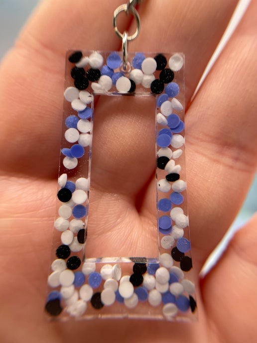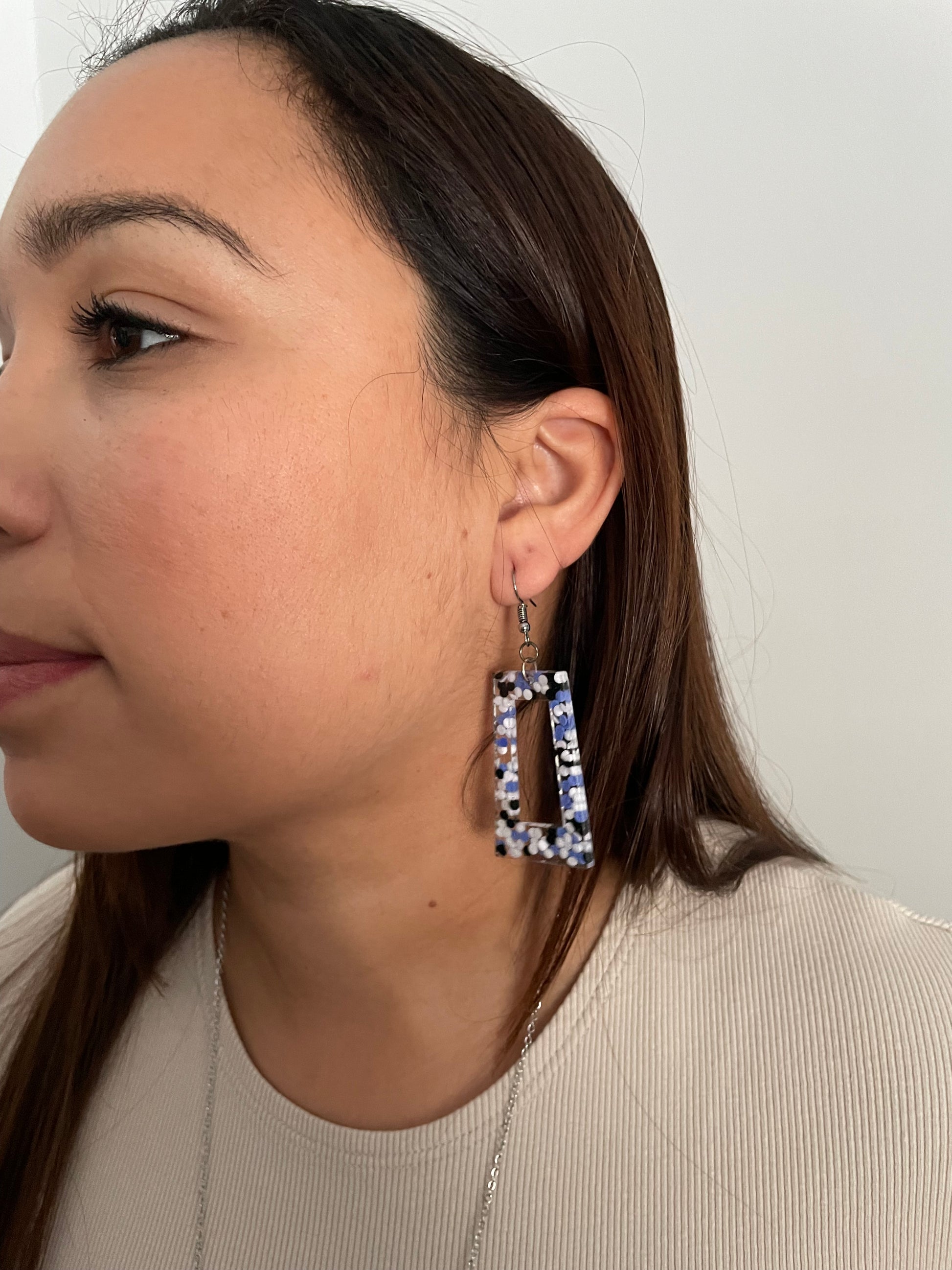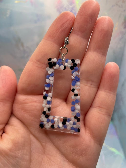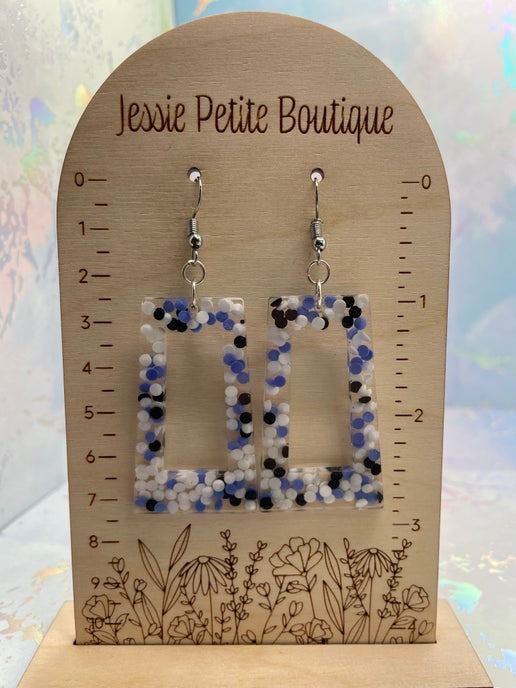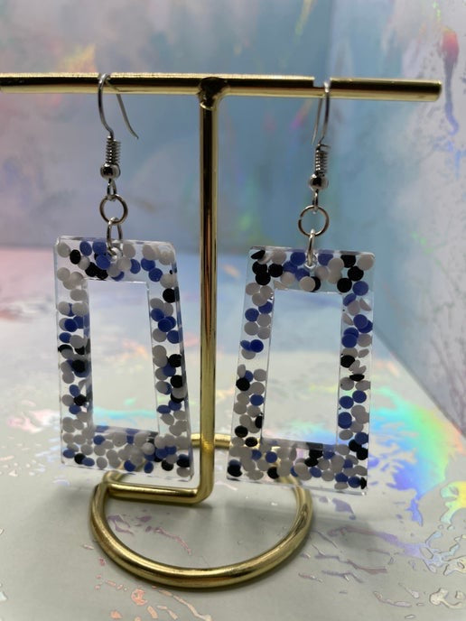 These playful rectangle earrings showcase a unique combination of clear resin with blue, white, and black dots scattered throughout. The addition of subtle glitter within the design gives the earrings a touch of sparkle, making them perfect for any occasion that calls for a bit of fun and flair.