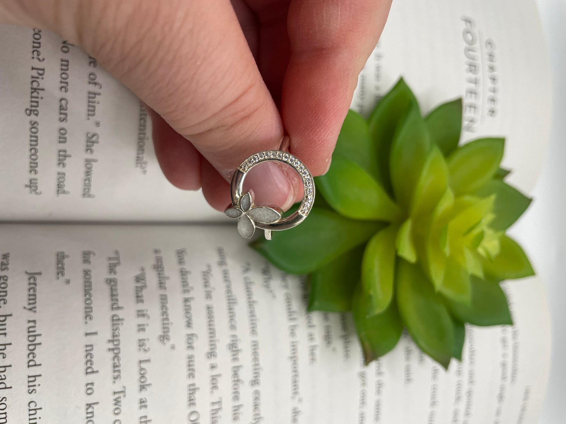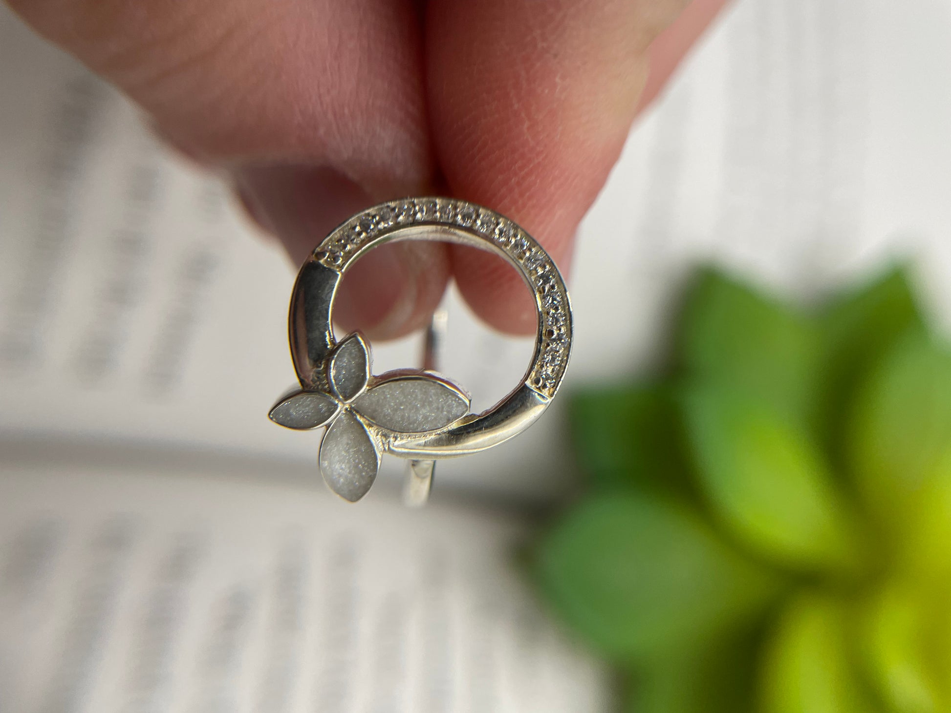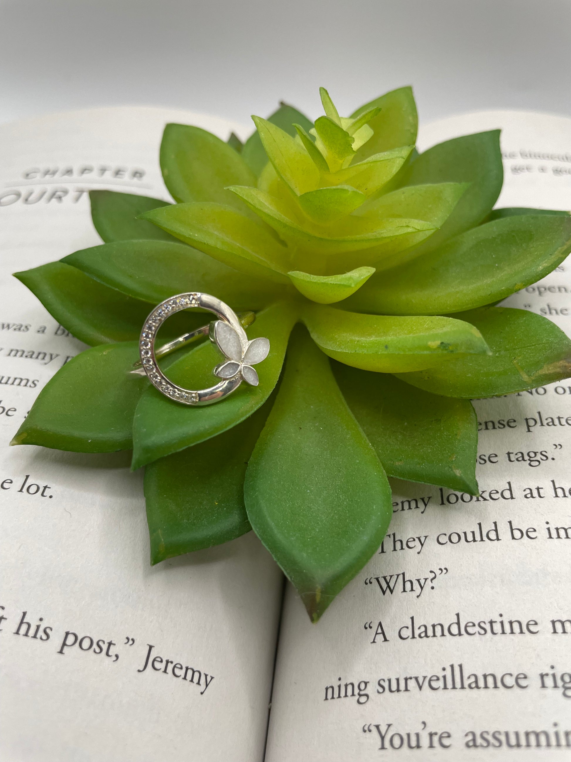 The butterfly is crafted in resin and mica powder, giving it a soft pearly shimmer that beautifully contrasts with the polished silver.