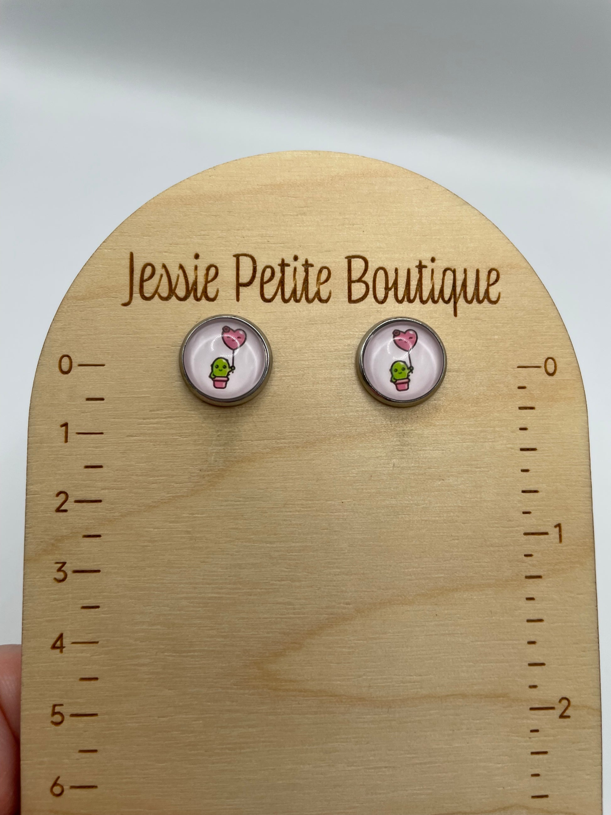 Each piece is made with nickel-free +stainless steel and features a 13 mm glass cabochon showcasing a cute green cactus holding a pink heart balloon on a soft pastel background.