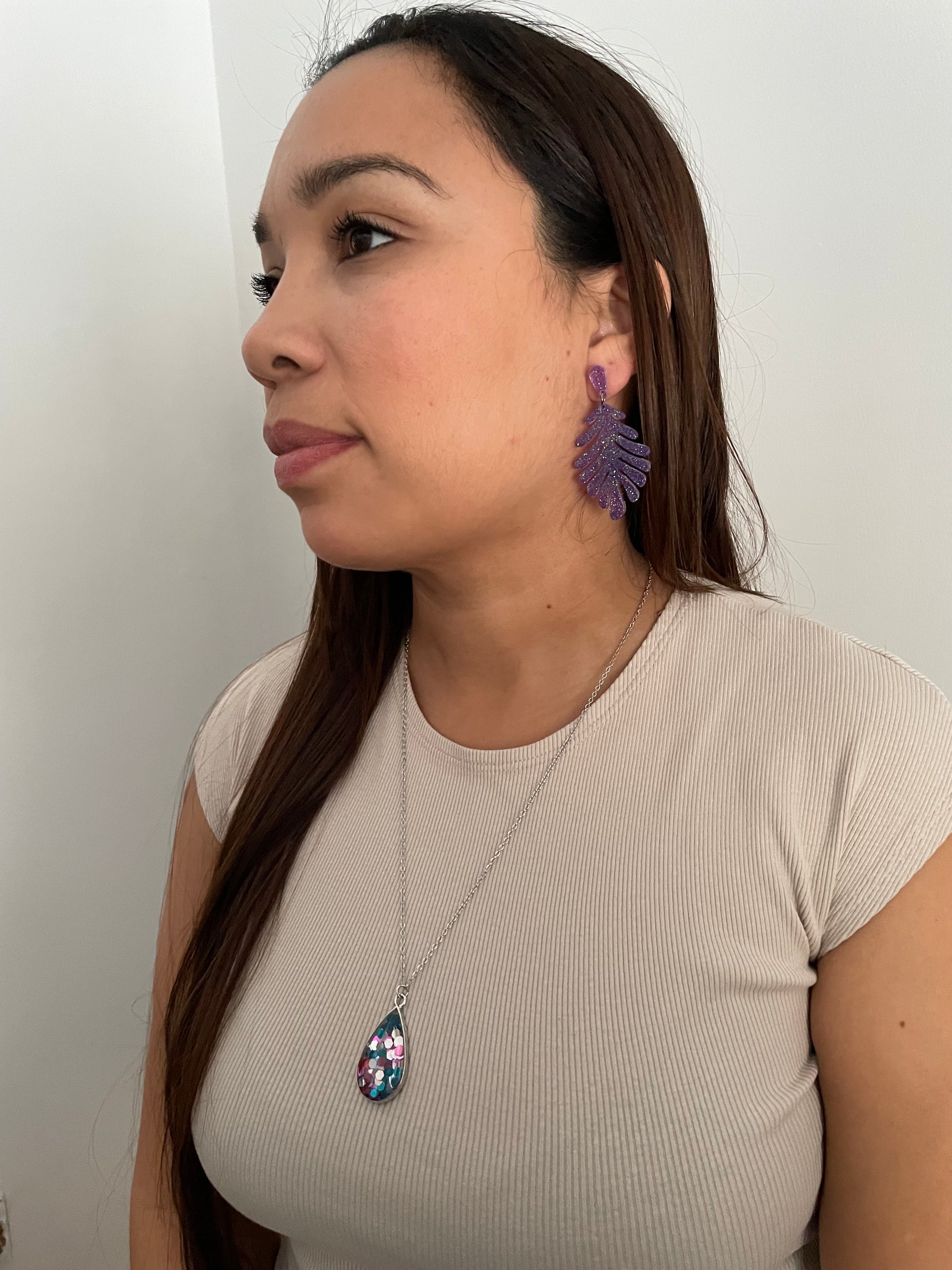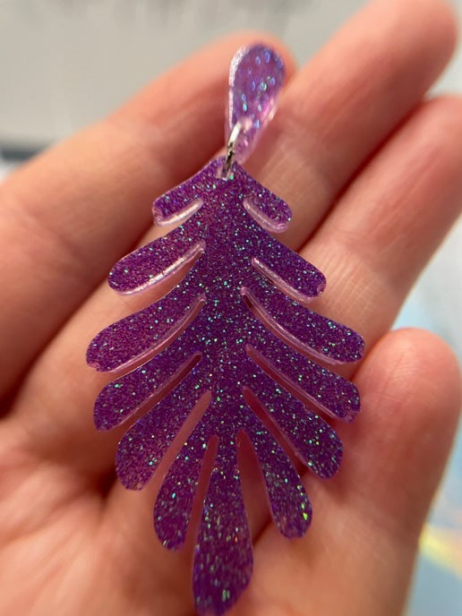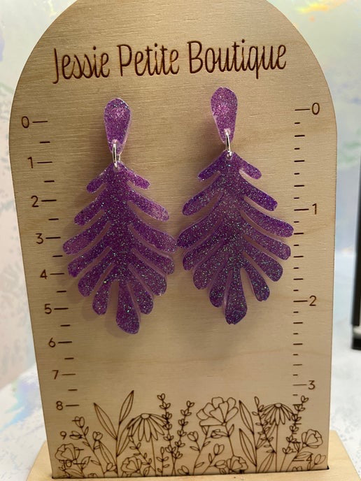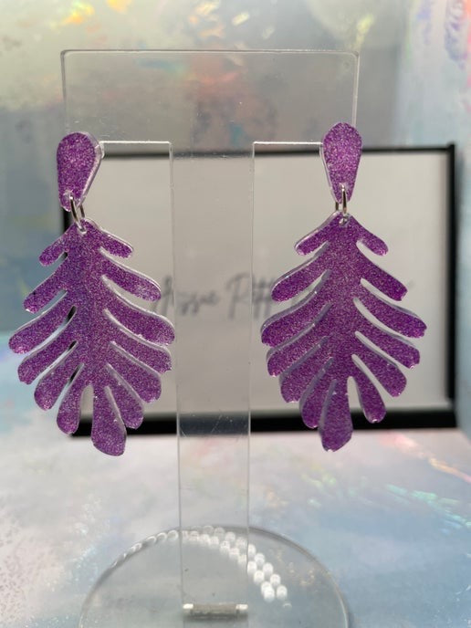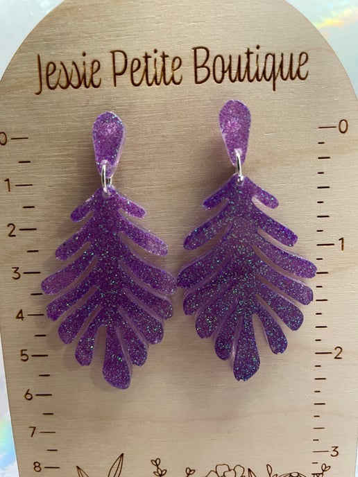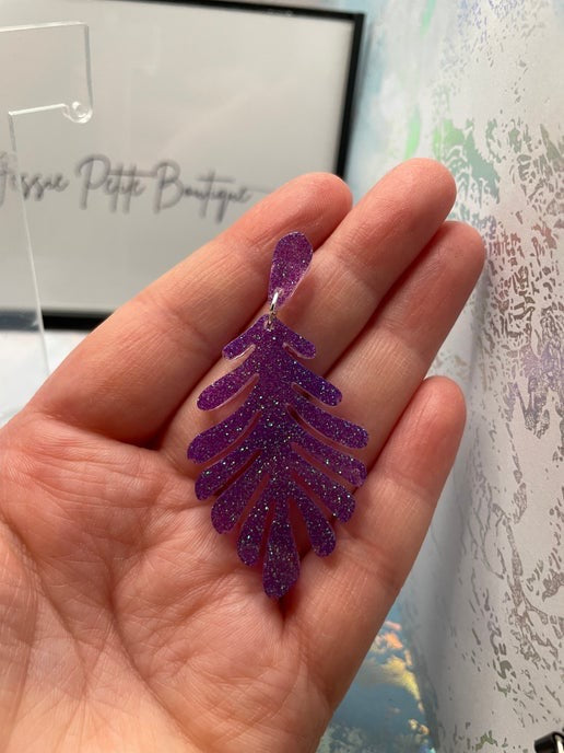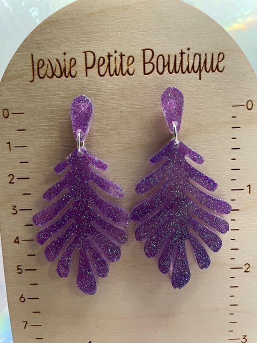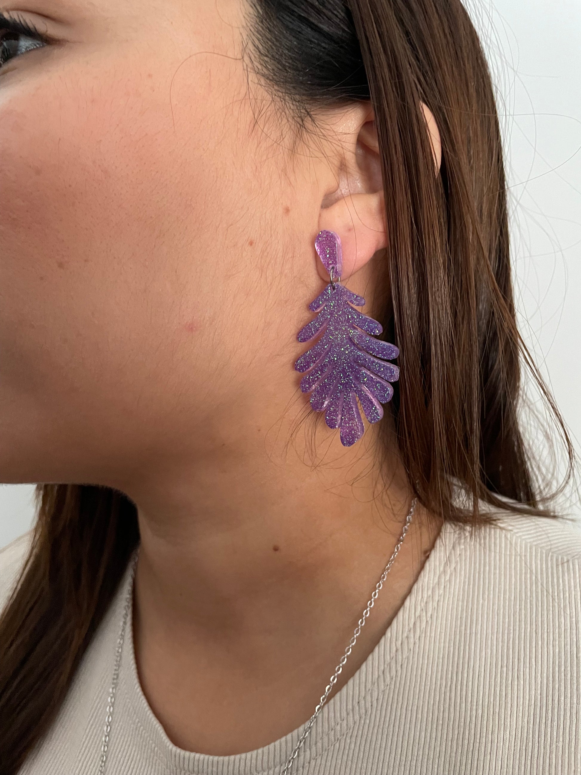 Add a vibrant touch to your jewelry collection with the Sparkle Purple Caroline Earrings. These lightweight, hypoallergenic earrings feature a unique organic leaf shape with an enchanting purple glitter finish, perfect for those who love a bit of sparkle. Crafted from resin and finished with a plastic stud and butterfly closure, these earrings are designed for comfort and are ideal for sensitive skin.