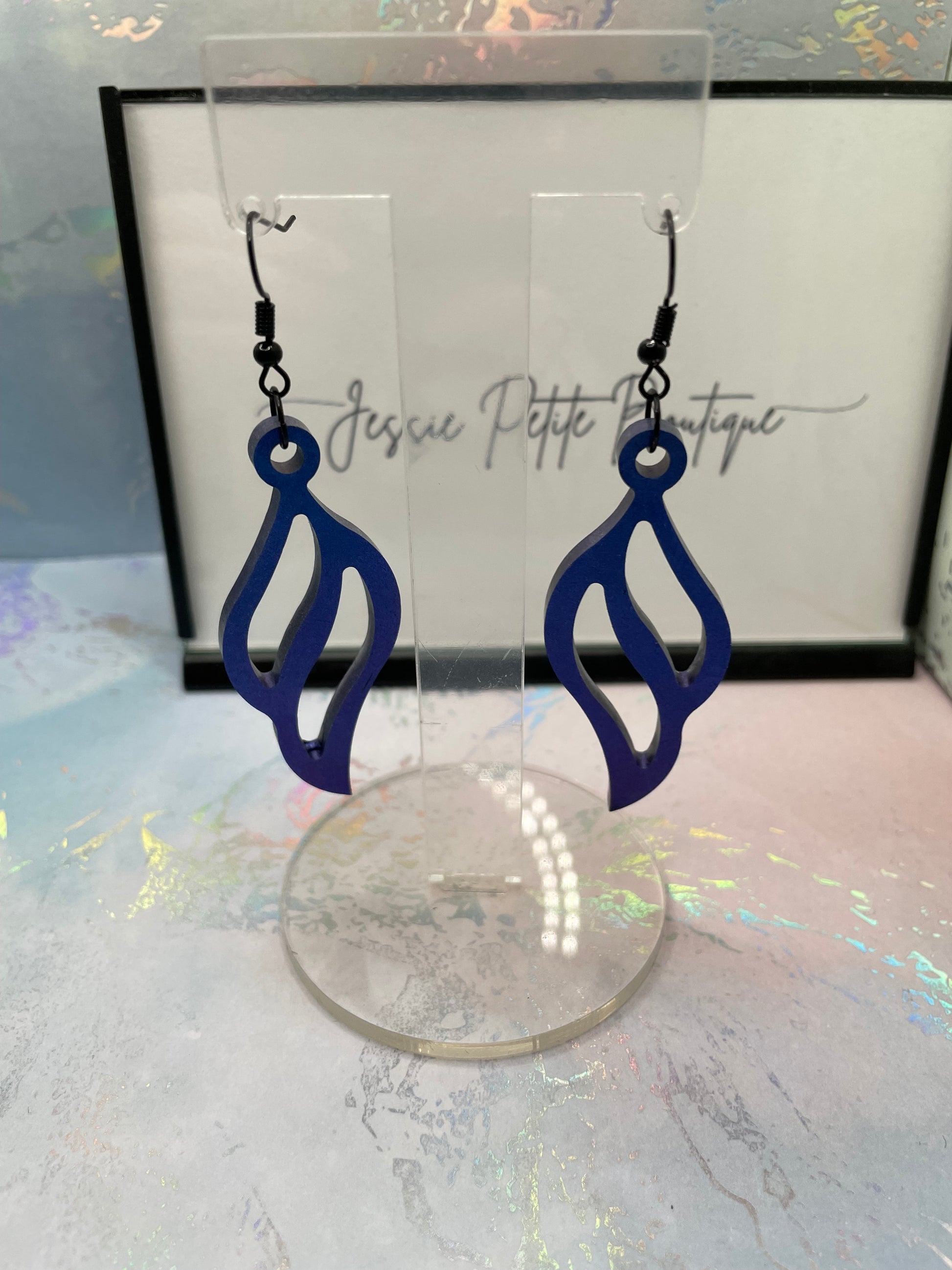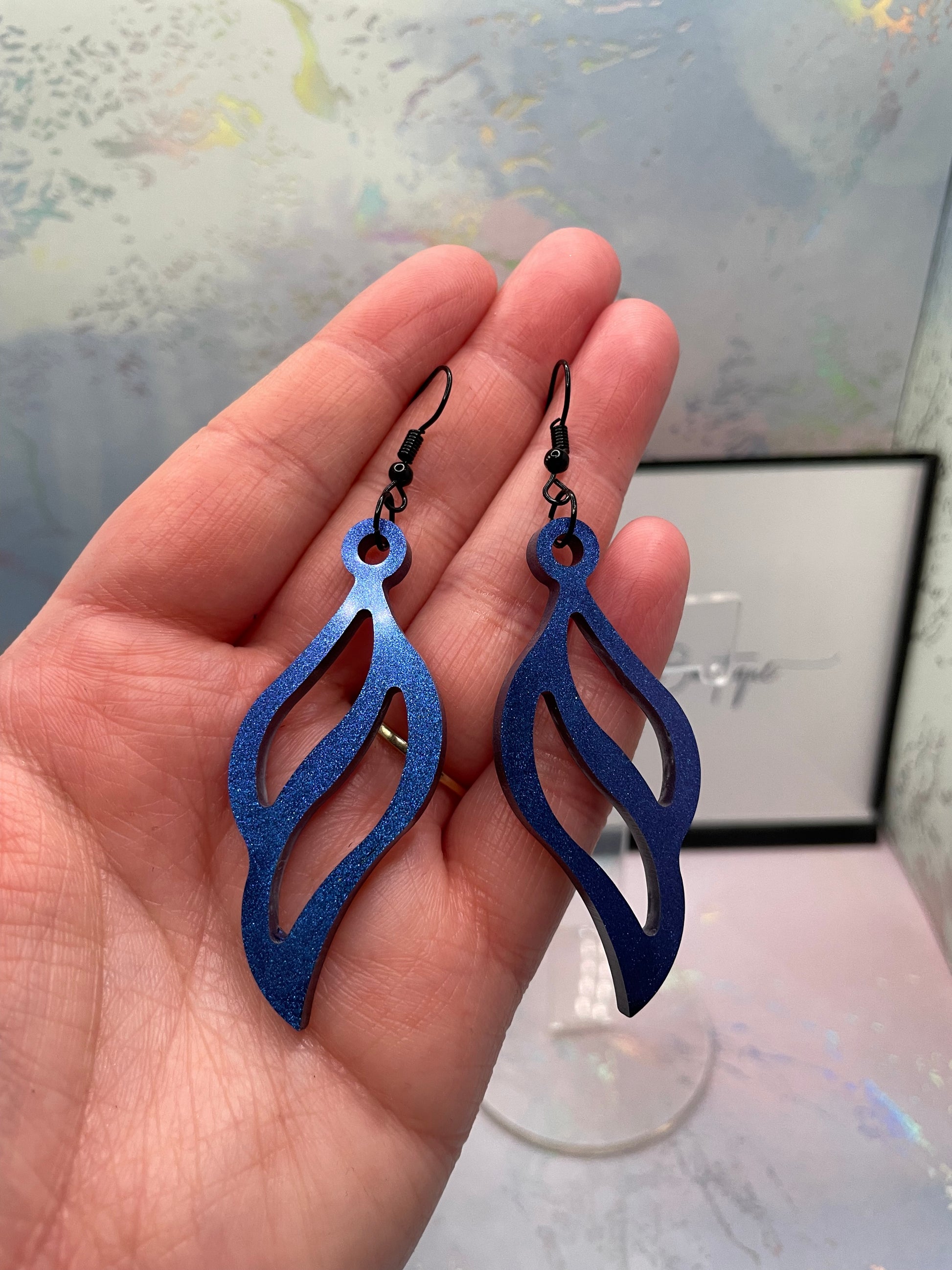 These earrings are perfect for adding a touch of luxury and uniqueness to your jewelry collection. The chameleon blue finish gives them a captivating, ever-changing glow, while the interlocking shape adds a modern and stylish flair.