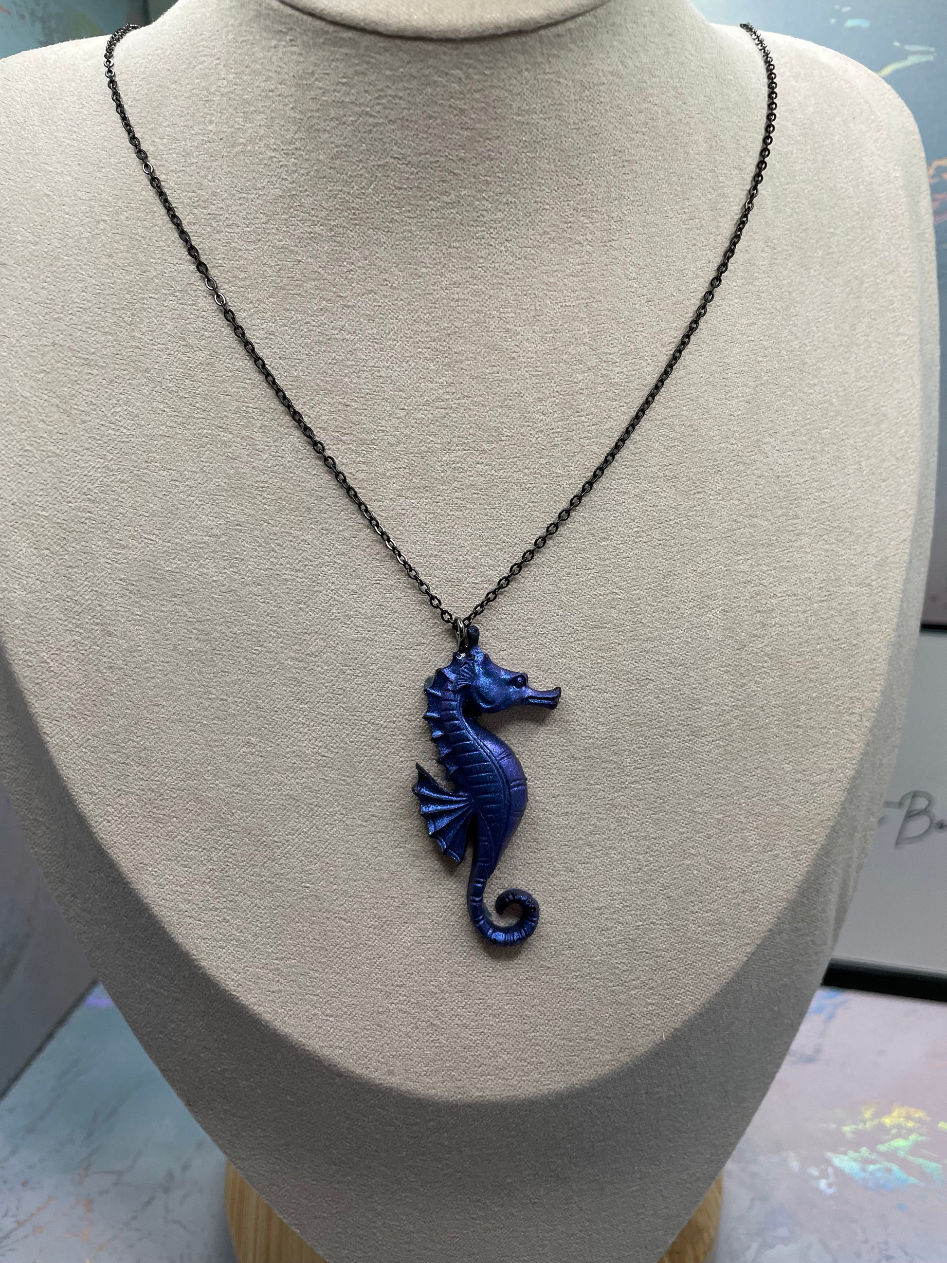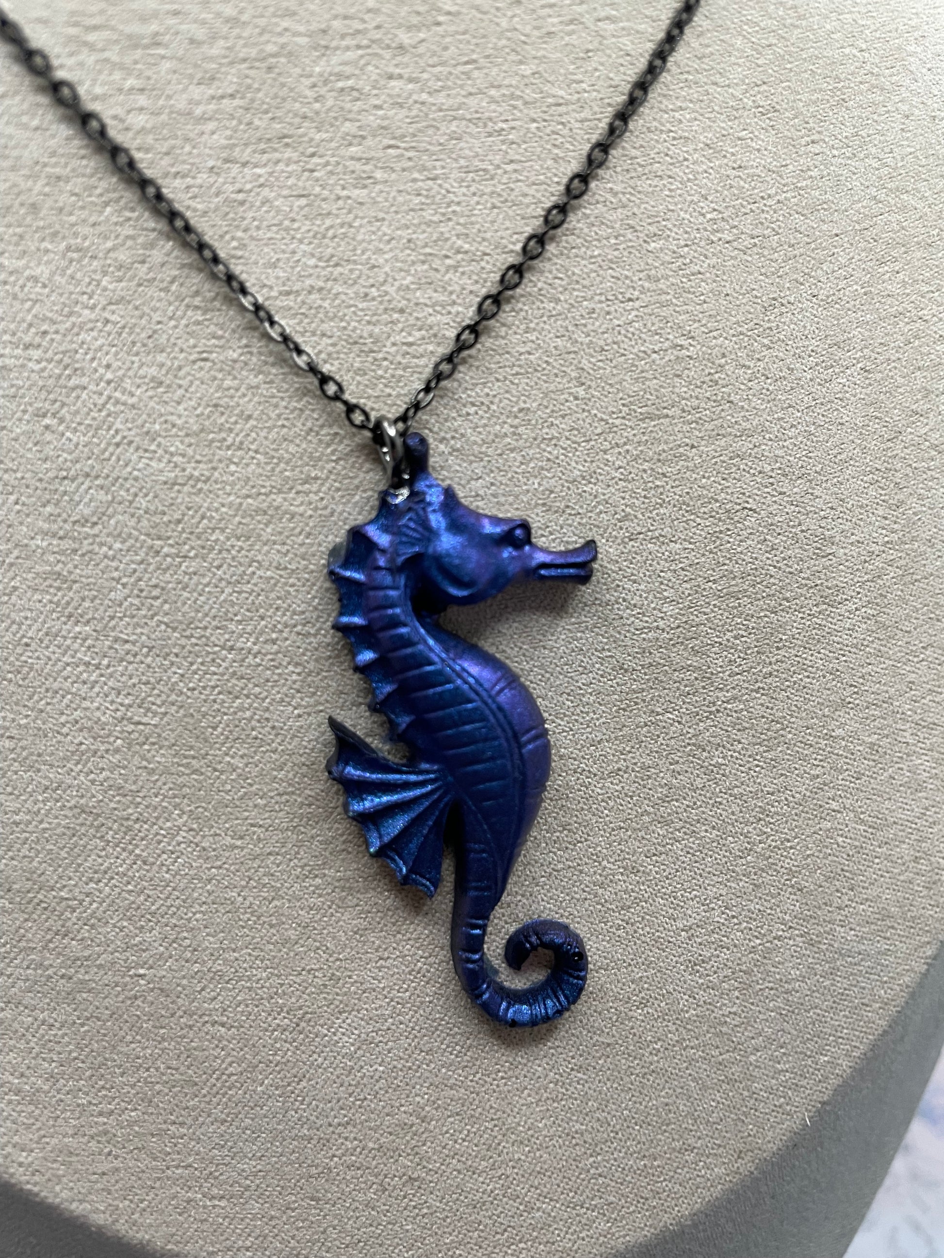 This enchanting necklace showcases a shimmering chameleon blue seahorse pendant, perfect for lovers of ocean-inspired jewelry. The iridescent finish of the seahorse offers a mesmerizing effect, changing colors under different lighting.