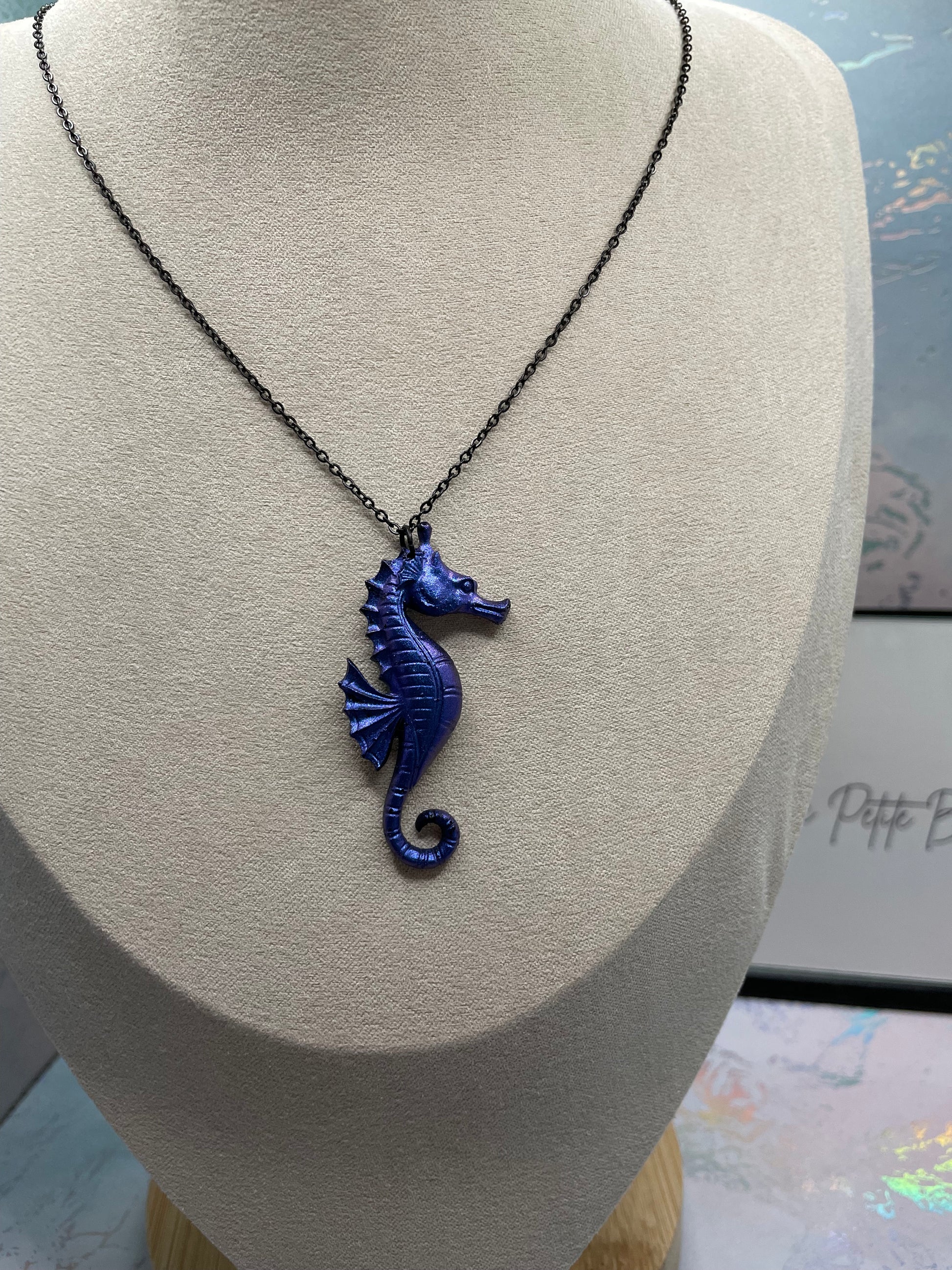 This enchanting seahorse pendant, handcrafted in mesmerizing chameleon blue, captures the essence of elegance and whimsy. Made with high-quality resin and mica powder, the iridescent hues shift beautifully in the light. Paired with a sleek nickel-free black chain and a secure lobster claw closure, this necklace is lightweight and perfect for everyday wear or special occasions.