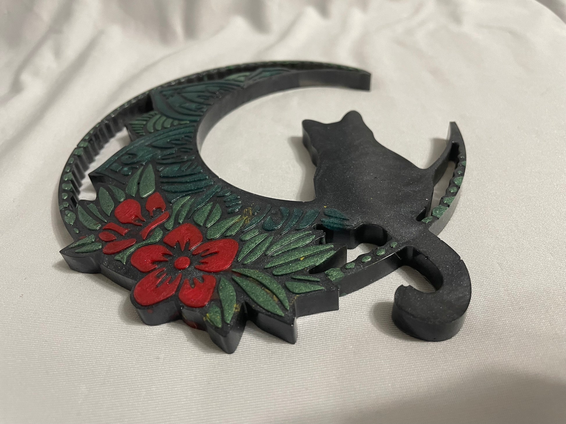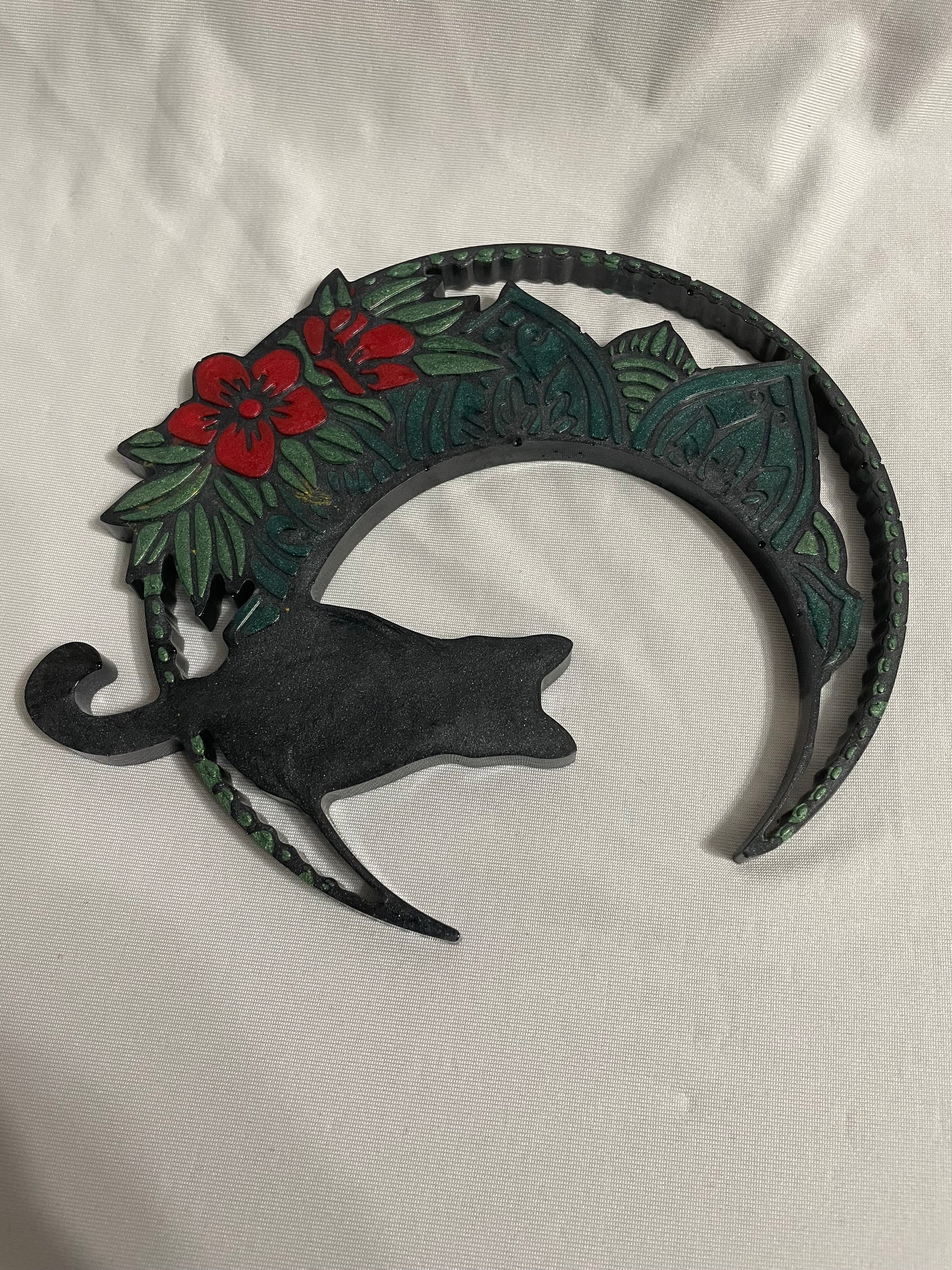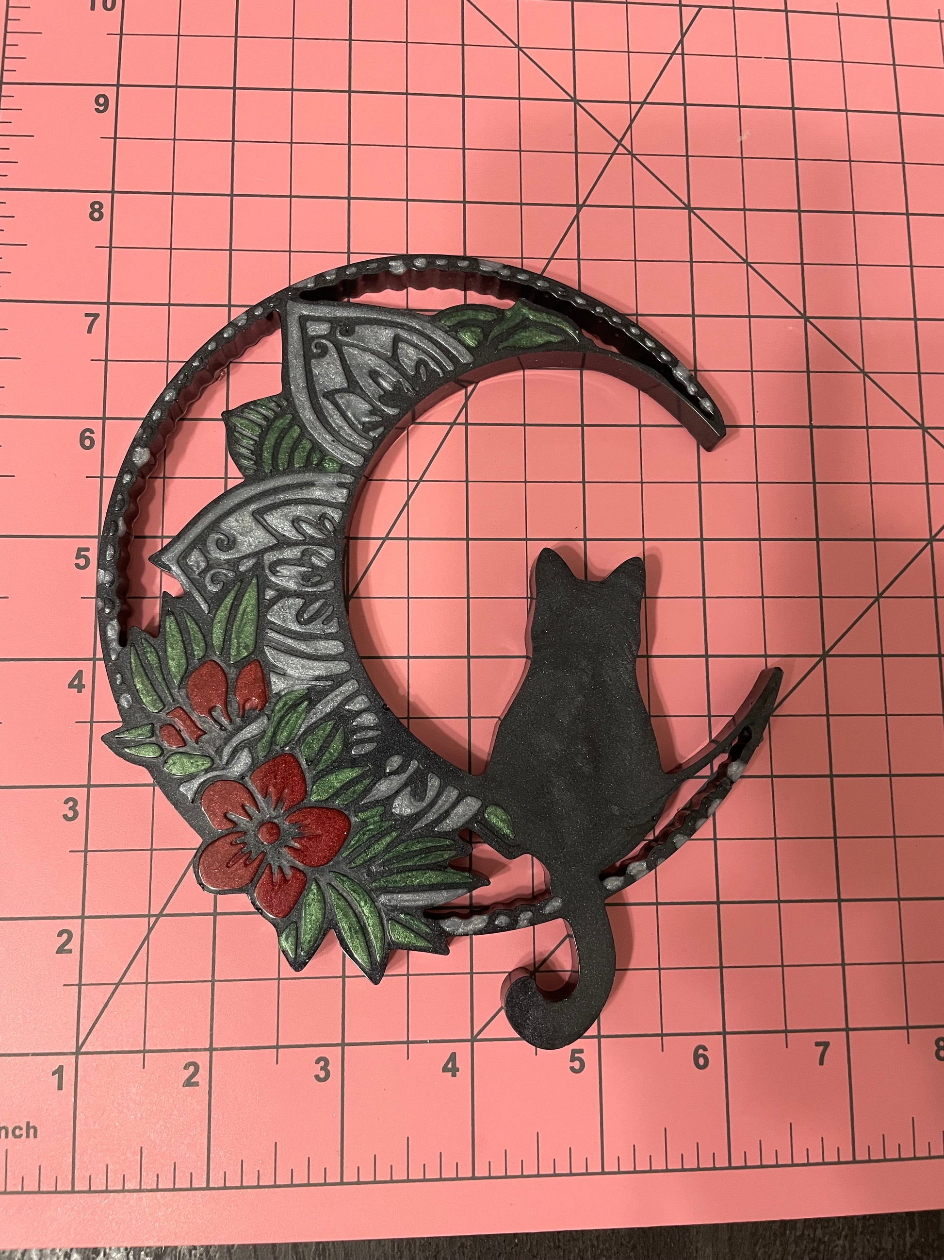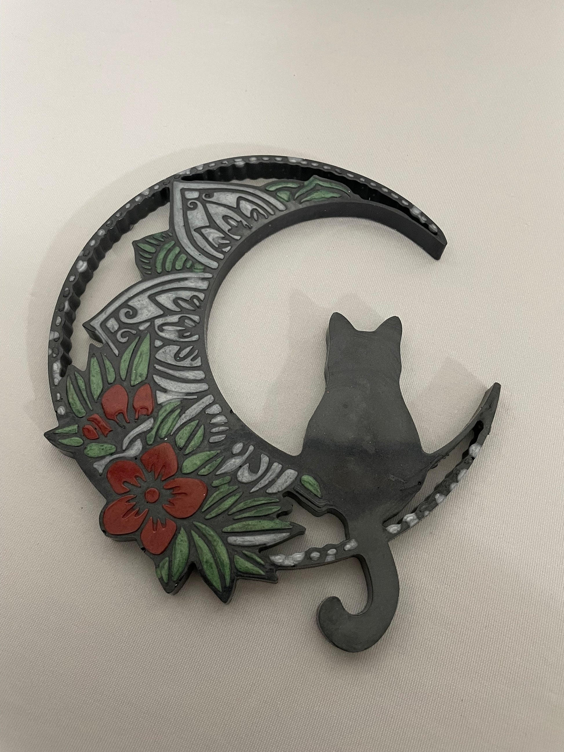 Let your walls reflect your love for the moon, flowers, and feline grace with this one-of-a-kind decoration.