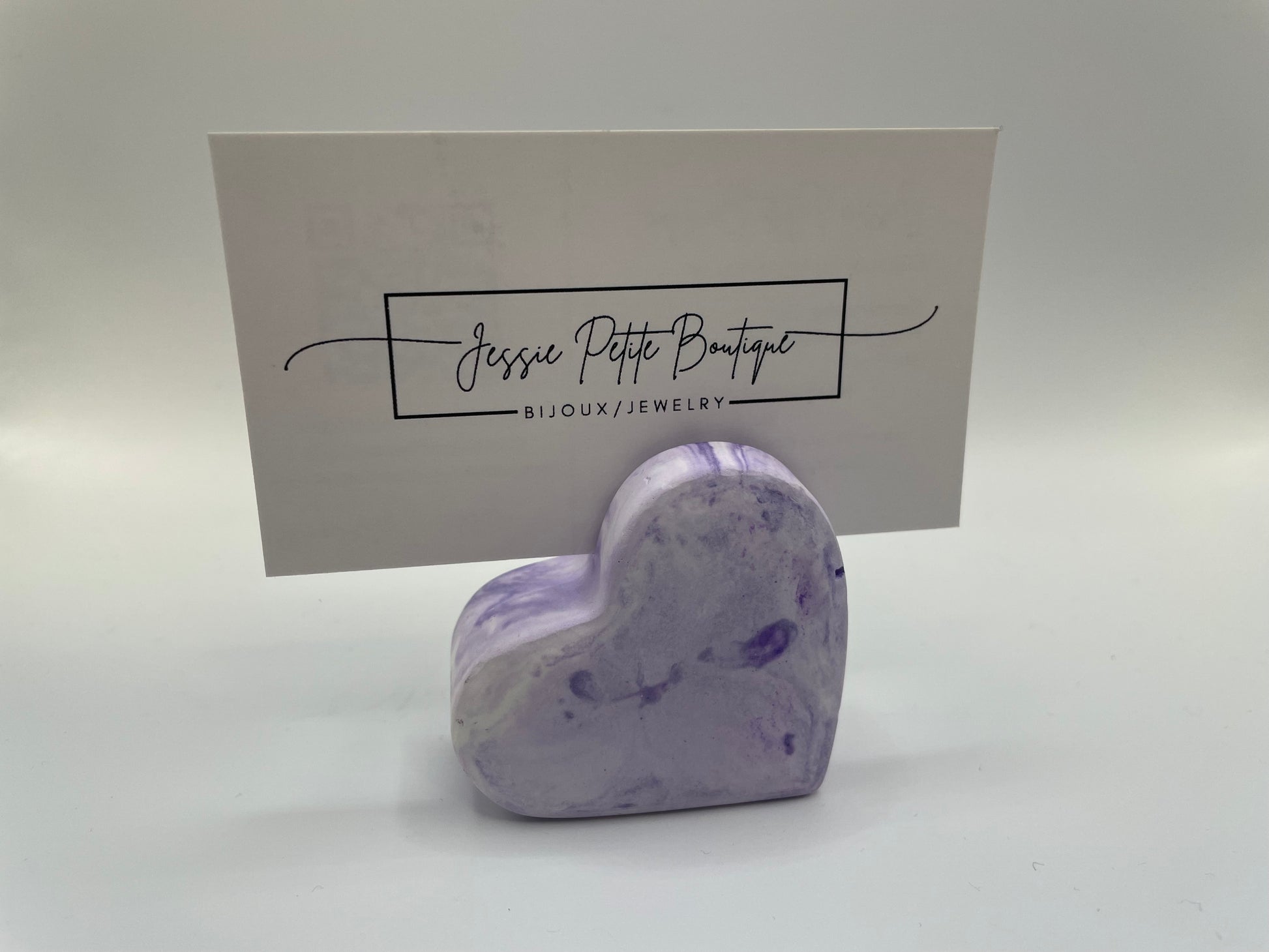 Add a touch of charm to your workspace or display with this handmade eco-resin heart card holder. Designed to hold business cards, small photos, or notes, each piece features a smooth marble-style finish with subtle swirls of color. Its compact size makes it both practical and decorative — perfect for desks, craft fairs, or boutique displays.