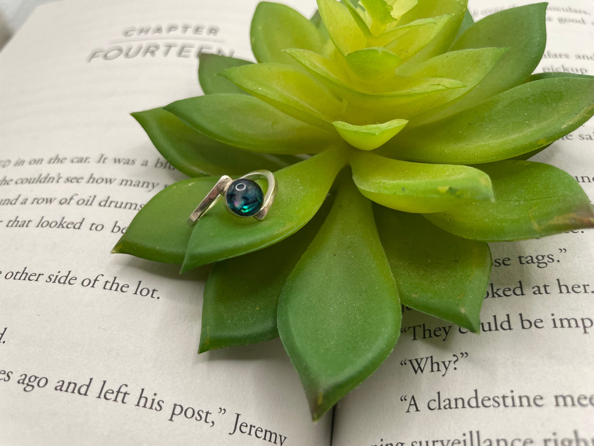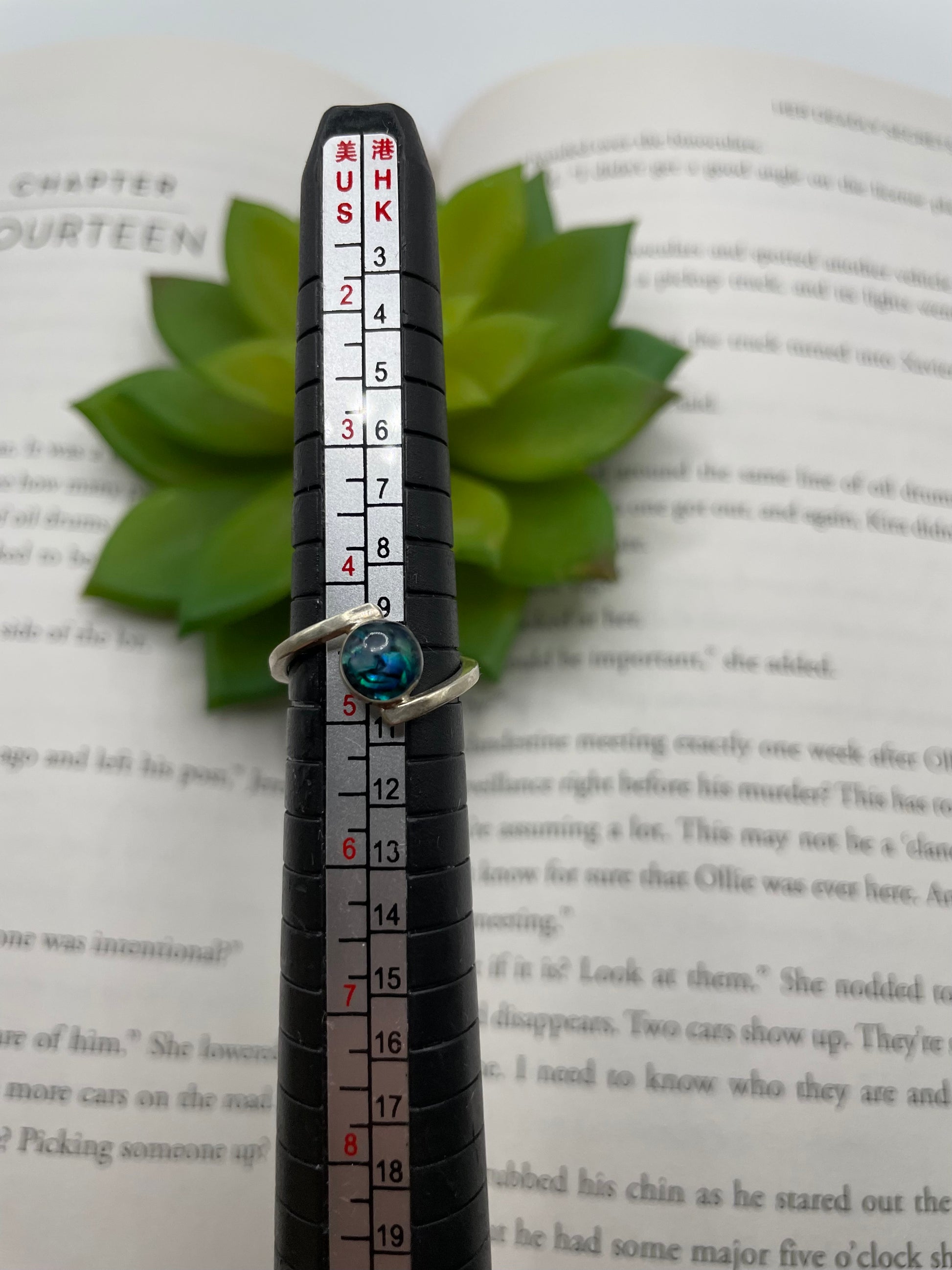 Elegant and minimalist, this 925 sterling silver ring features a small round bezel set with shell in resin, revealing deep shades of blue and green with natural iridescent highlights. Its open, delicate band makes it comfortable and refined — perfect for subtle everyday wear or stacking with other rings.