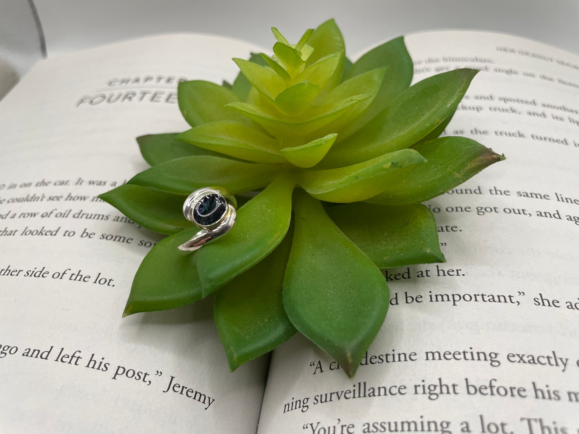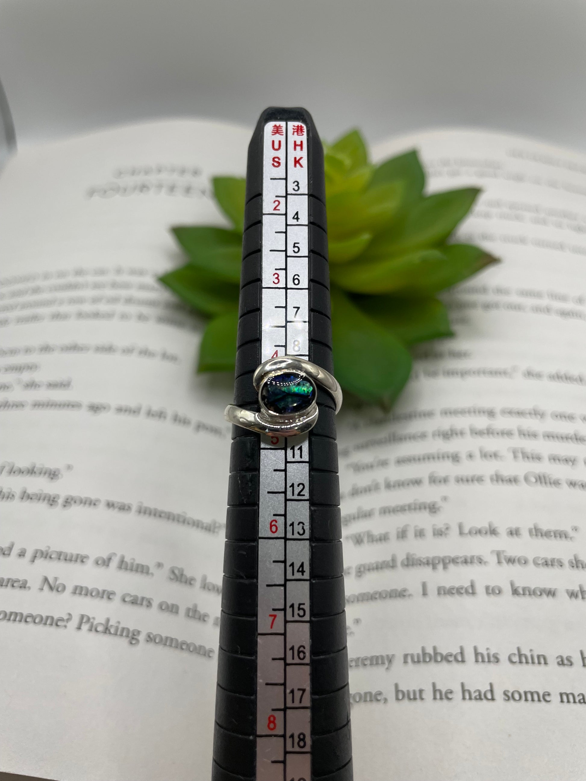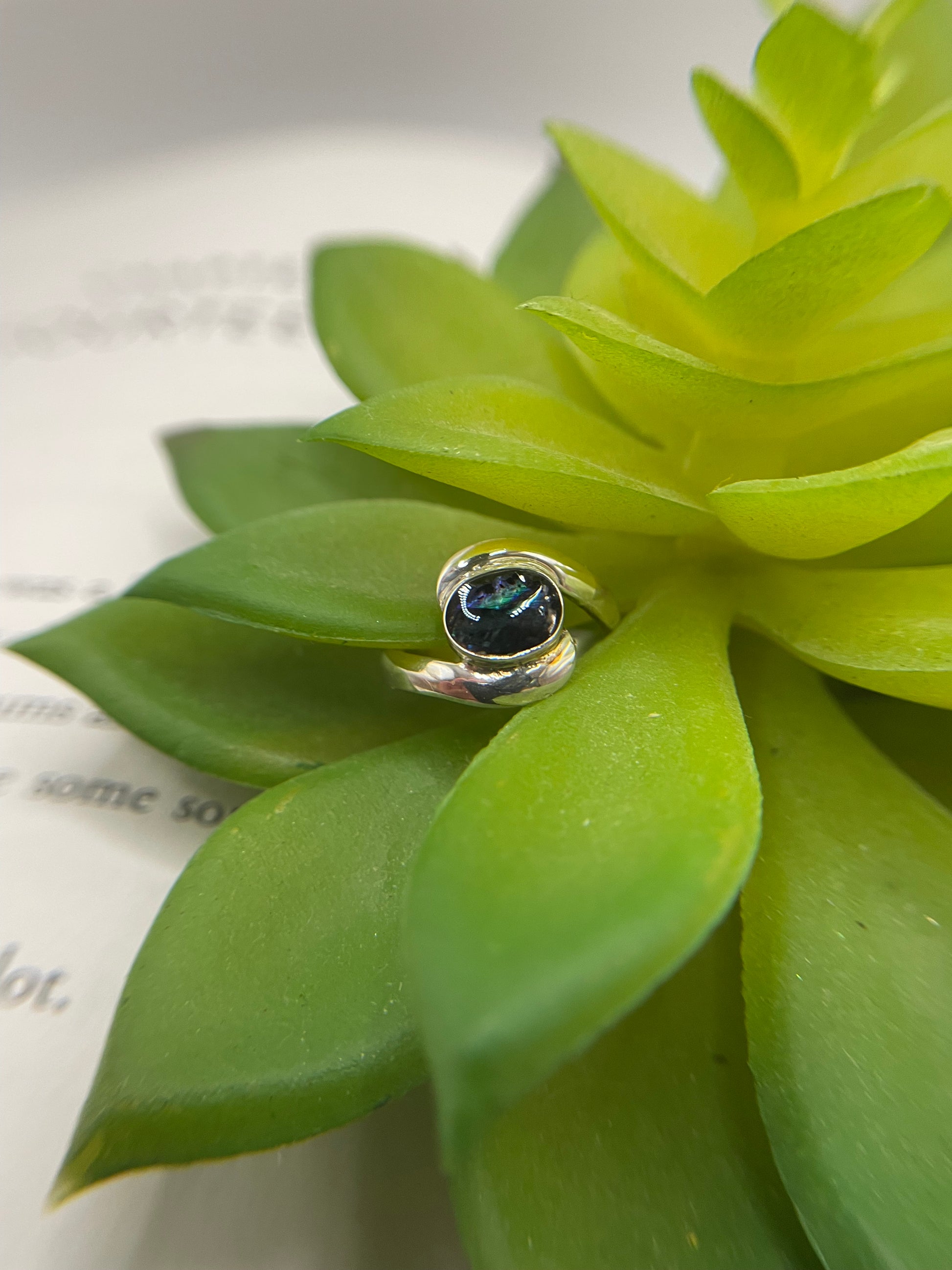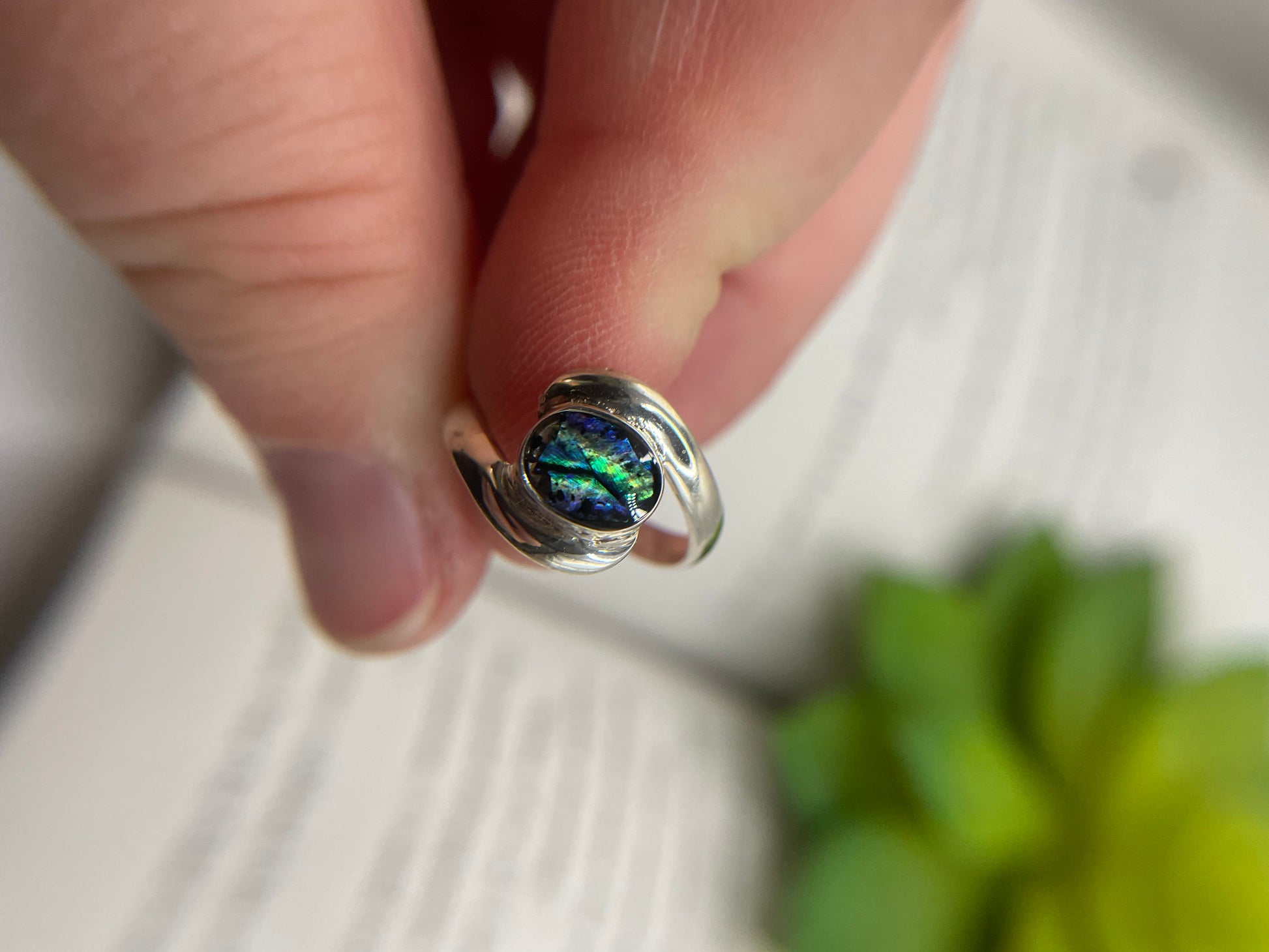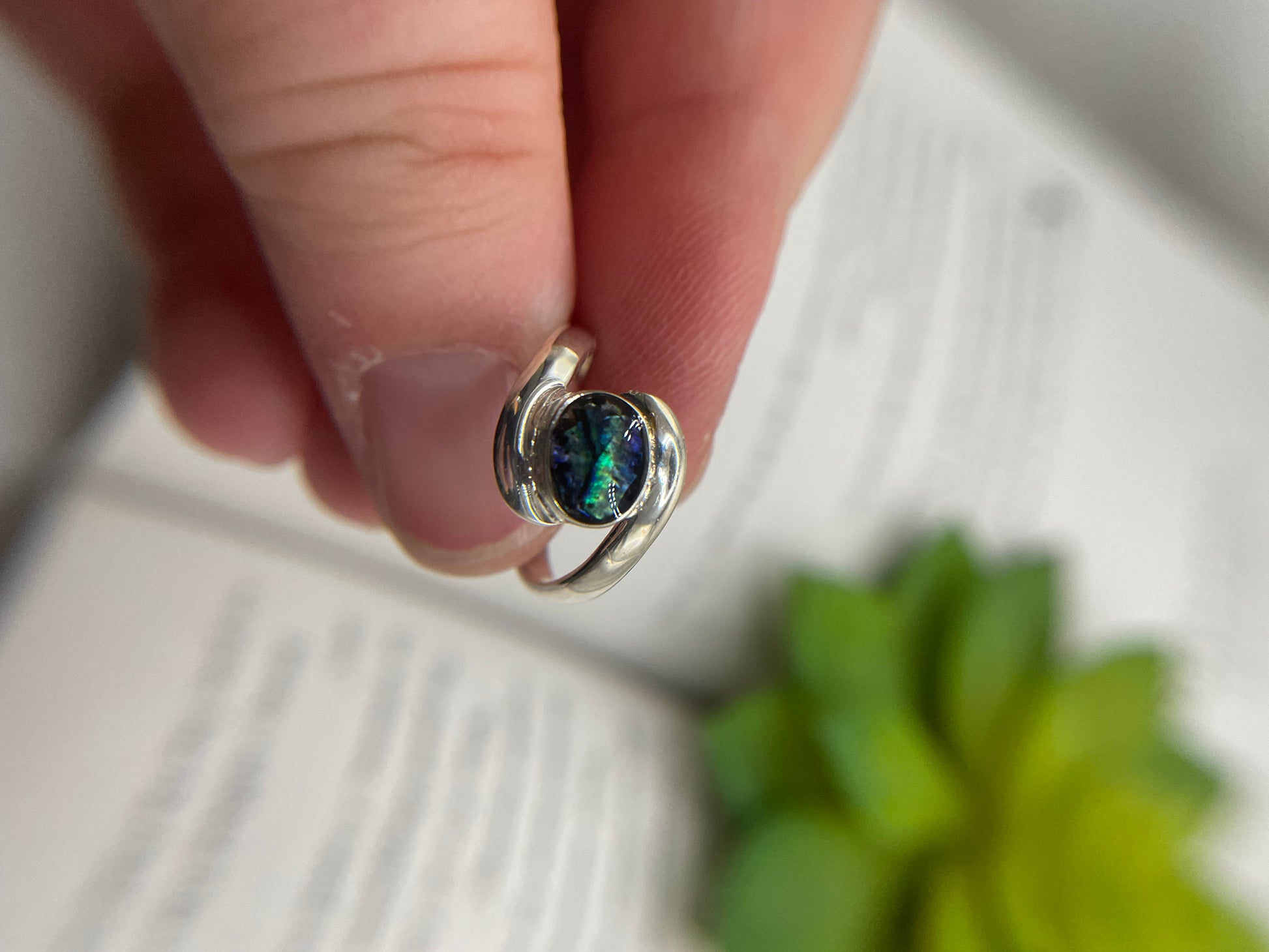 This elegant 925 sterling silver ring showcases a 5×7 mm oval bezel filled with shell in resin, revealing shimmering tones of green, blue, and purple. The smooth, curved band embraces the cabochon in a graceful wave-like design, offering both comfort and timeless style.