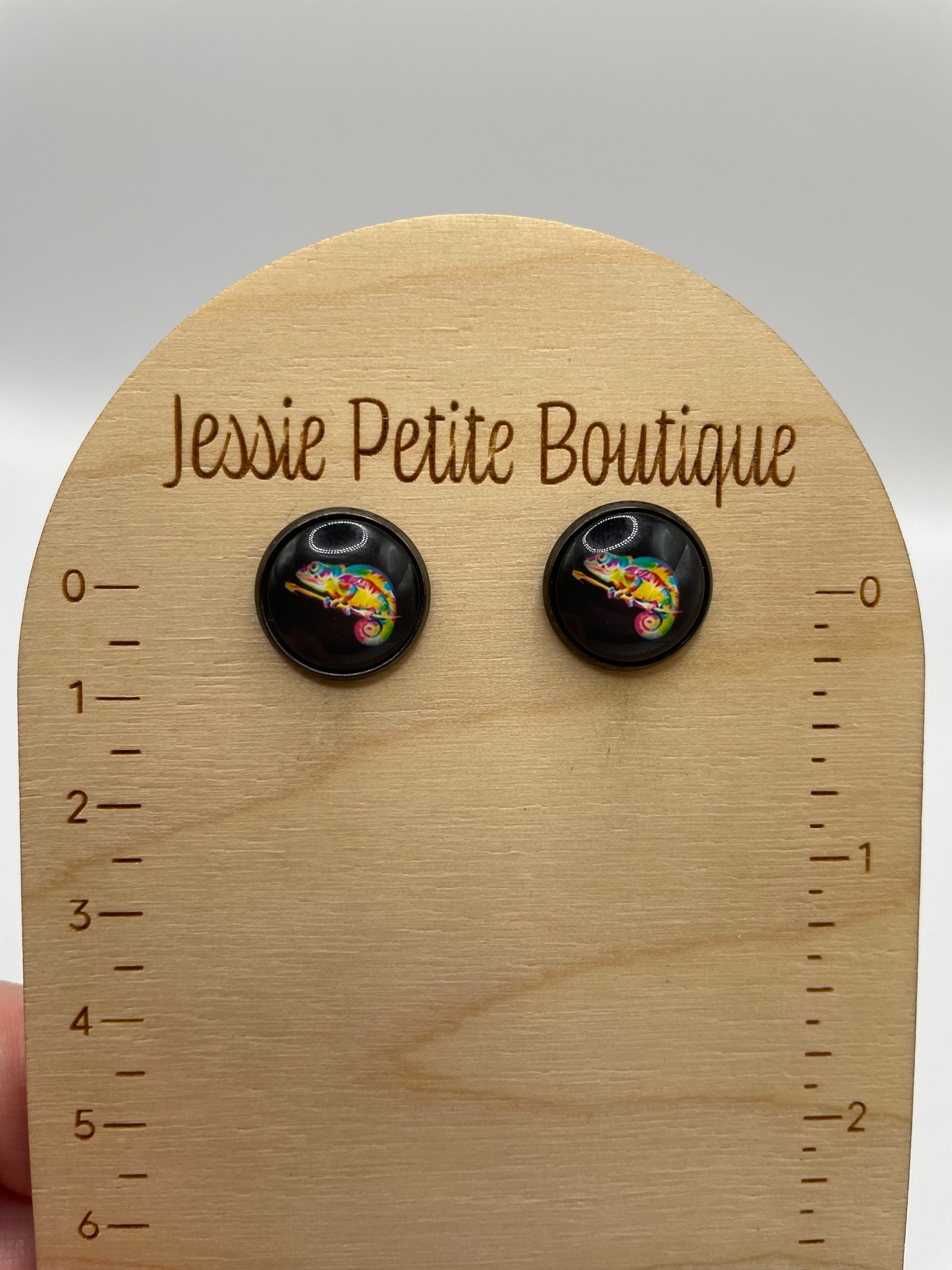 Crafted from nickel-free +stainless steel, these earrings feature a 15 mm glass cabochon with a vibrant rainbow chameleon design on a black background, making the colors truly pop.