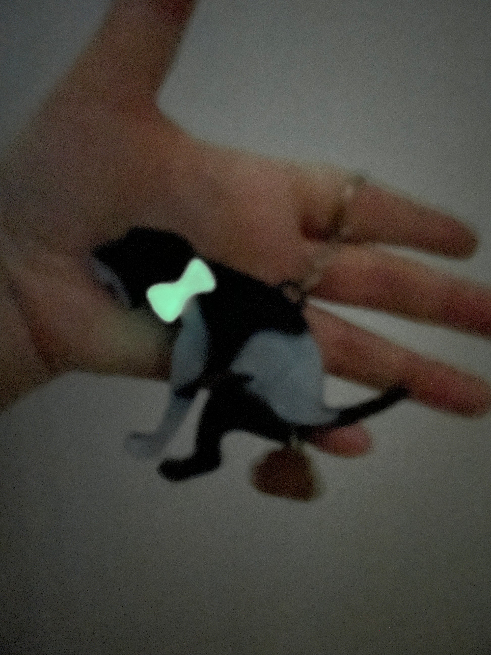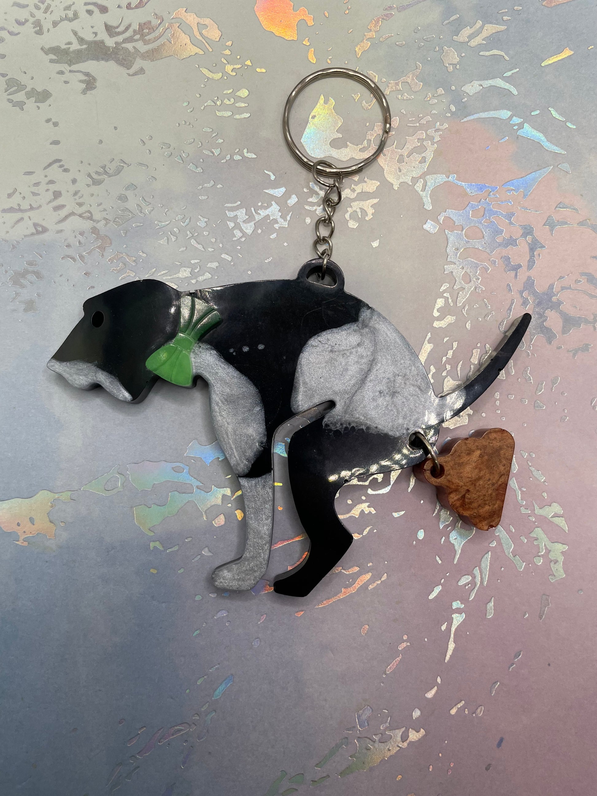 This humorous handmade dog keychain is sure to bring a smile. Featuring a playful dog silhouette with a dangling detail and a glow-in-the-dark bow tie, this piece combines quirky charm with careful craftsmanship. Made from resin and mica powder, it has a smooth, durable finish while remaining lightweight for everyday use.