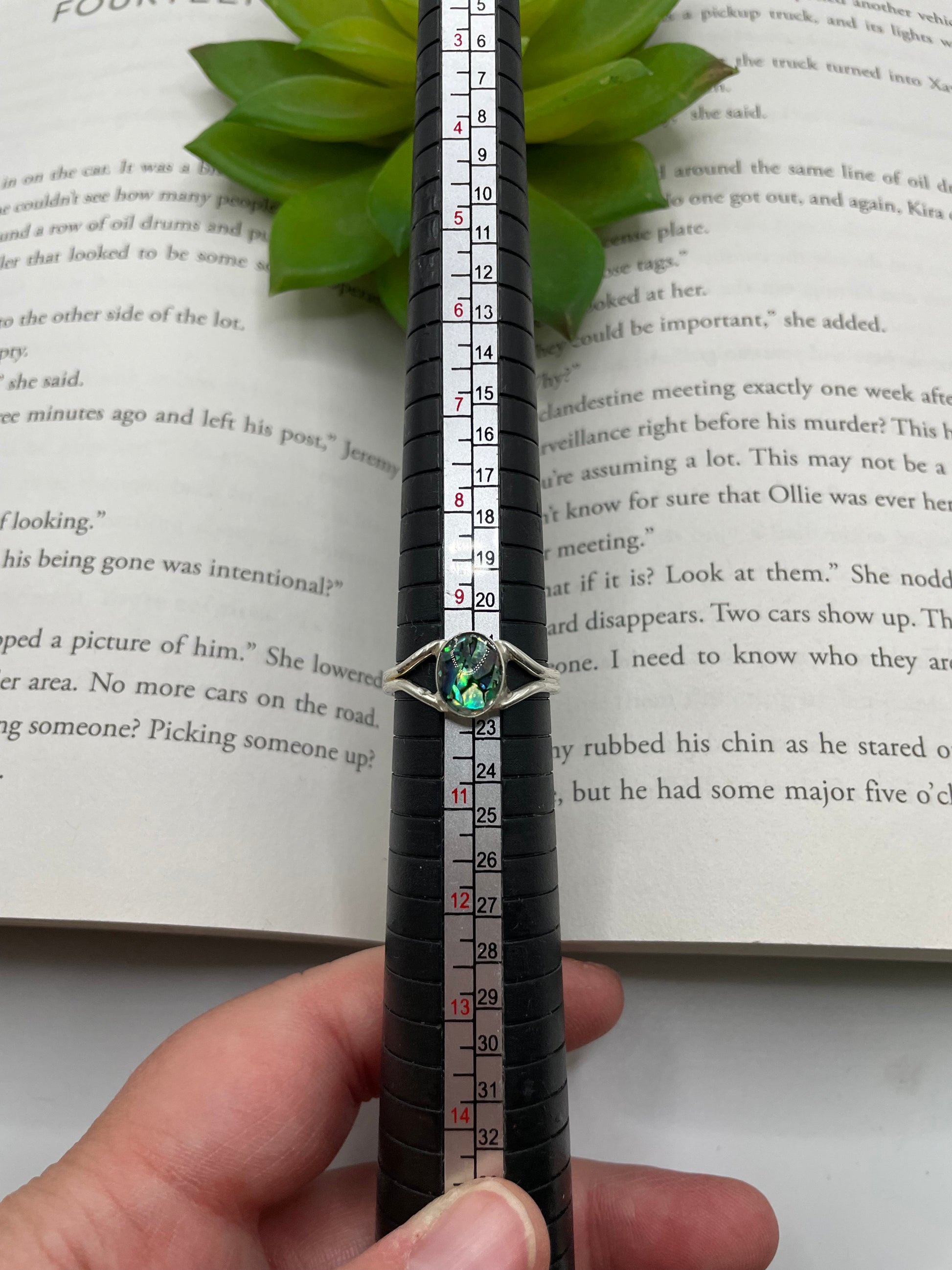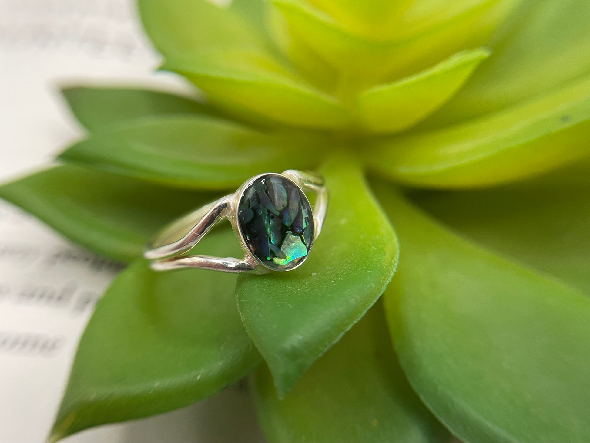 Elegant and timeless, this 925 sterling silver ring features a 7 × 10 mm oval bezel filled with shell in resin, revealing mesmerizing shades of green, turquoise, and blue.