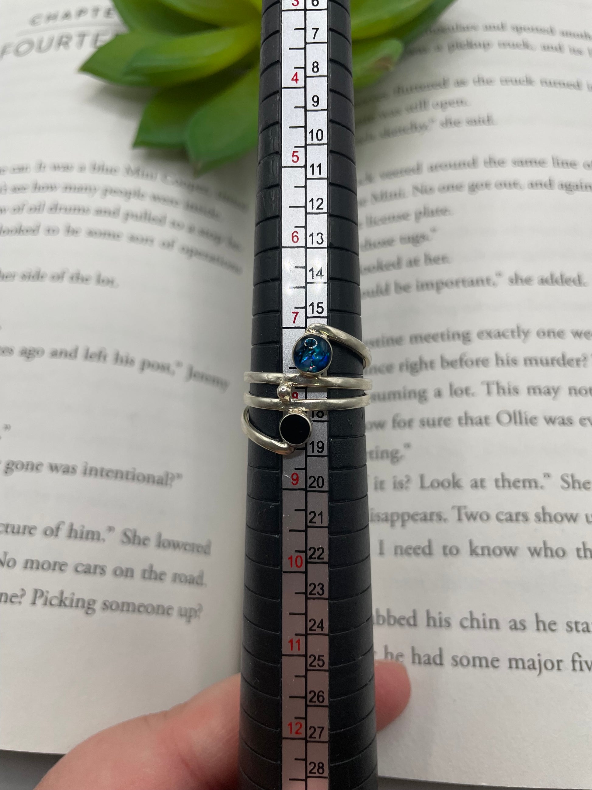 This elegant 925 sterling silver ring features a stunning contrast between two round bezels — one 4 mm black resin with a subtle shimmer and one 5 mm blue shell encased in clear resin.