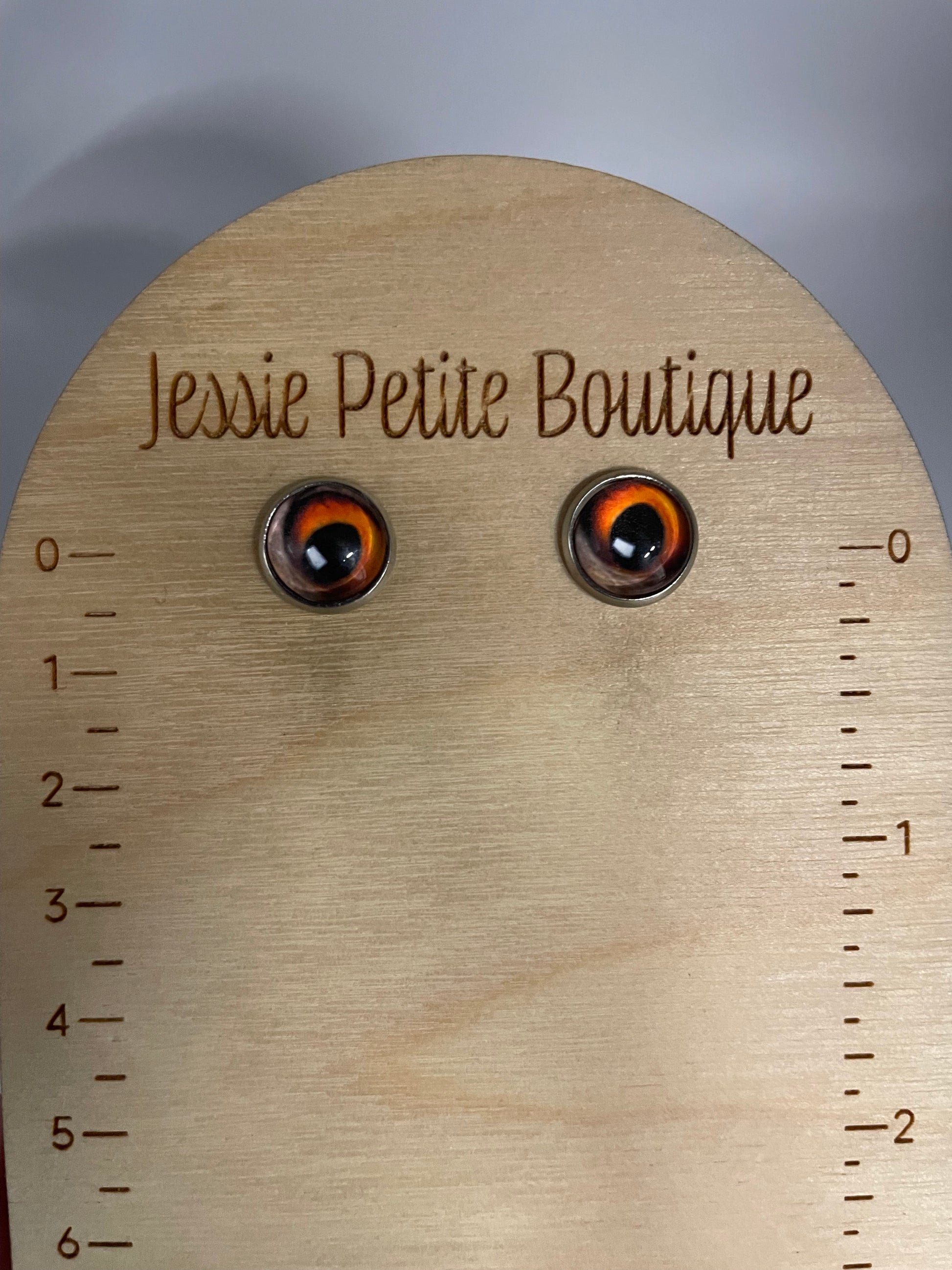 Bold and mesmerizing, these glass cabochon stud earrings feature a vivid orange and black “fiery eye” design that captures attention with its lifelike depth and glossy finish. Perfect for those who love unique, statement pieces with a touch of mystery and creativity.