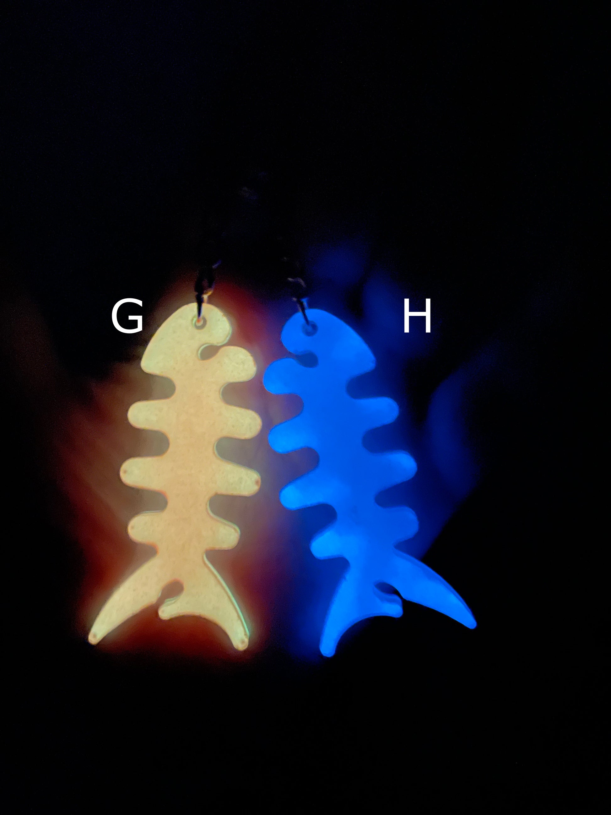 This handmade fish skeleton keychain is crafted from resin and finished with mica powder and glitter for a striking visual effect. Its playful skeletal fish shape is lightweight yet durable, making it a fun and eye-catching accessory for keys, bags, or backpacks.