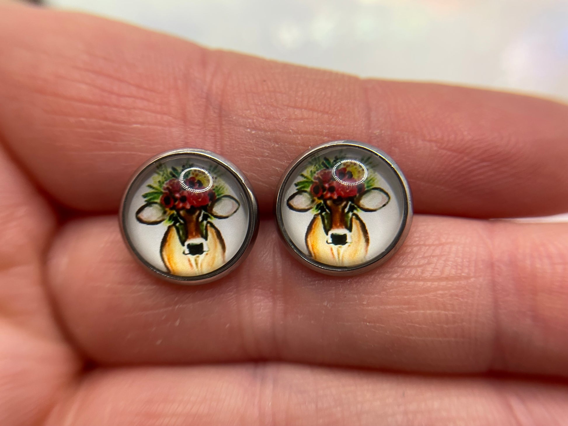 Delicate and expressive, these earrings feature a charming cow illustration adorned with a soft floral crown, captured beneath a smooth glass cabochon. Set in stainless steel, they offer a timeless and nature-inspired look while remaining lightweight and comfortable for everyday wear.