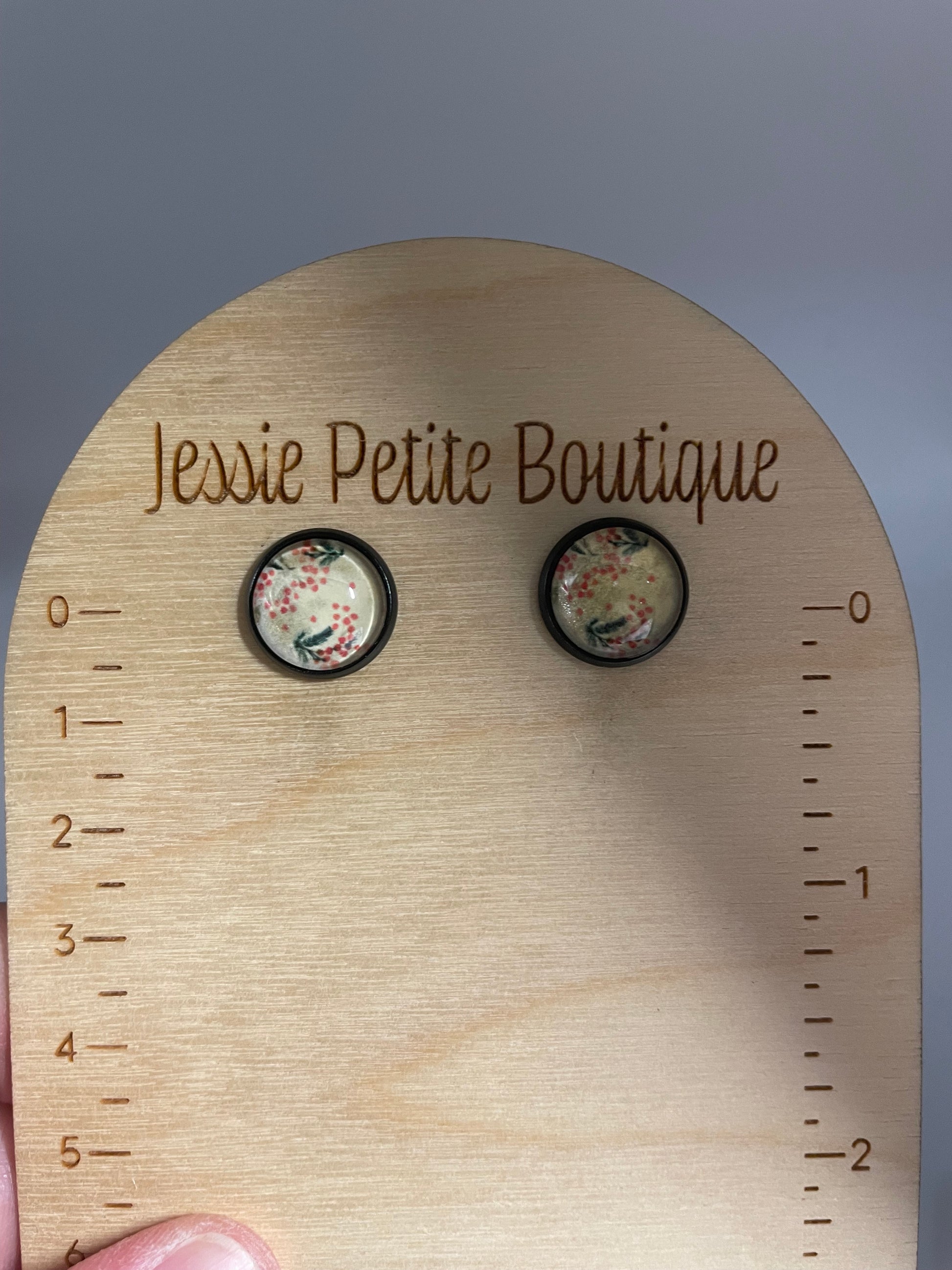 Featuring a delicate floral pattern in soft beige with coral-red blossoms and green accents, these studs bring a timeless, feminine touch to any outfit.