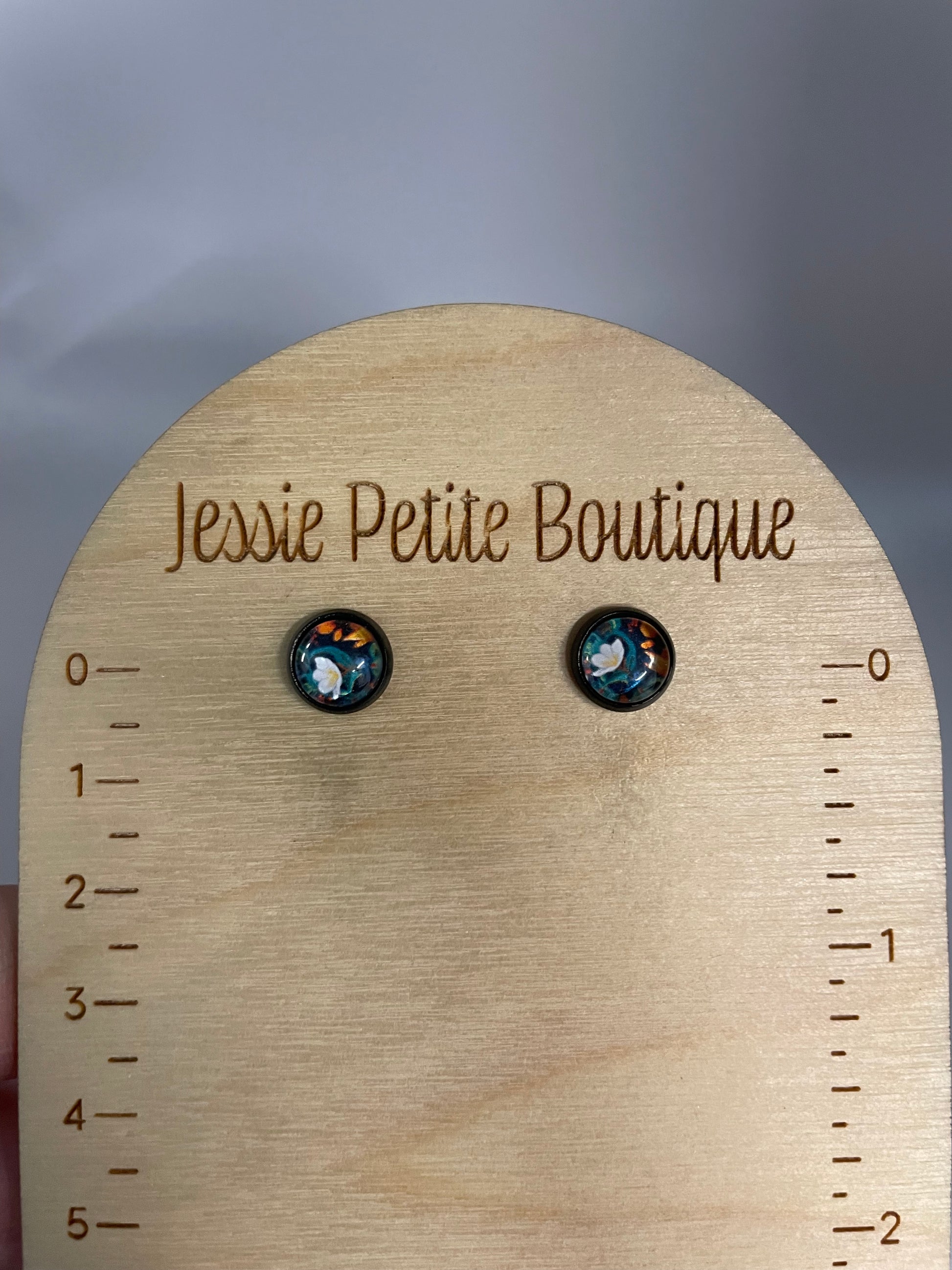 Delicate and colorful, these floral glass stud earrings bring a refined touch to your everyday look. Featuring a vivid blend of deep blue, orange, and white tones beneath a glossy glass cabochon, they’re both eye-catching and versatile — a perfect balance between elegance and creativity.