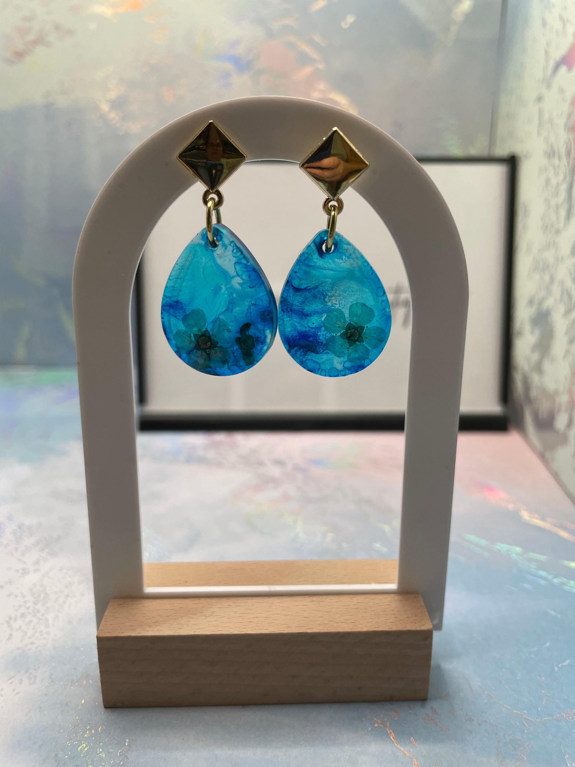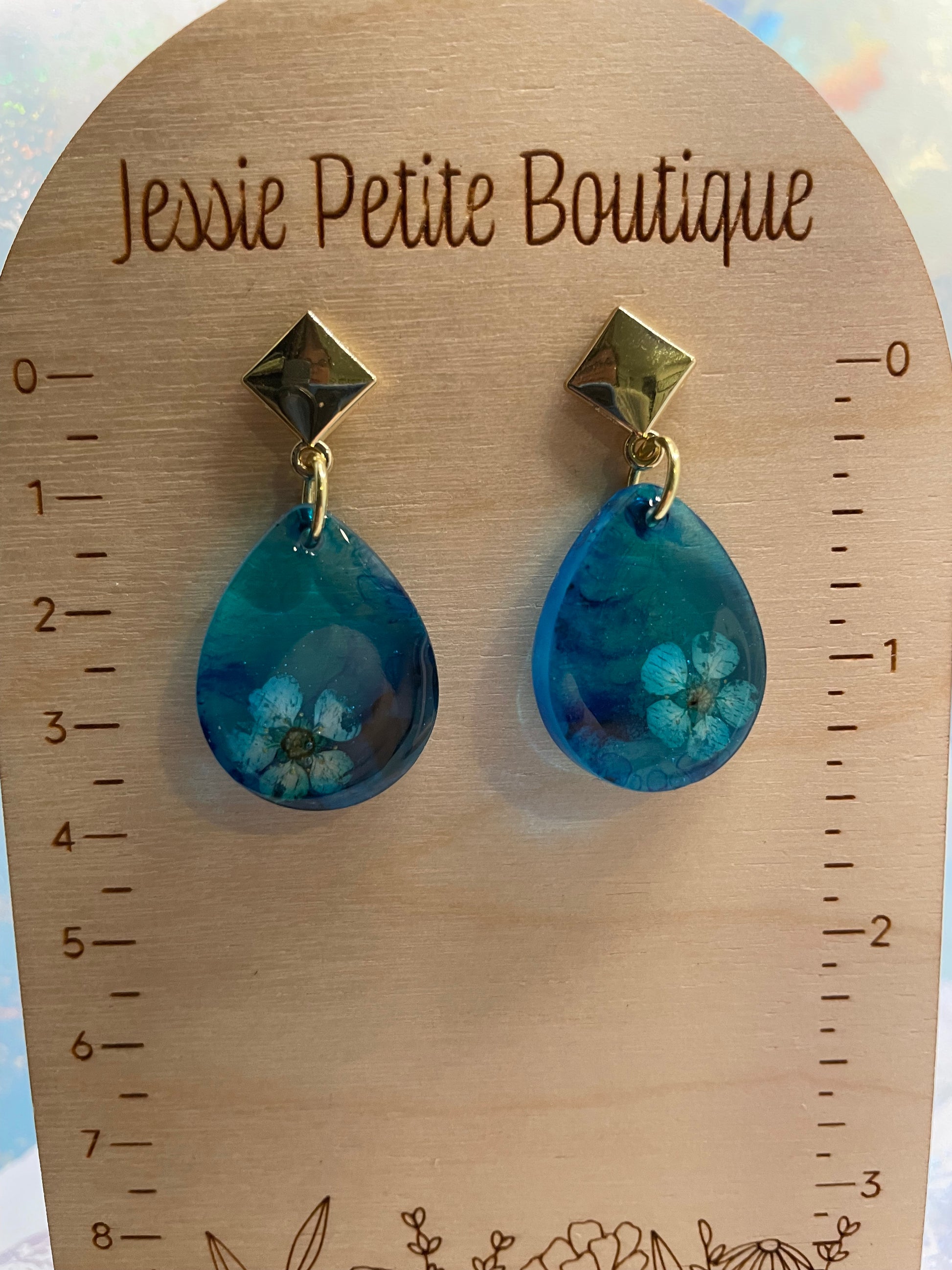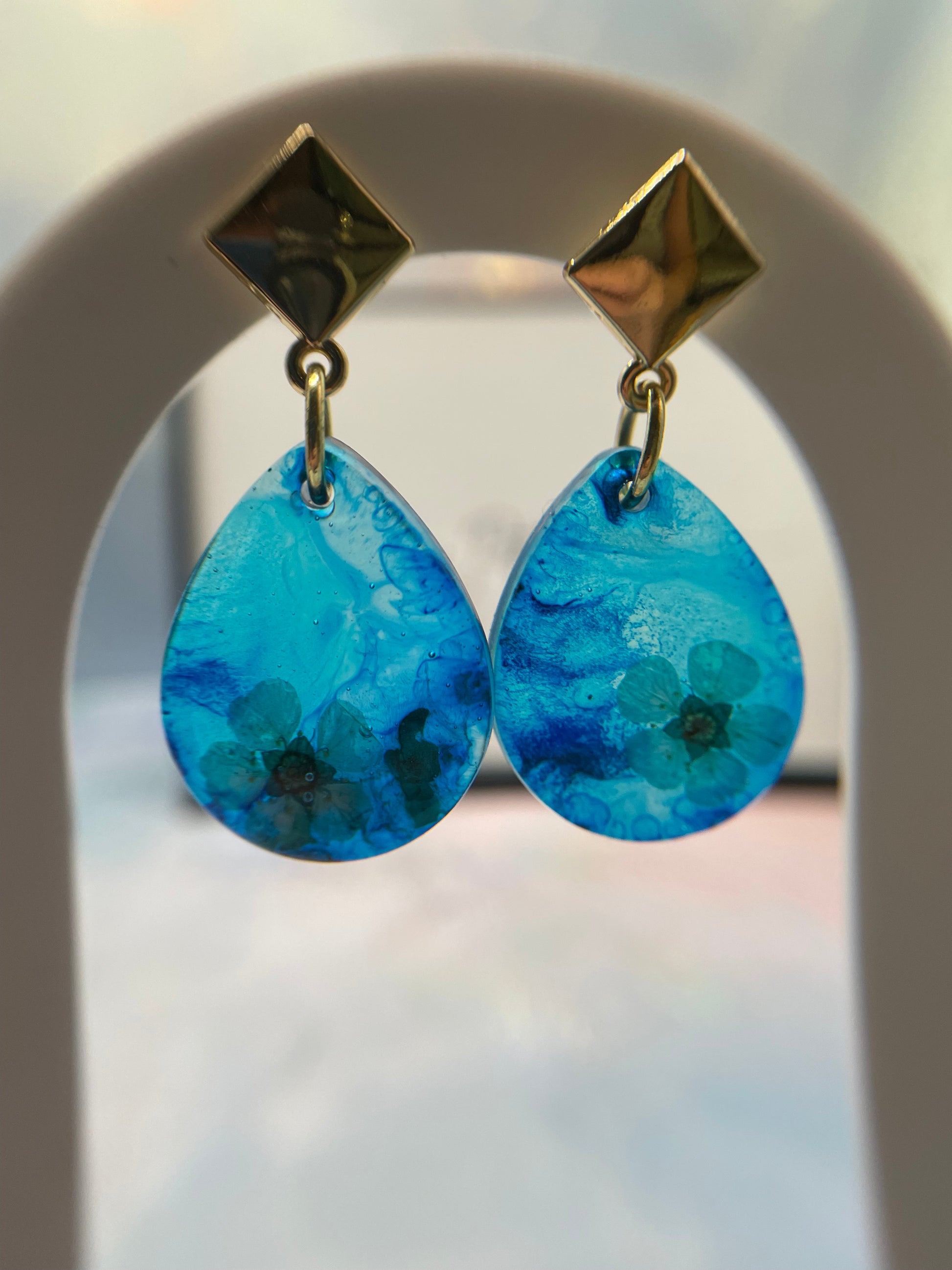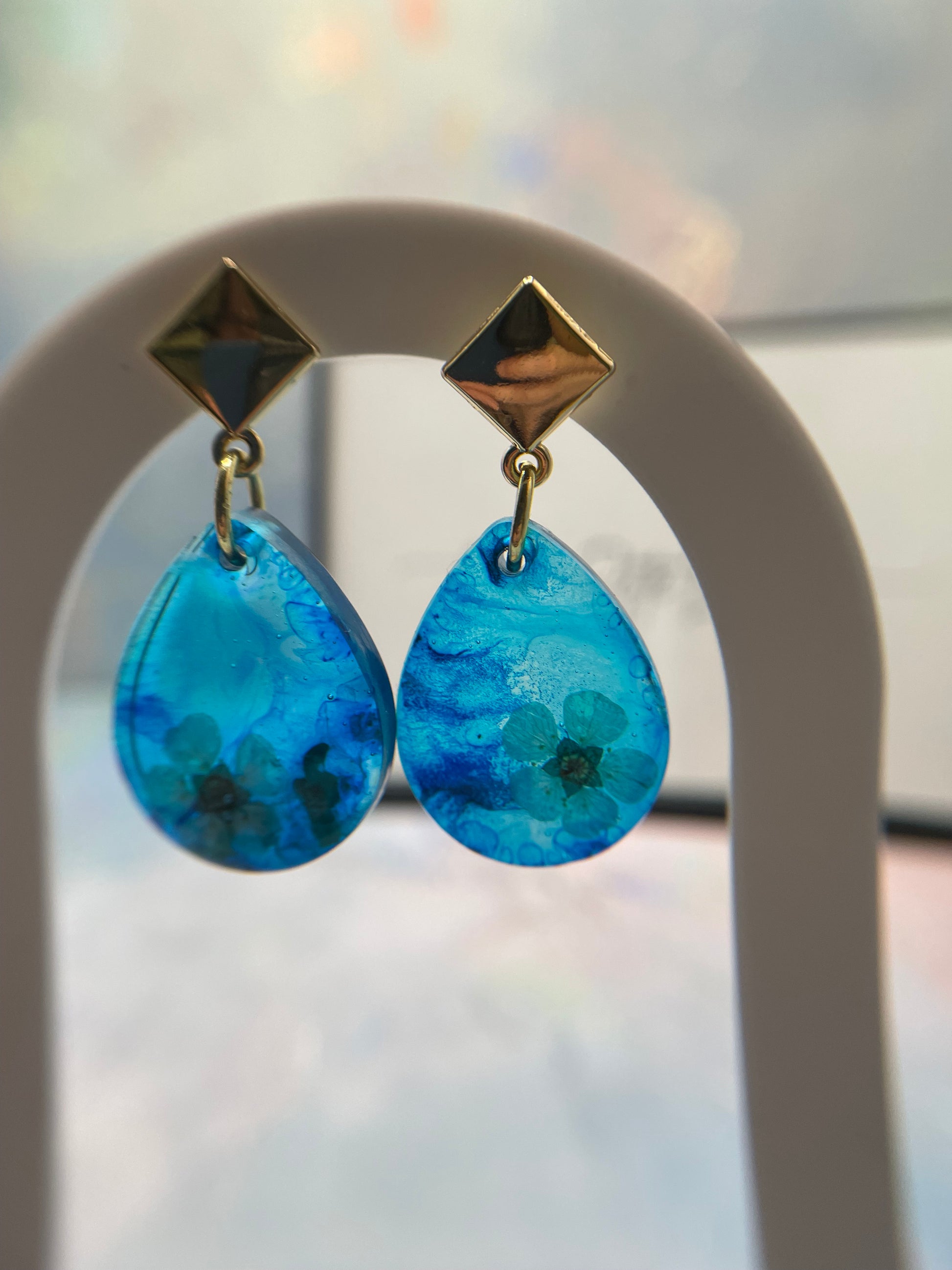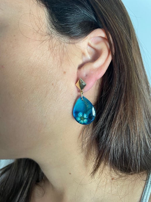 Add a touch of elegance to your ensemble with our "Flower on Blue Teardrop" earrings. These beautifully designed earrings feature a translucent blue resin base adorned with a delicate blue flower, complemented by a gold lozenge stud for a sophisticated finish.