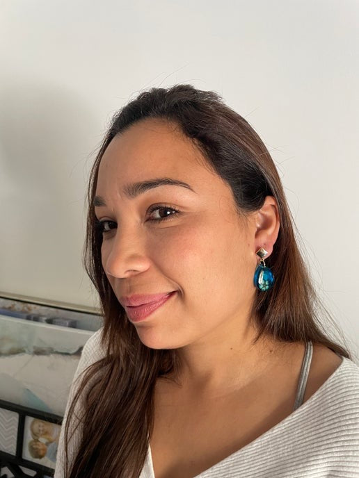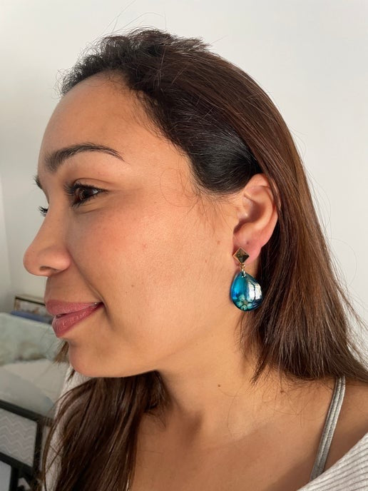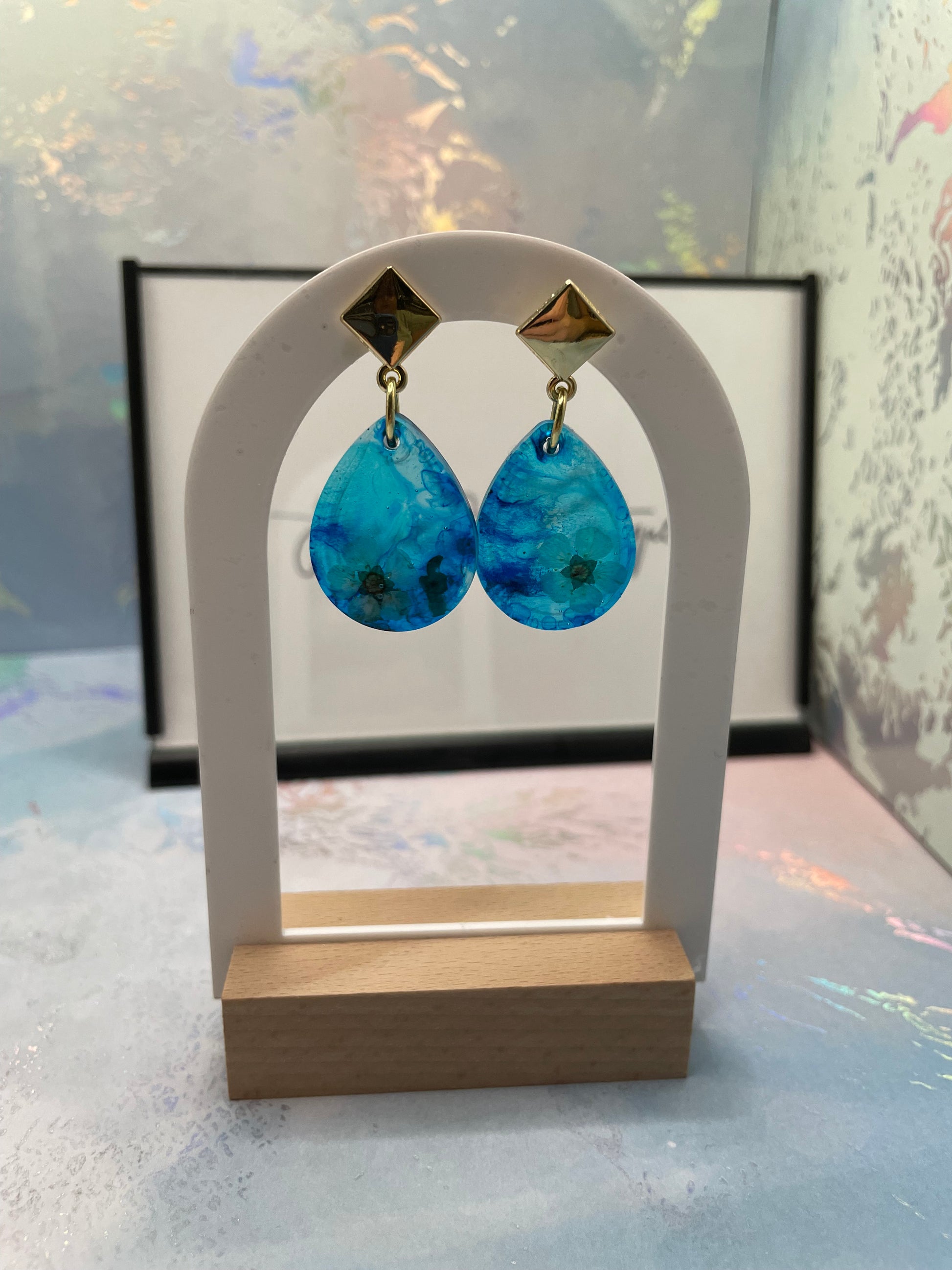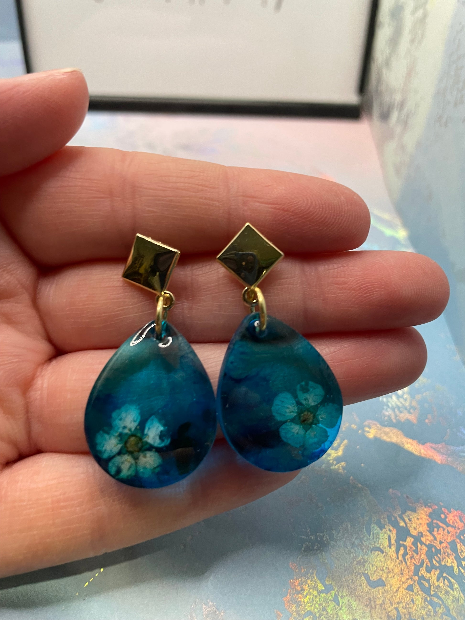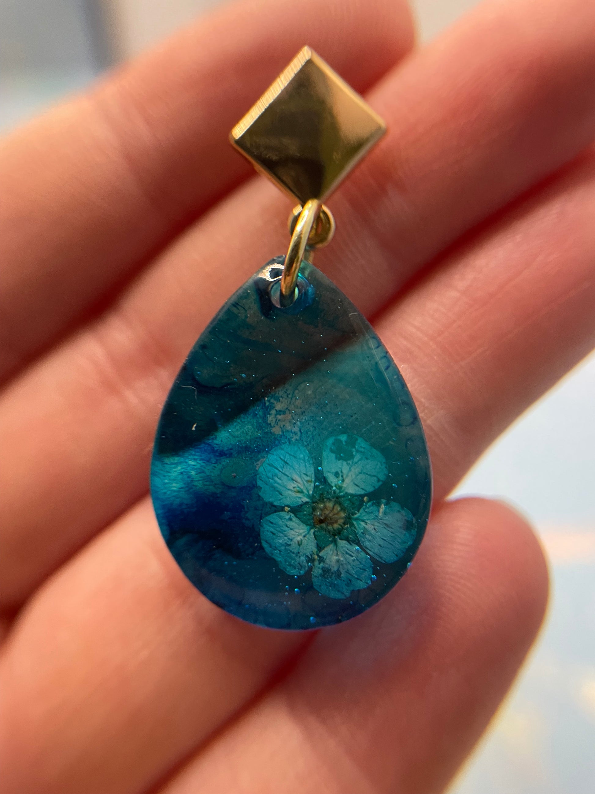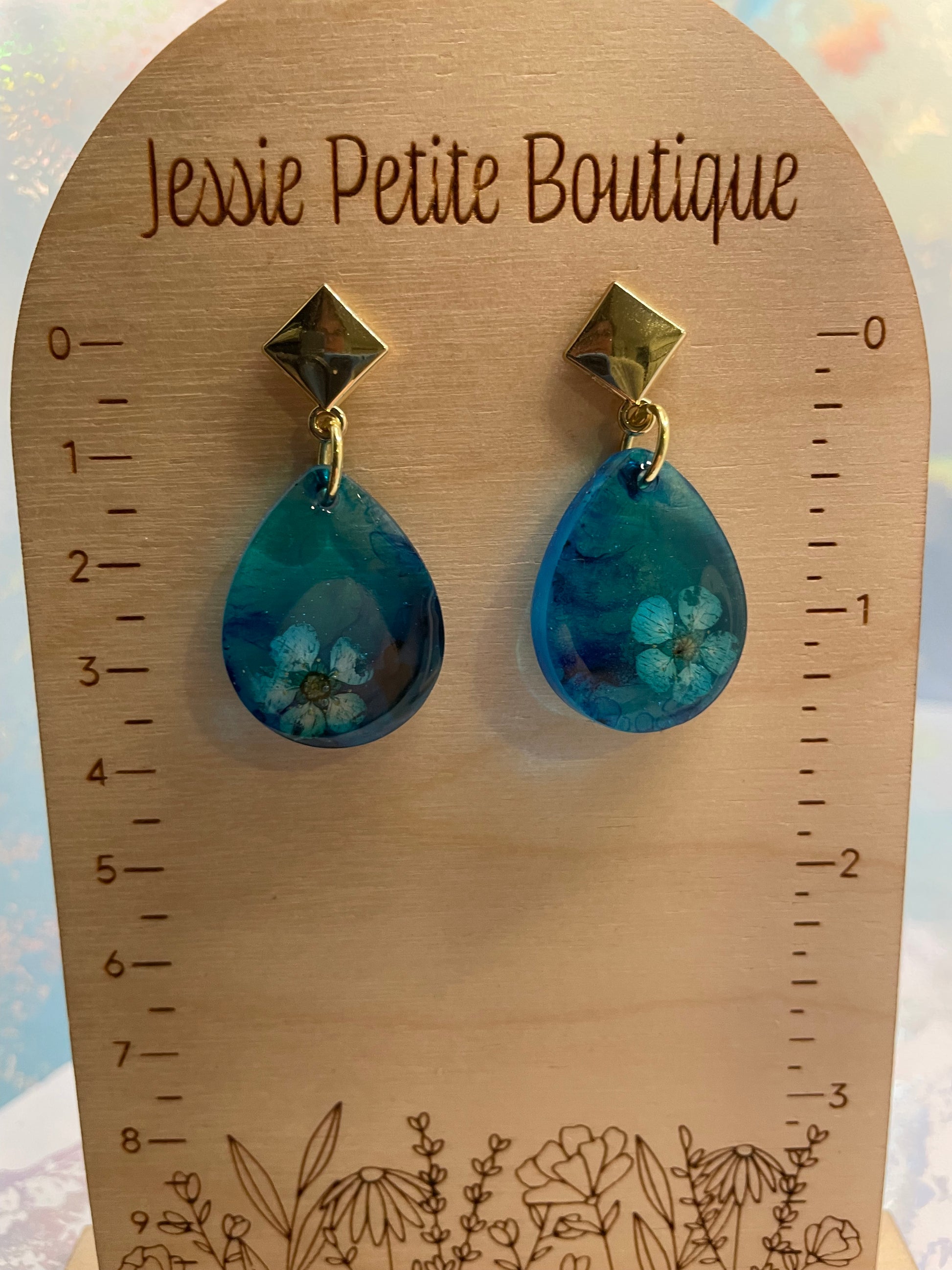 Add a touch of elegance to your ensemble with our "Flower on Blue Teardrop" earrings. These beautifully designed earrings feature a translucent blue resin base adorned with a delicate blue flower, complemented by a gold lozenge stud for a sophisticated finish.