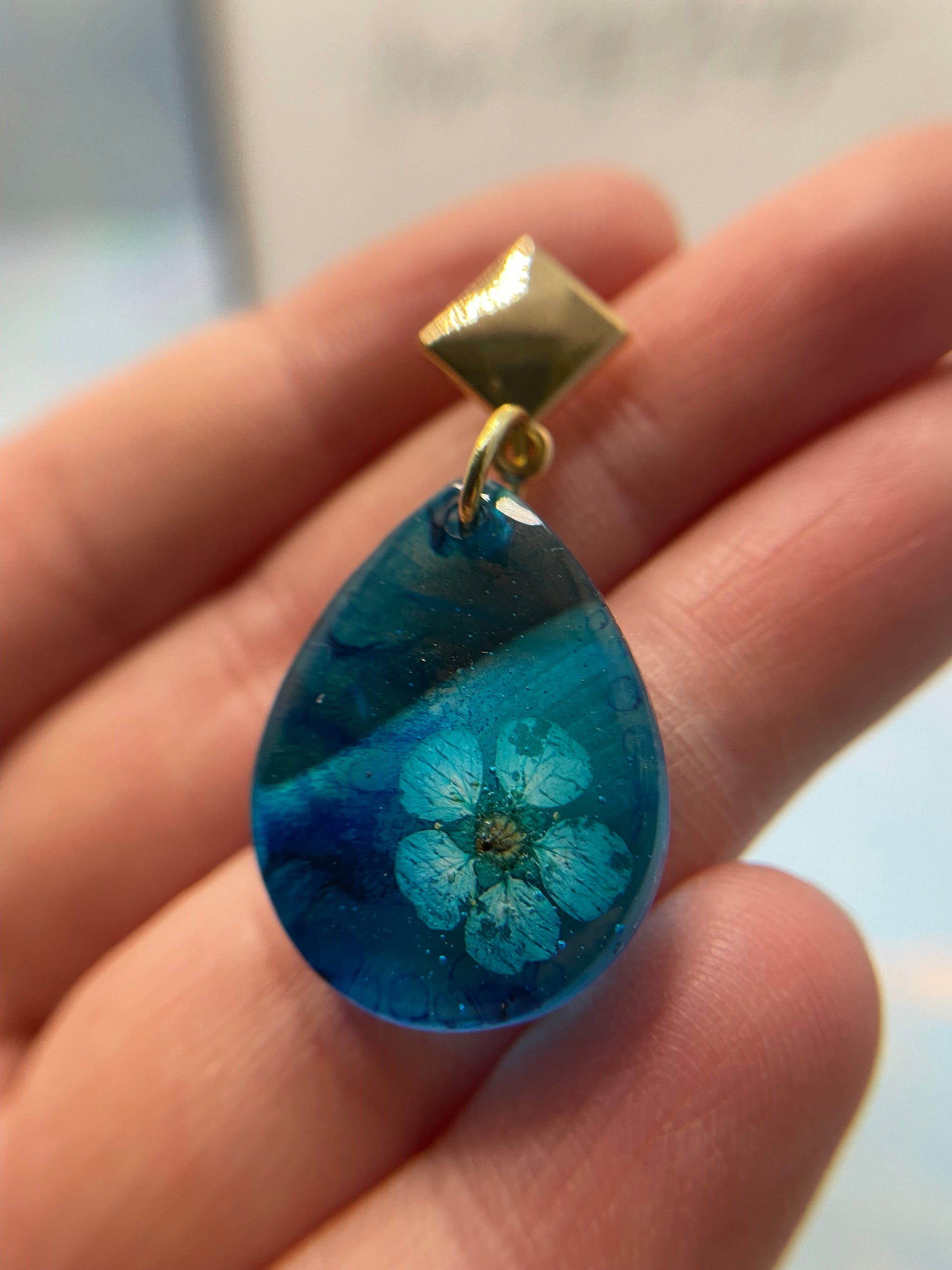 Materials: Made from resin and alcohol ink with a dried flower detail, and finished with a brass gold stud.