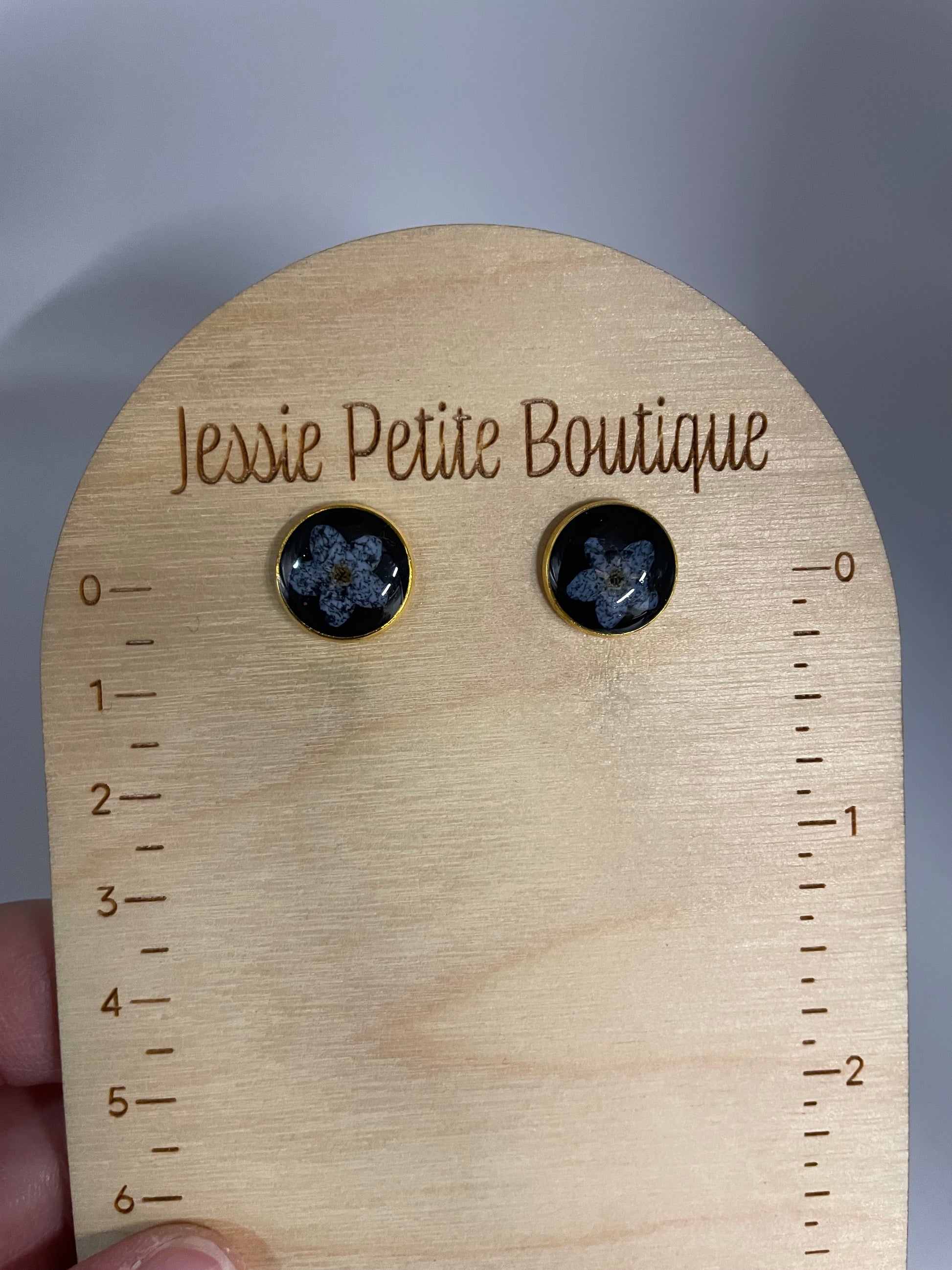Material: Resin, mica powder, dried forget-me-not flower, stainless steel (gold tone stud)