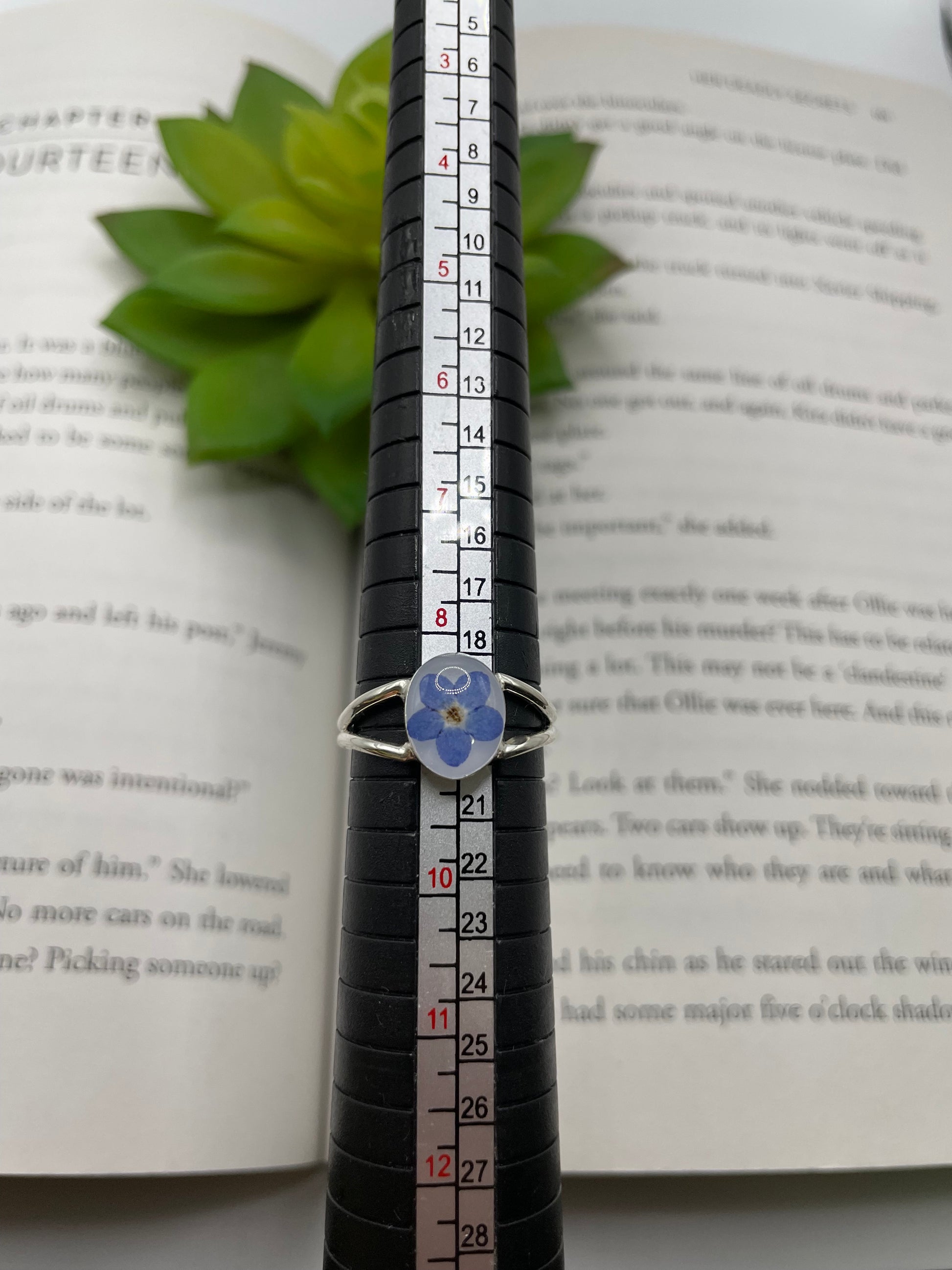 Delicate and timeless, this 925 sterling silver ring features an oval bezel (9×12 mm) filled with resin, mica powder, and a real dried forget-me-not flower.