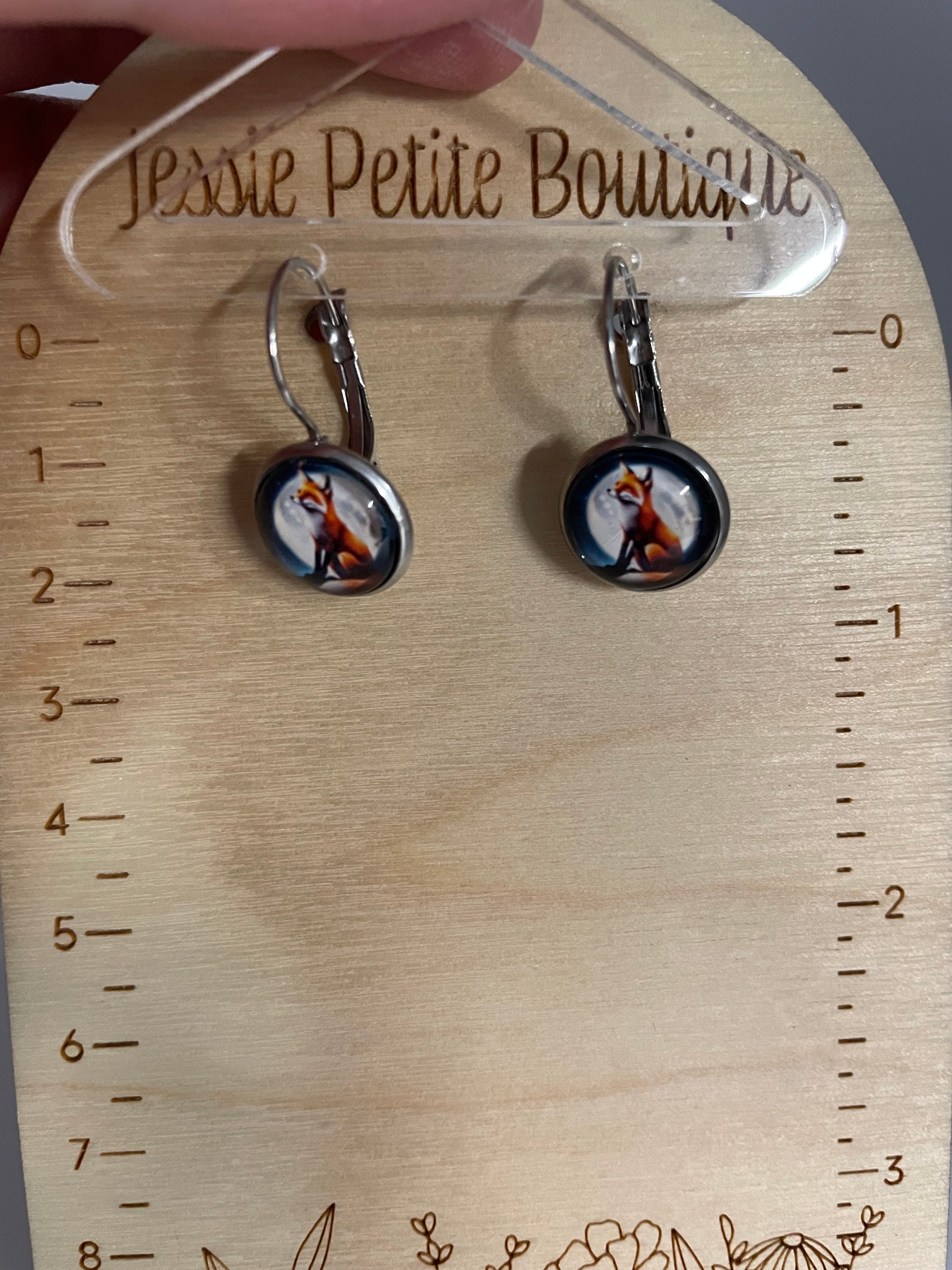 Charming and mysterious, these leverback earrings feature a detailed fox sitting under a glowing moon — a beautifully balanced mix of elegance and whimsy. The round glass cabochon enhances the artwork’s depth, catching the light with every movement.