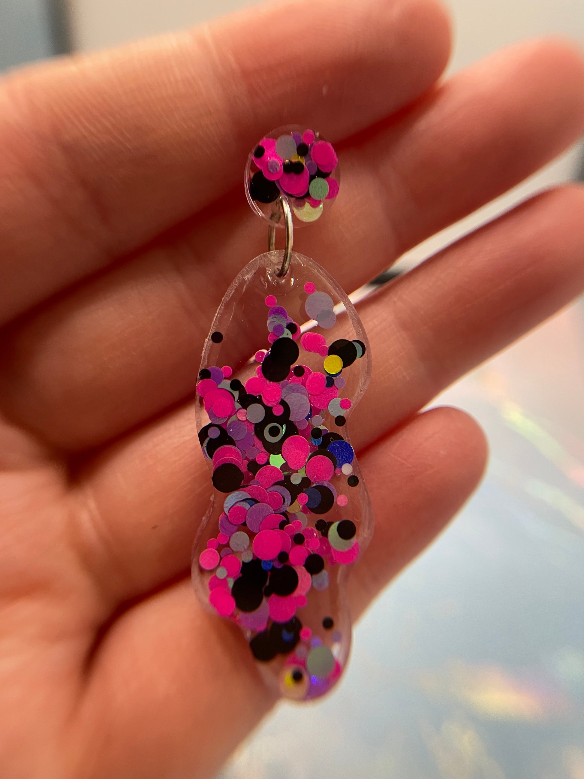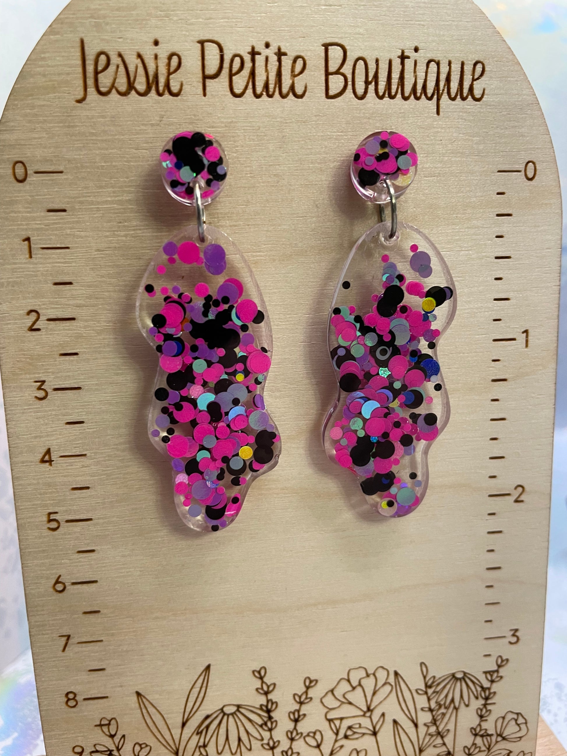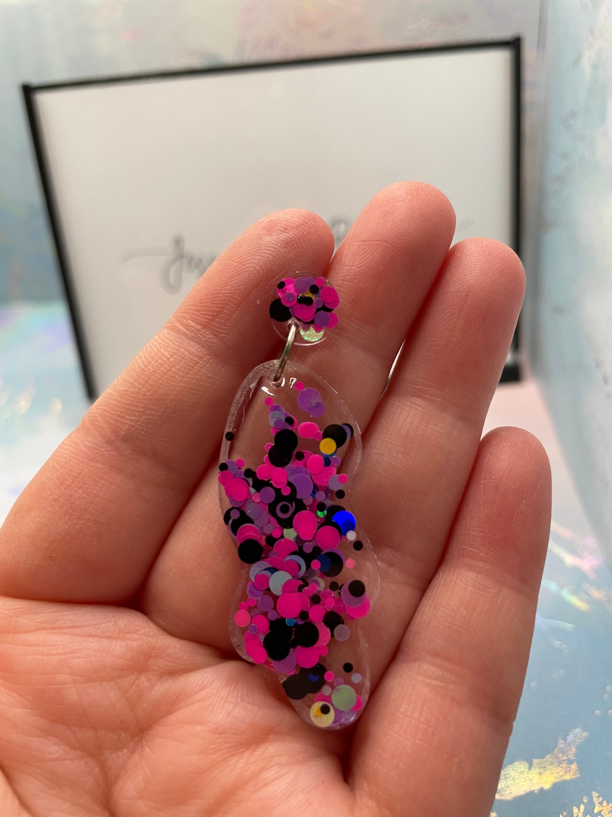 Add a bold touch to your accessory collection with these funky dangle earrings. Featuring a striking organic shape, they are made with a mix of clear, pink, purple, and black resin, with a hint of glitter for a sparkling finish. The lightweight design ensures comfort while the hypoallergenic plastic stud and butterfly closure make them suitable for those with sensitive skin.