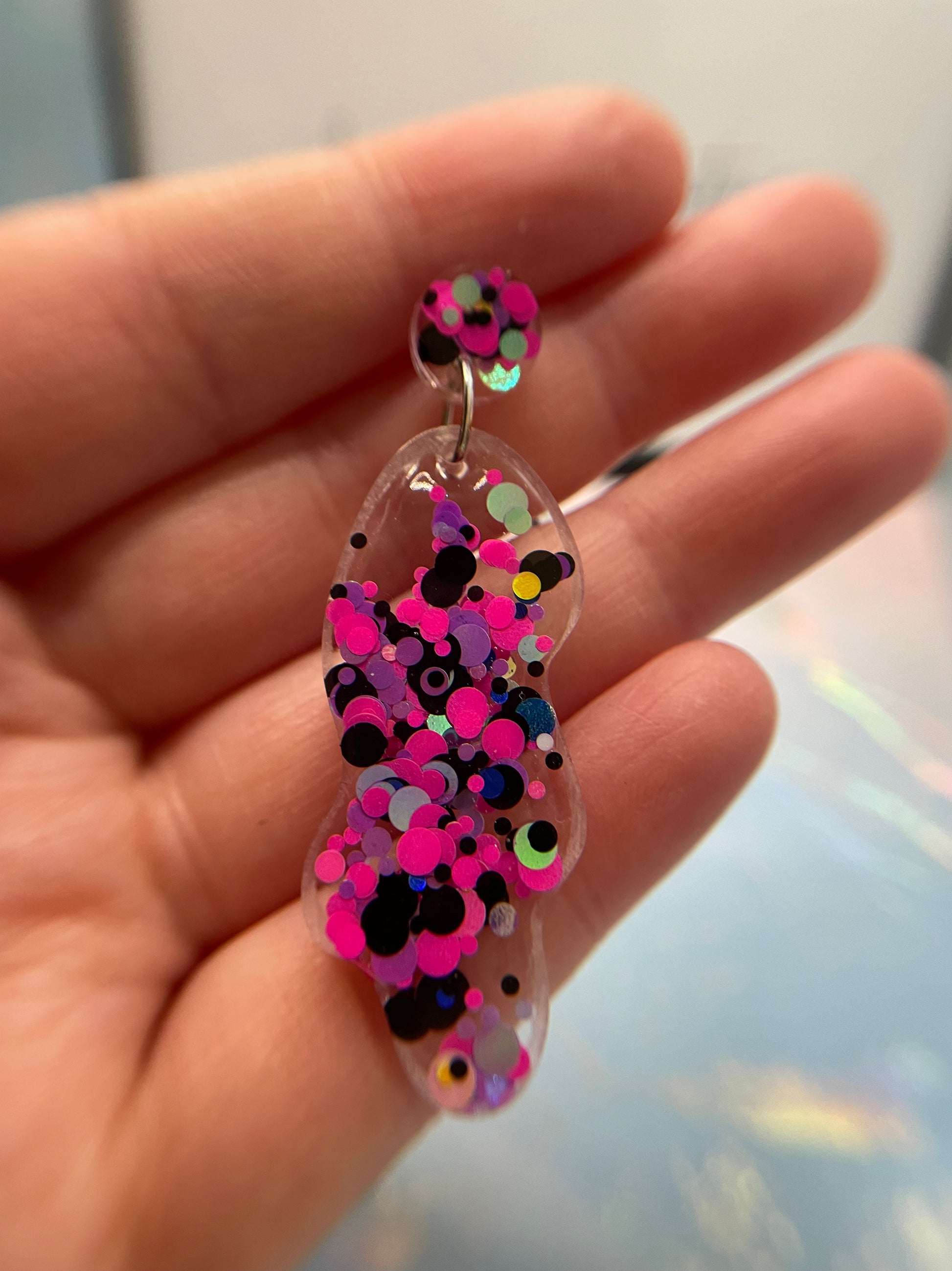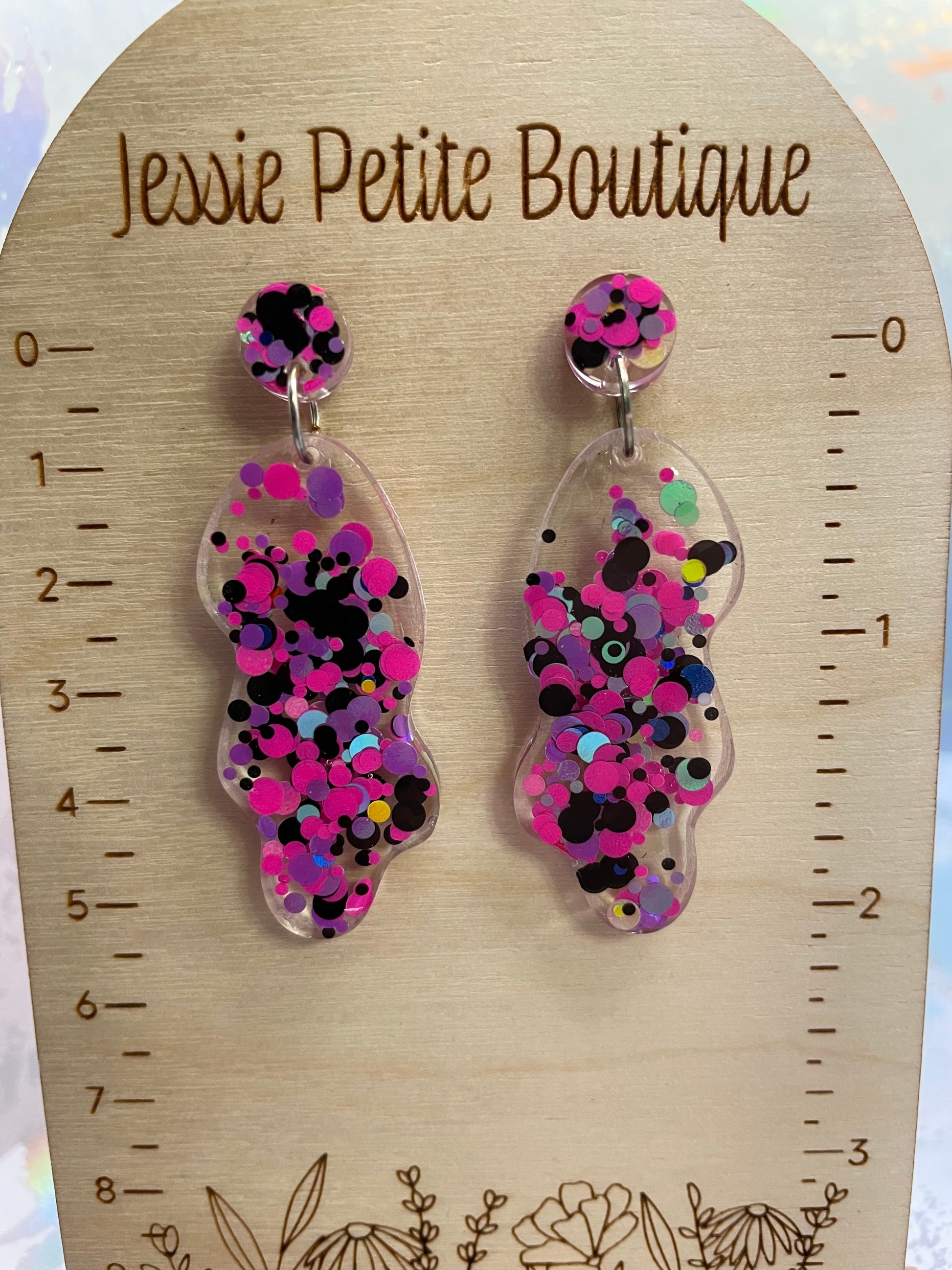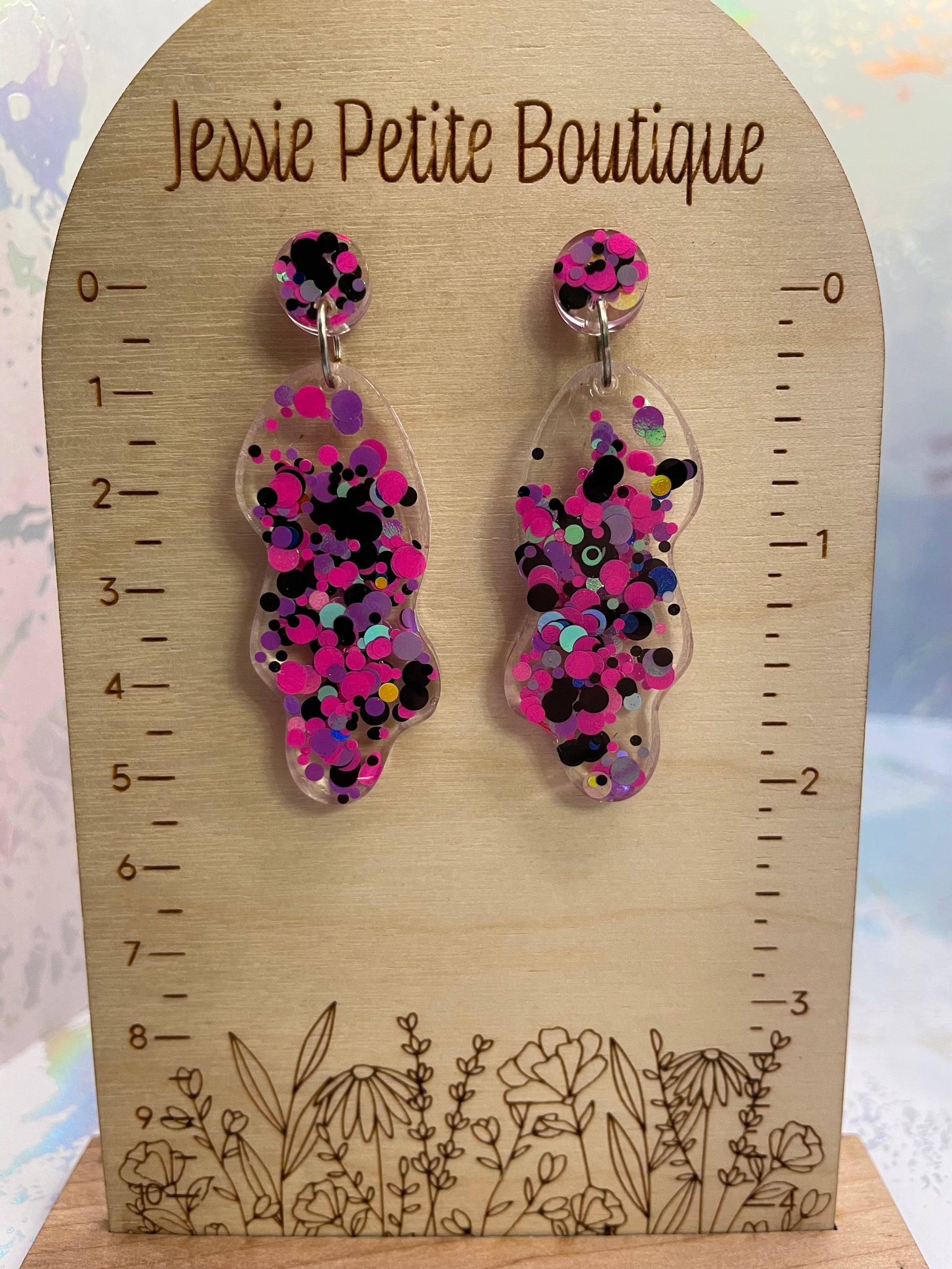 Add a bold touch to your accessory collection with these funky dangle earrings. Featuring a striking organic shape, they are made with a mix of clear, pink, purple, and black resin, with a hint of glitter for a sparkling finish. The lightweight design ensures comfort while the hypoallergenic plastic stud and butterfly closure make them suitable for those with sensitive skin.