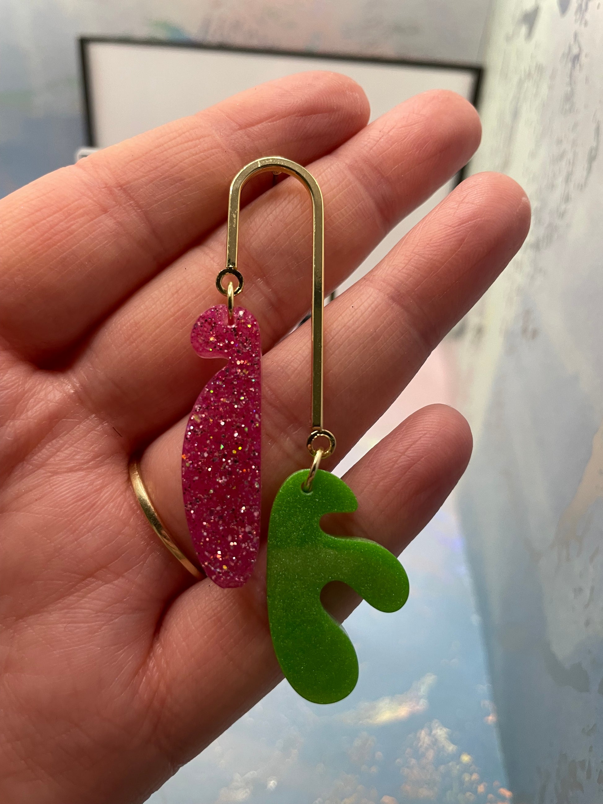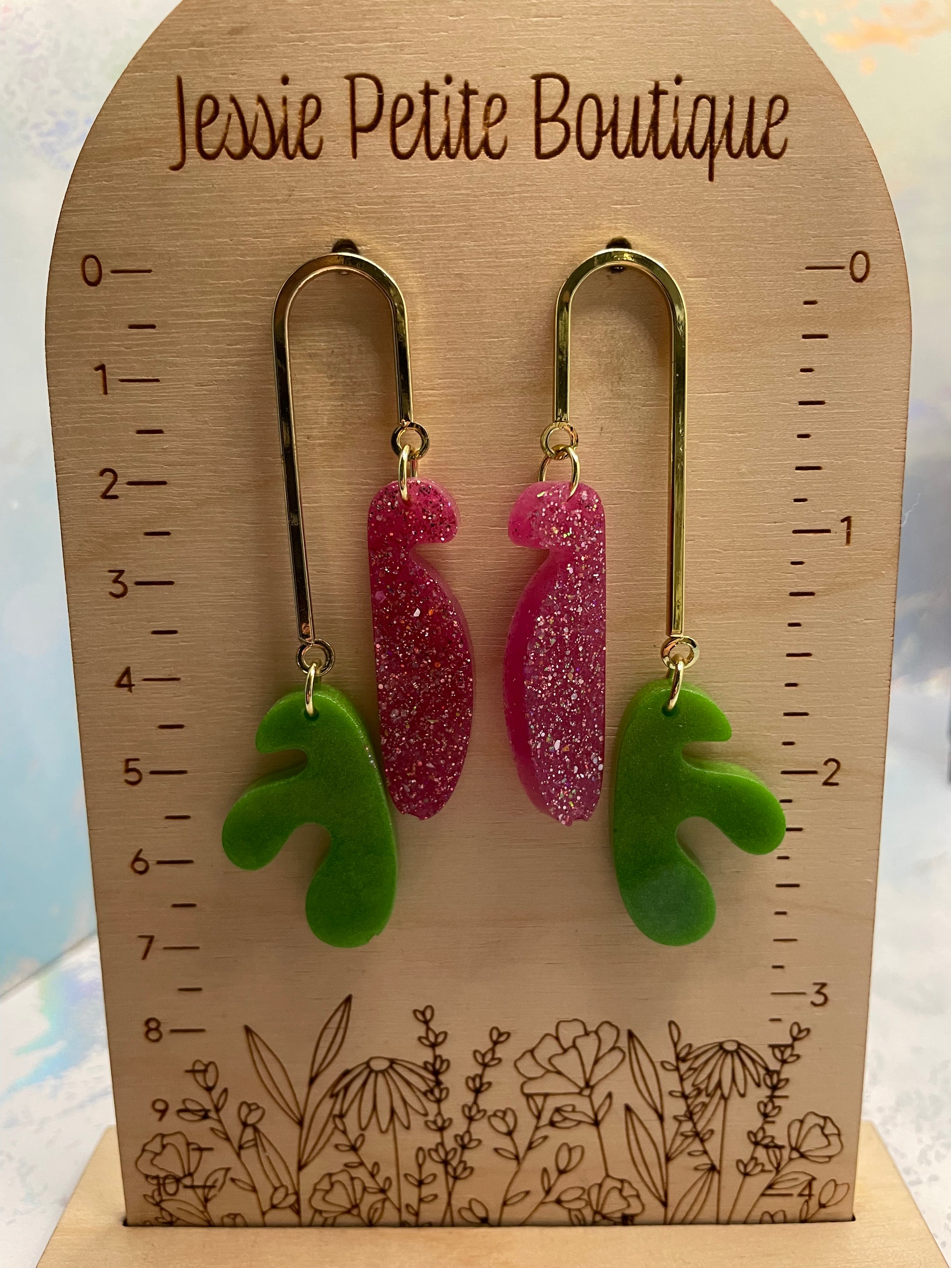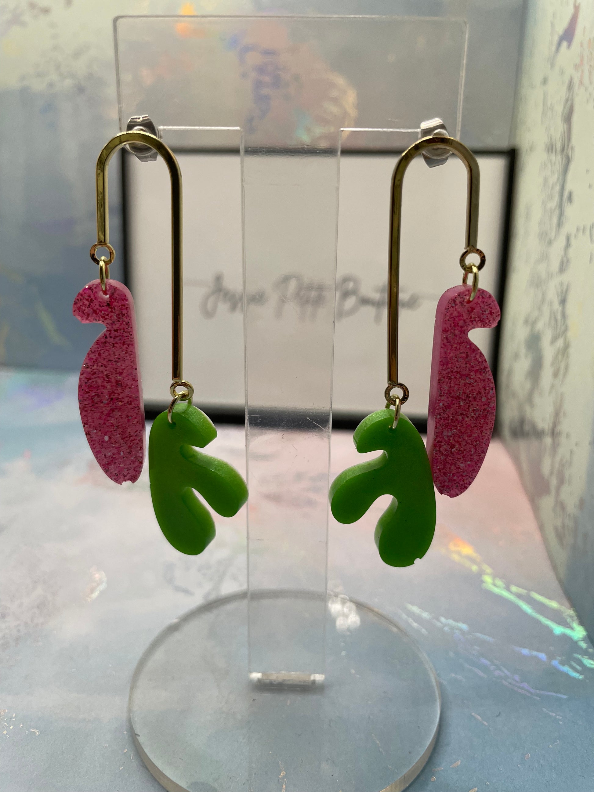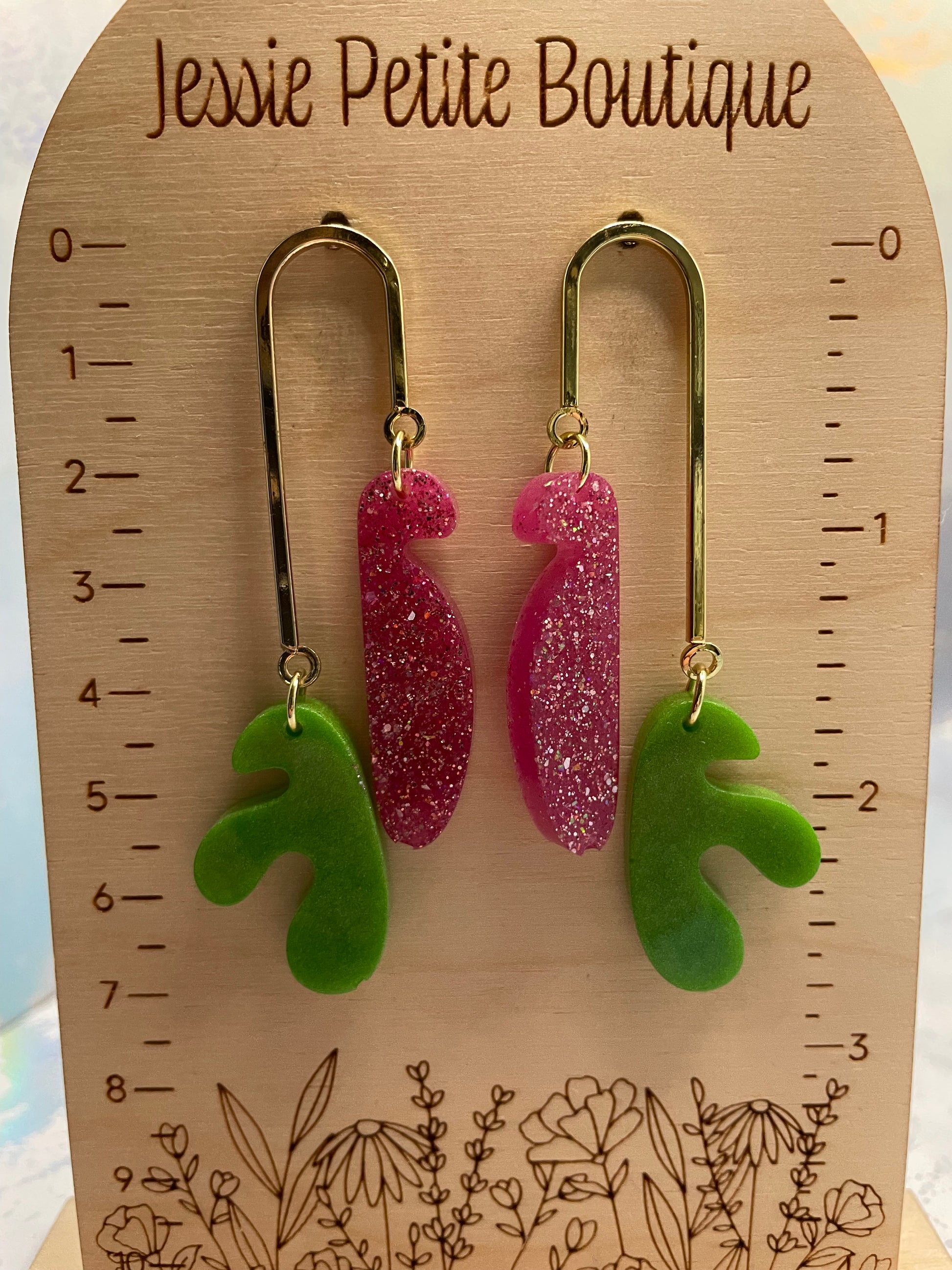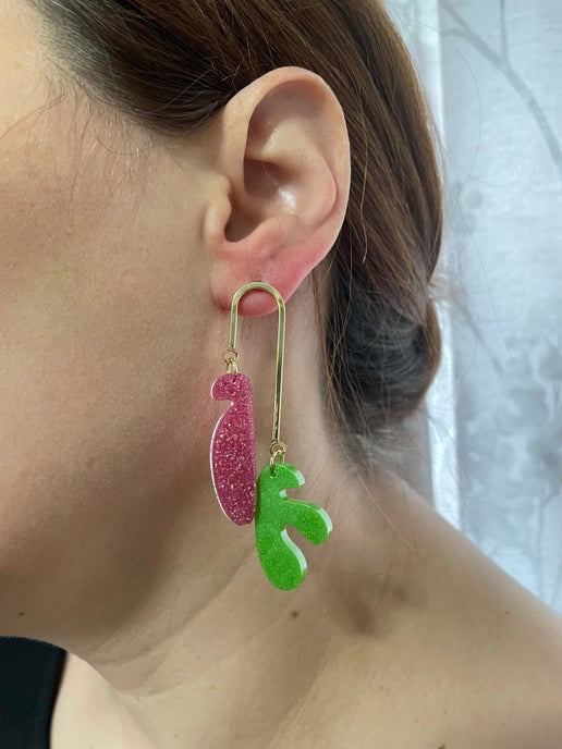 Make a statement with these funky double dangle earrings, featuring a striking combination of sparkly pink, green, and gold hues. The organic shape design gives these earrings a playful yet elegant vibe, with a dynamic, layered look that’s sure to turn heads. Crafted from resin, mica powder, and glitter, the earrings shimmer with every movement, adding a pop of color and sparkle to any outfit.