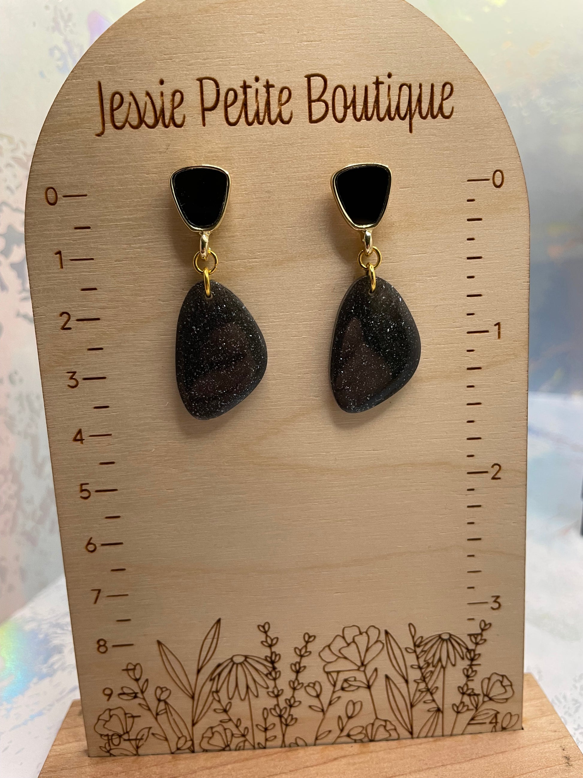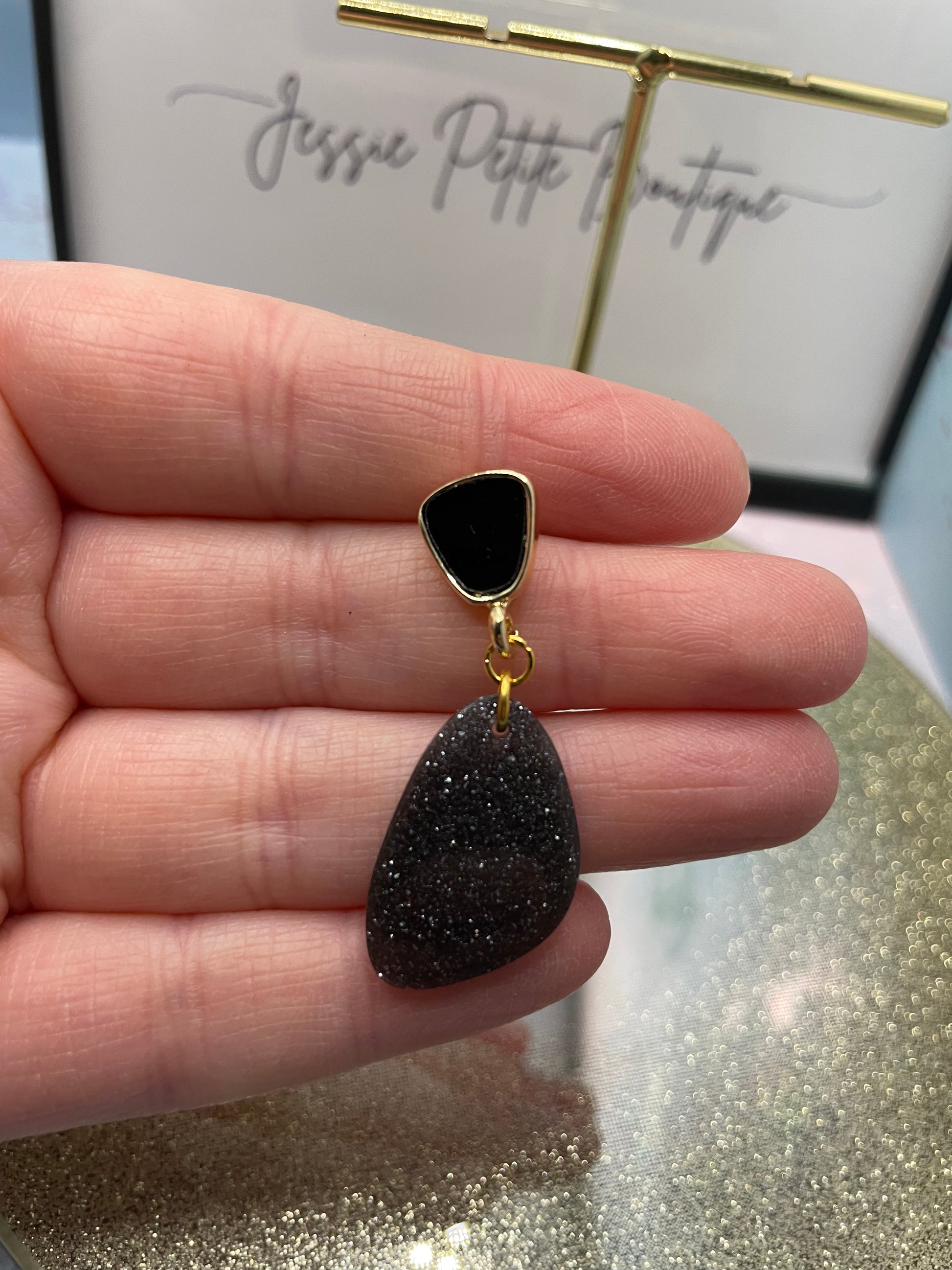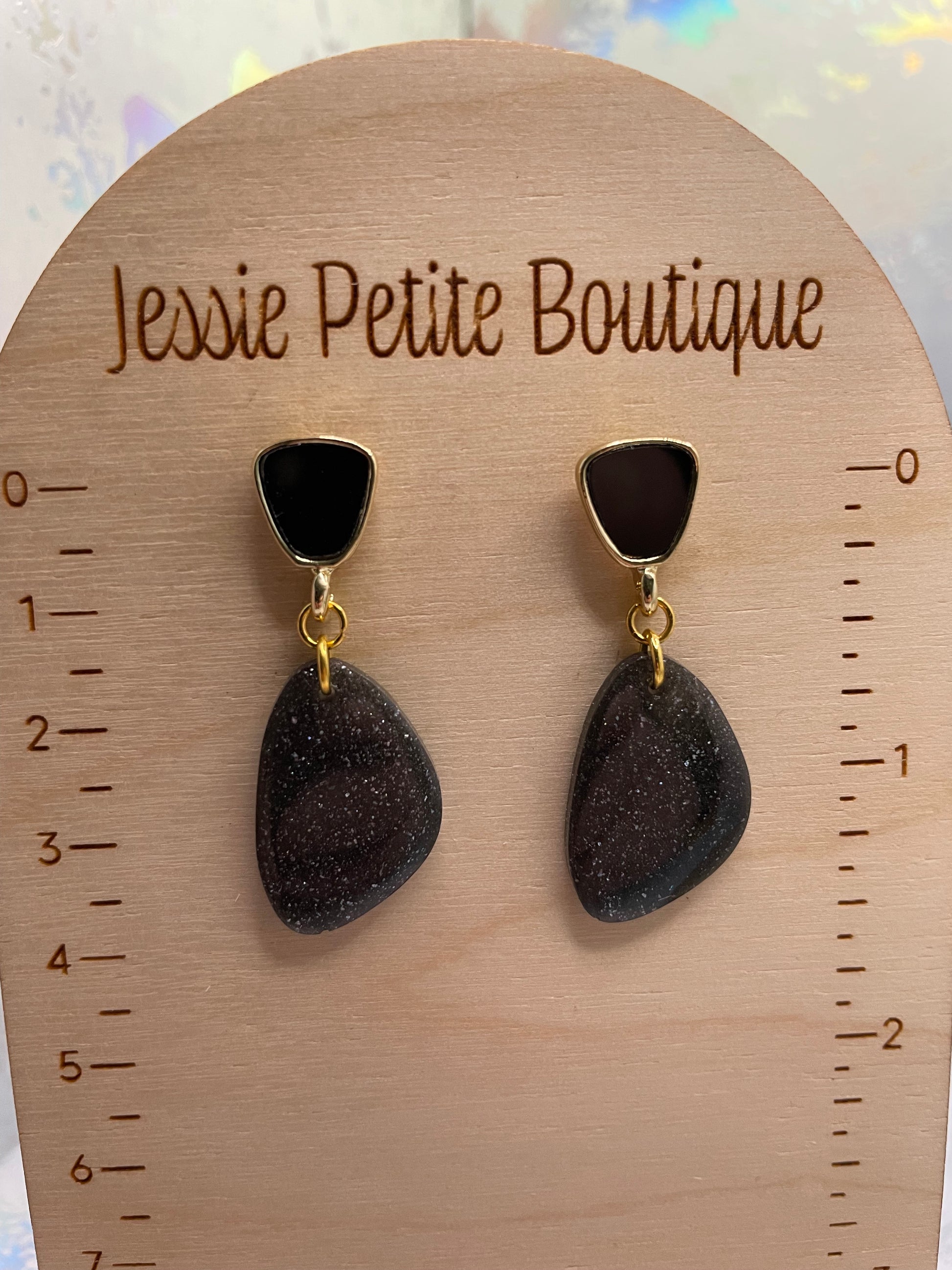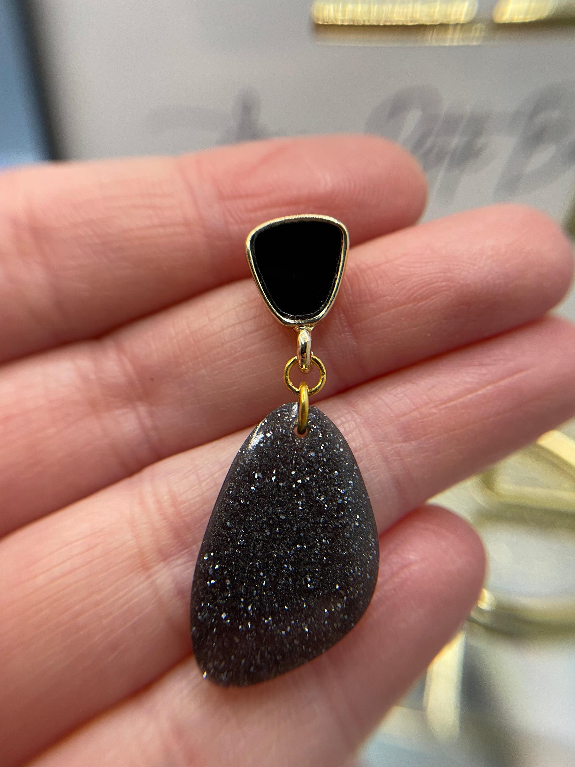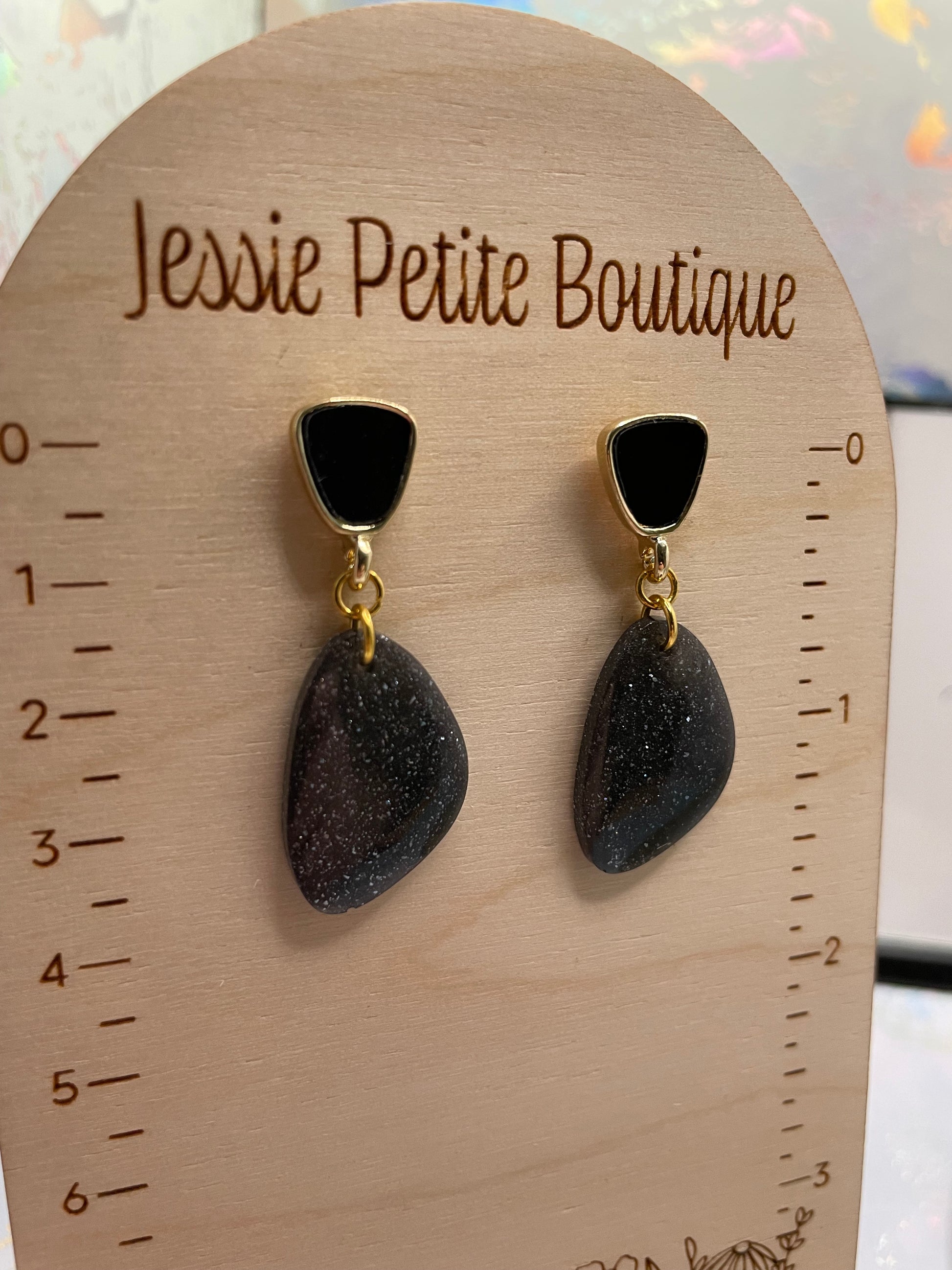 Add a touch of cosmic allure to your jewelry collection with these Galaxy Black Earrings. The organic-shaped design features a stunning blend of galaxy black, gold, and black hues, with shimmering glitter and mica powder accents that give the illusion of a starry night sky. The gold and black stud closure enhances the overall look, making these earrings a bold yet elegant statement piece.