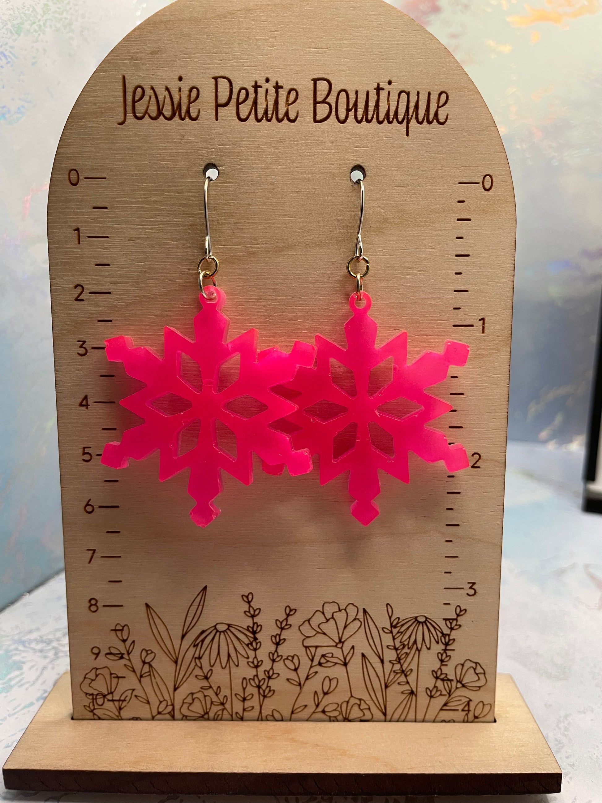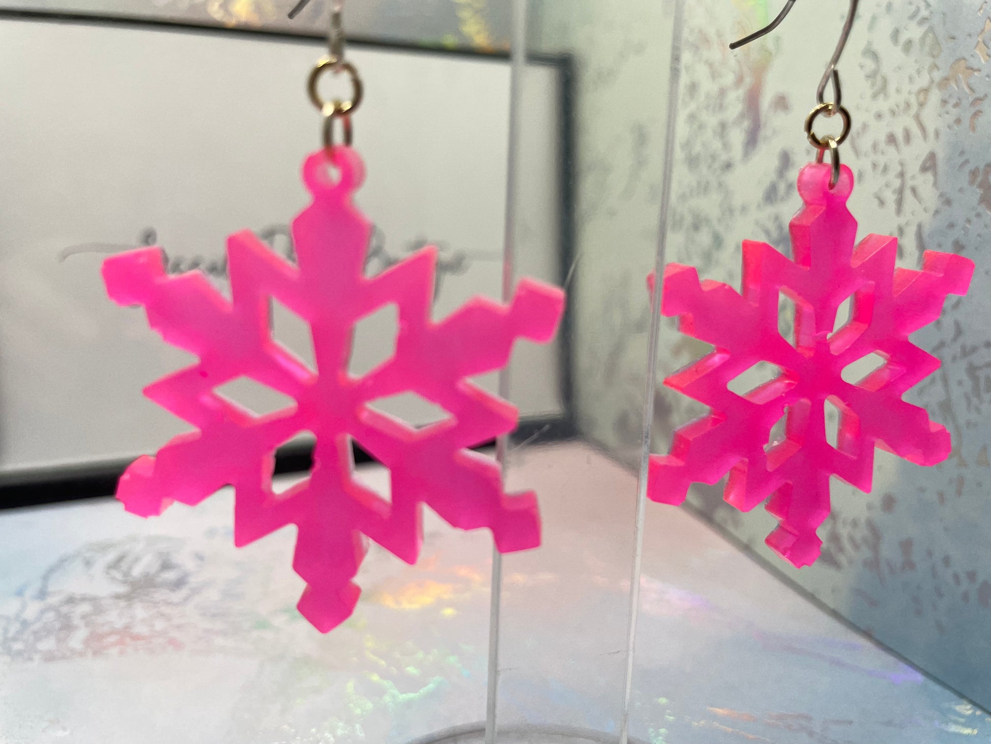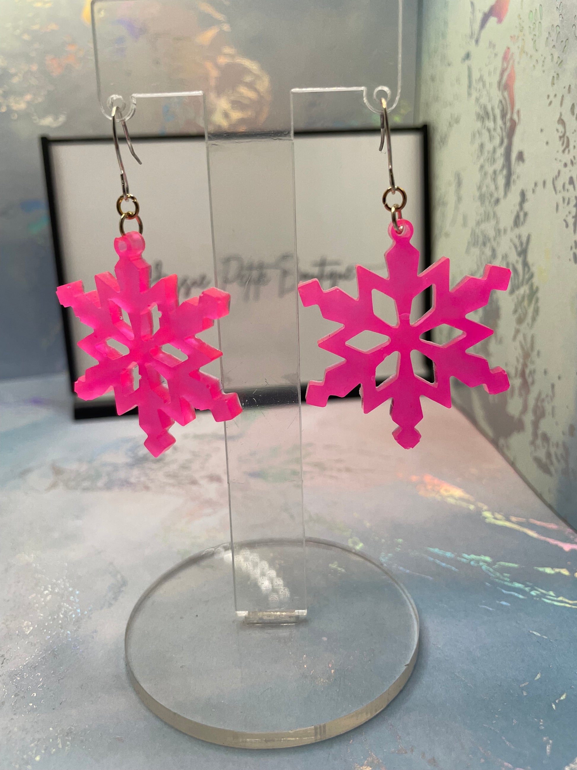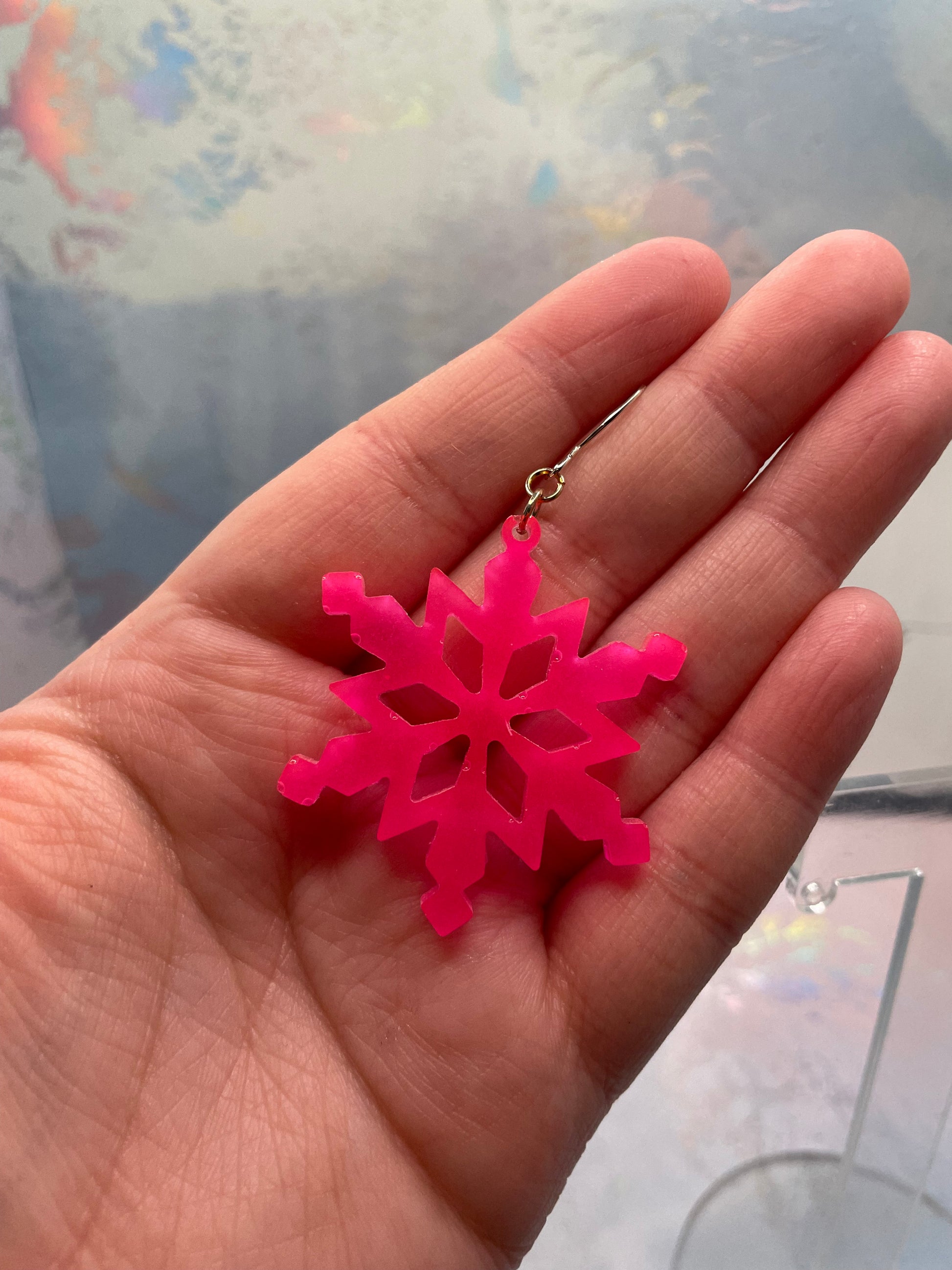 Make a bold statement with these bright pink snowflake dangle earrings that glow in the dark! Crafted from resin and shimmering mica powder, these earrings capture the beauty of winter with a fun, vibrant twist. Their lightweight design and ear wire closure ensure all-day comfort, perfect for adding a pop of colour to any outfit.