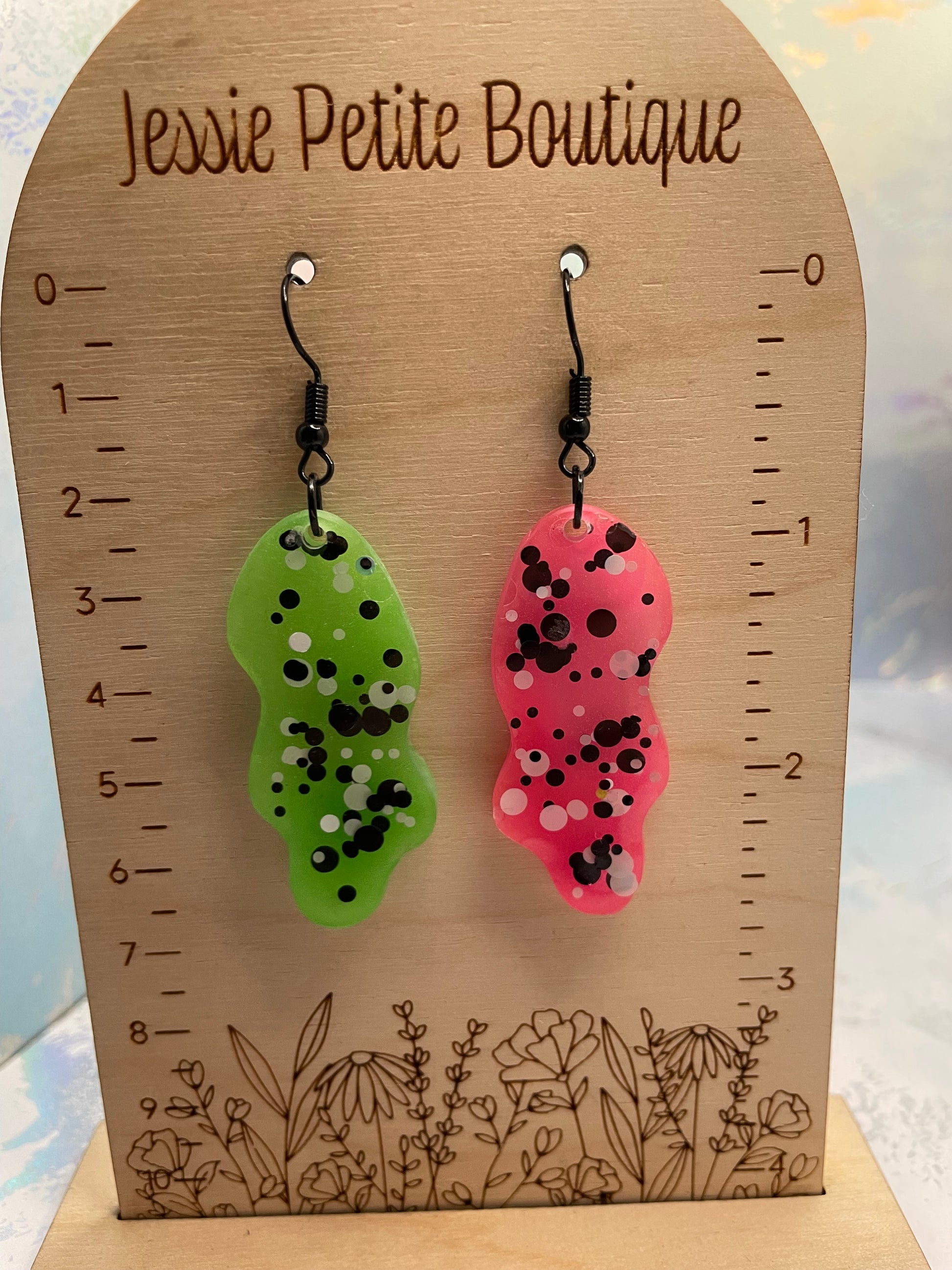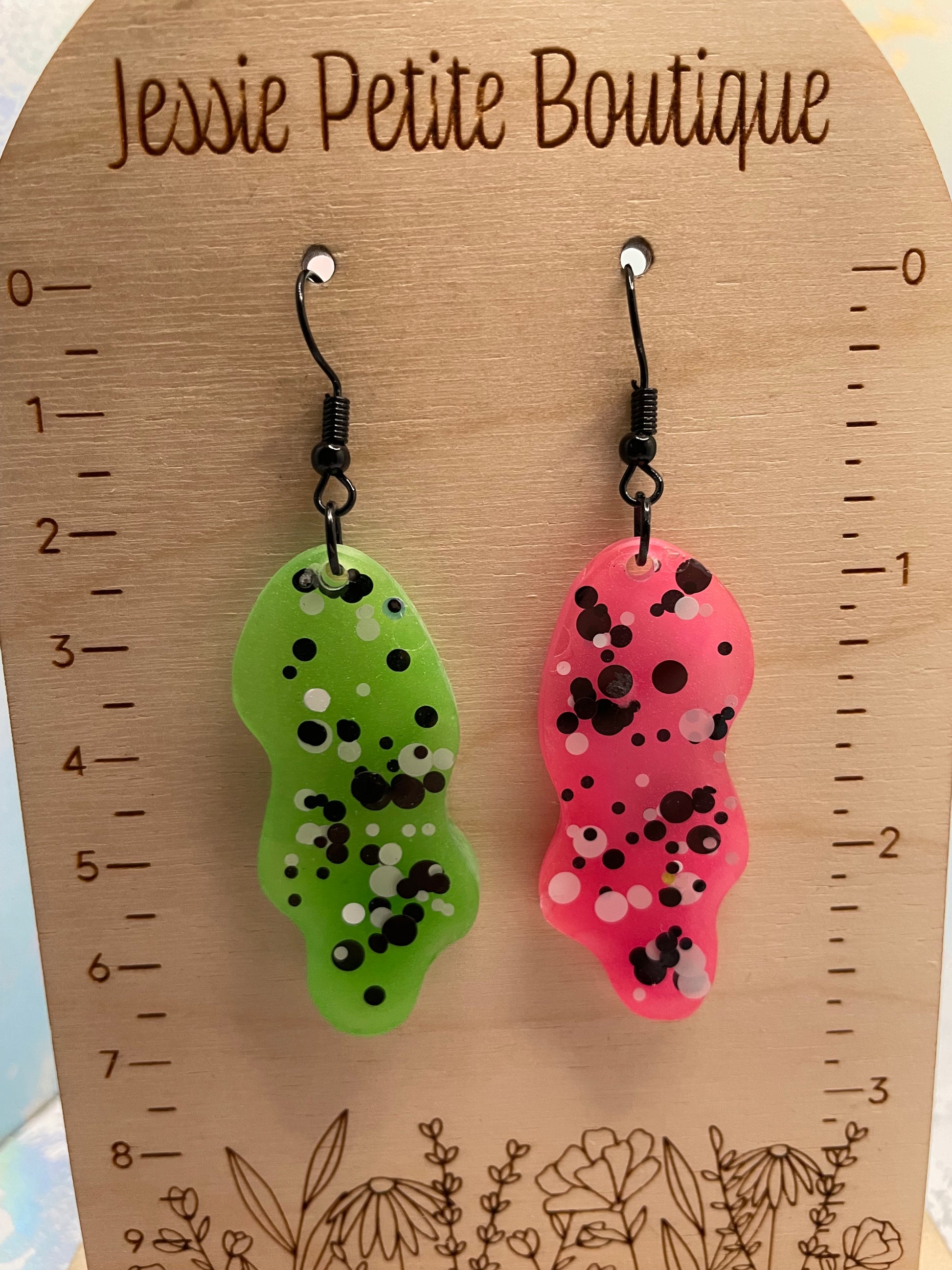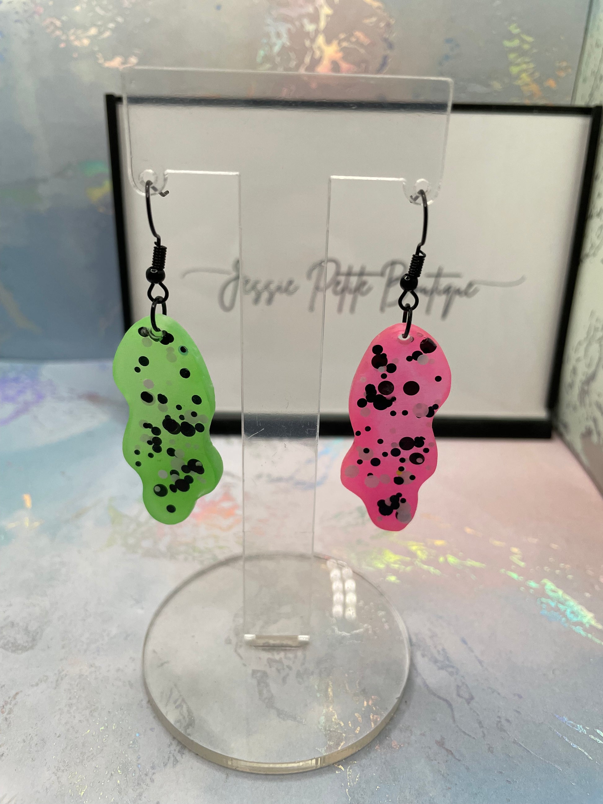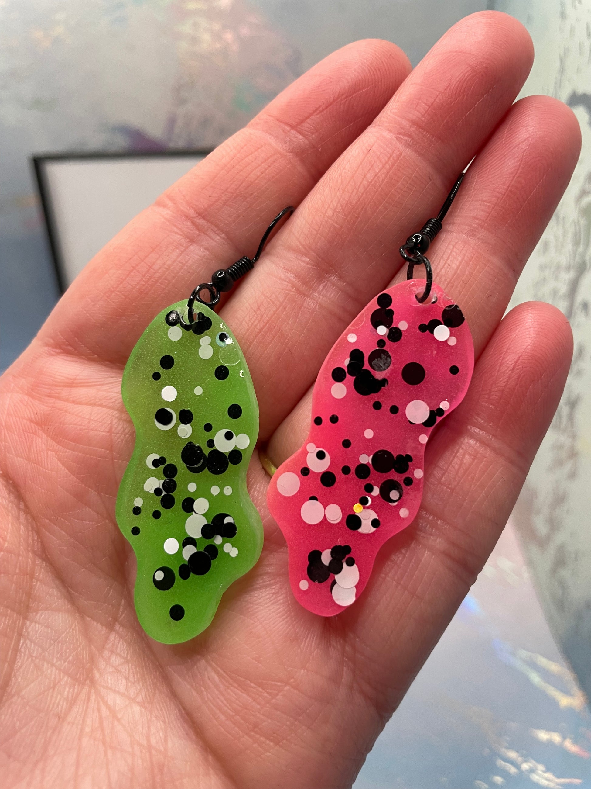 Make a bold statement with these eye-catching mismatched earrings! One earring features neon green with playful white and black dots, while the other showcases vibrant hot pink with the same dotted design. Adding an extra touch of magic, these earrings glow in the dark, perfect for standing out day or night. Crafted from resin with mica powder and glitter, they offer a dazzling finish.