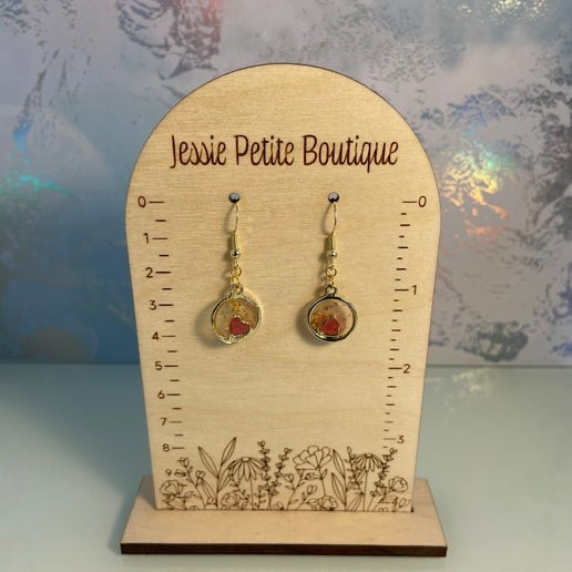 Add a touch of romance and charm to your look with these delicate handmade earrings, featuring a soft pink heart enclosed in a shimmering gold circle. The design is completed with gold foil accents embedded in clear resin, giving each piece a sophisticated, polished finish.