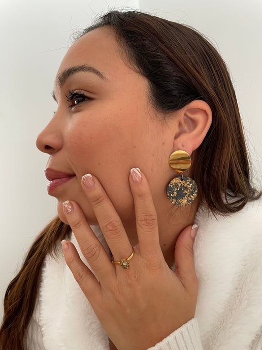 Make a bold yet elegant statement with these handcrafted black and gold circle earrings. Designed with a touch of modern glam, each piece features a shimmering resin base infused with mica powder and delicate gold flakes, paired with a polished gold top for a sophisticated finish.