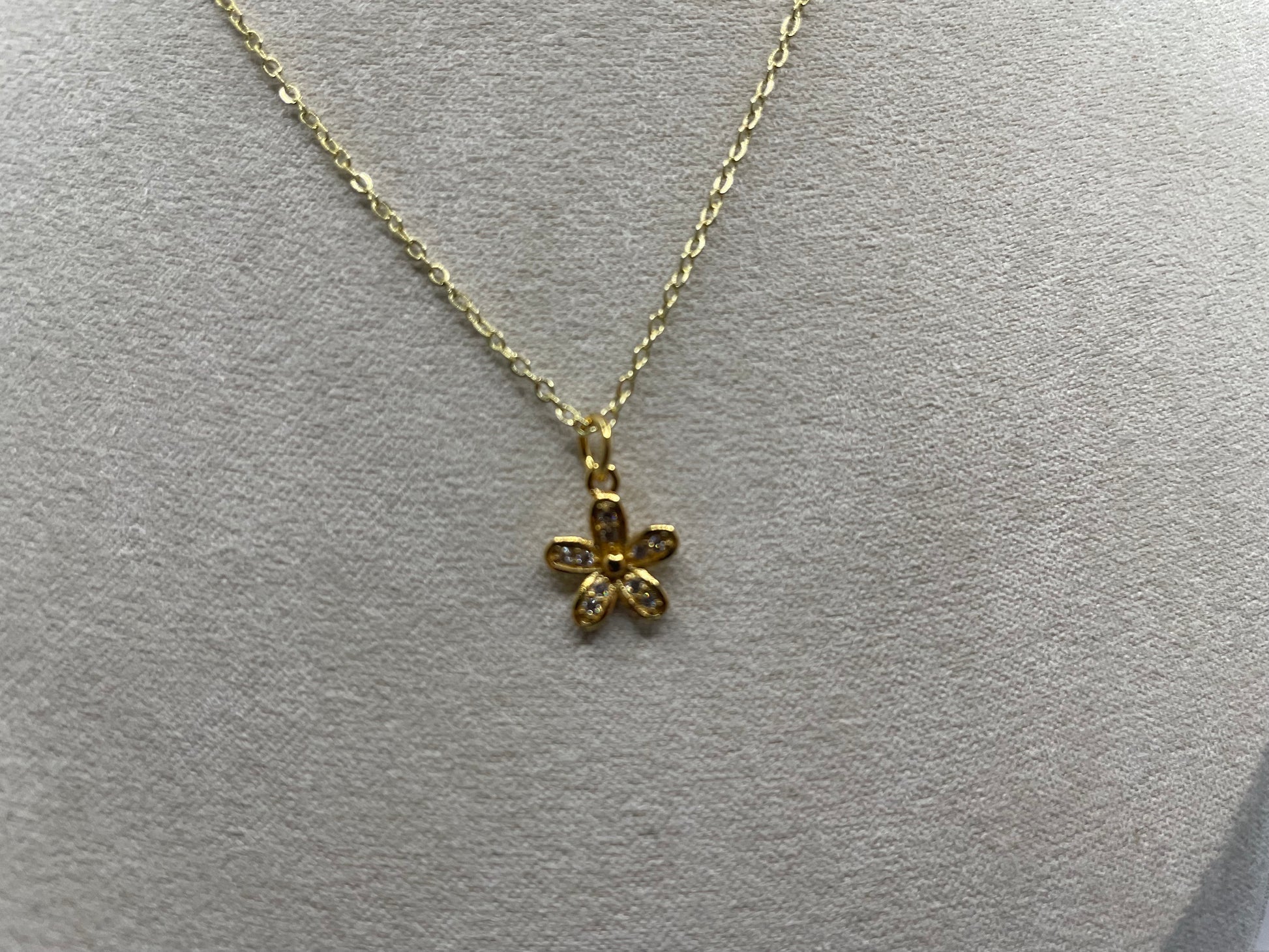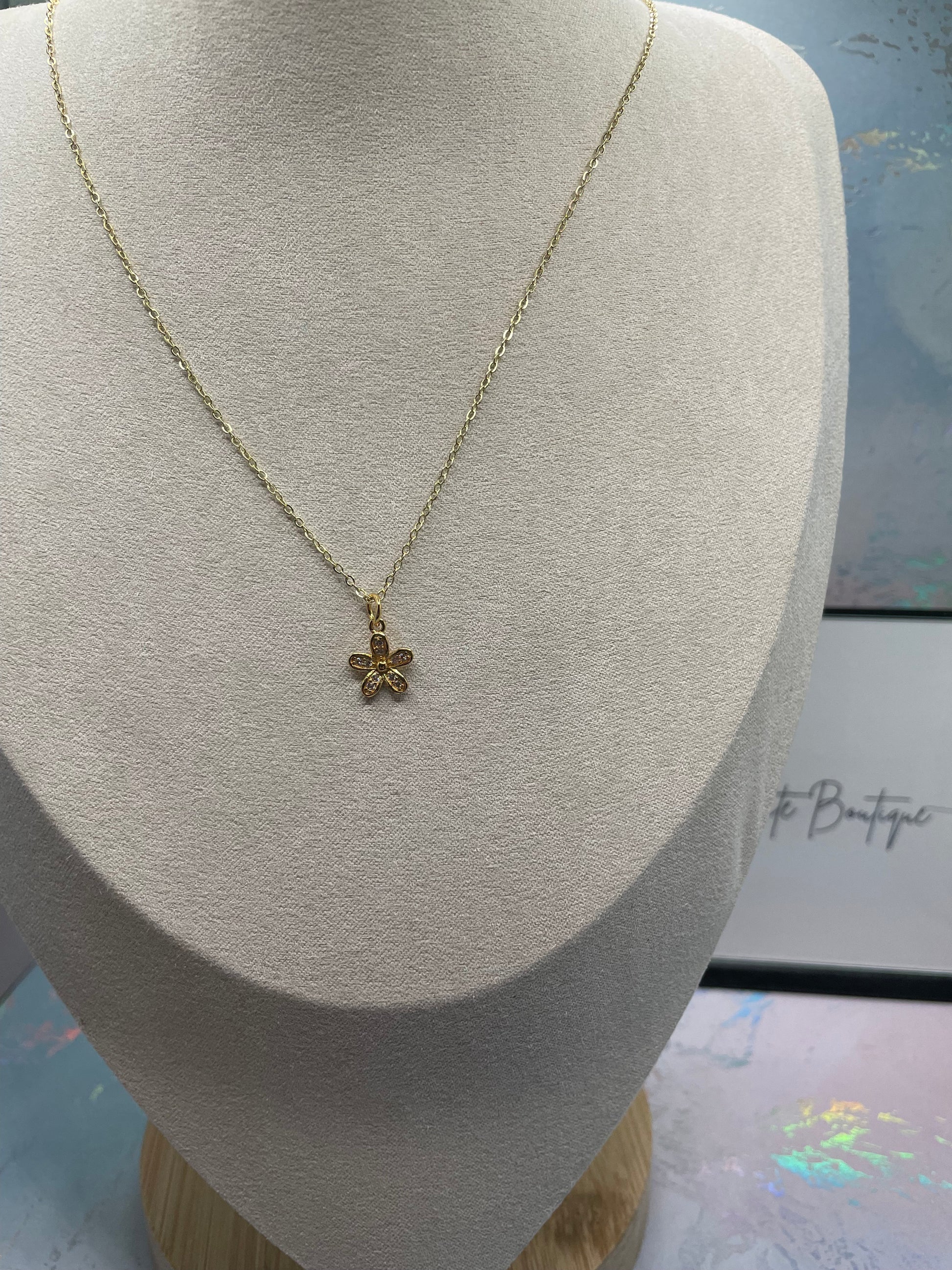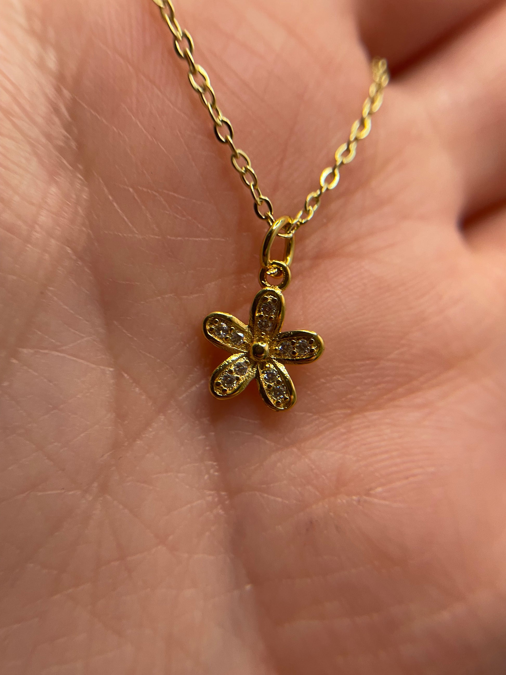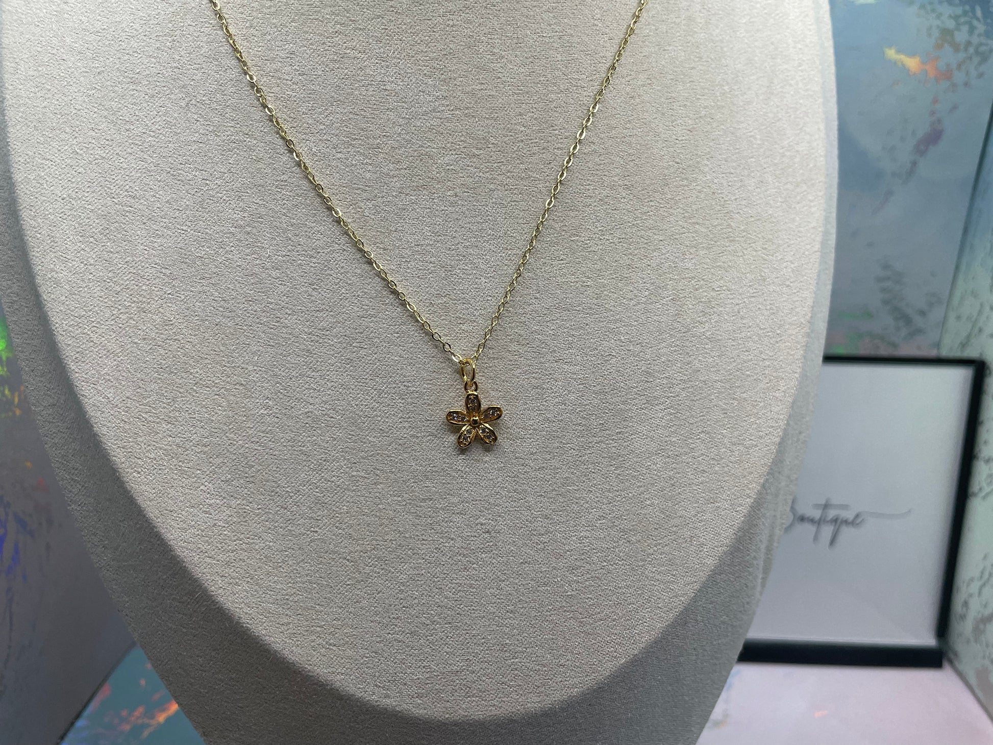 Add a touch of delicate elegance to your look with this Gold Flower Charm Necklace. Featuring a beautifully crafted gold-plated brass flower charm, this piece is adorned with shimmering cubic zirconia for a subtle sparkle. The minimalist design makes it perfect for everyday wear or layering with other favorites.