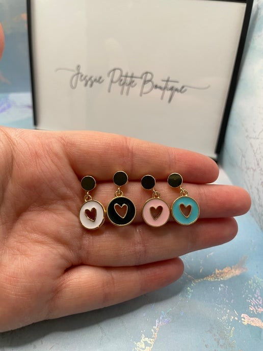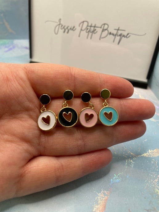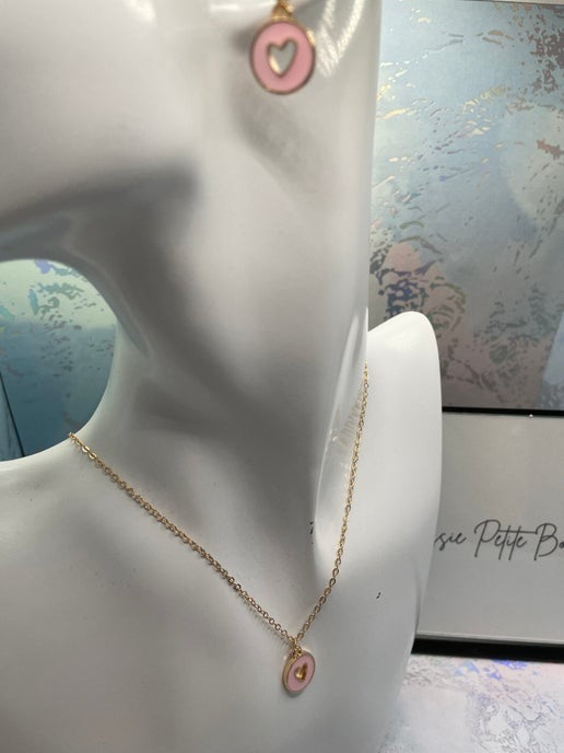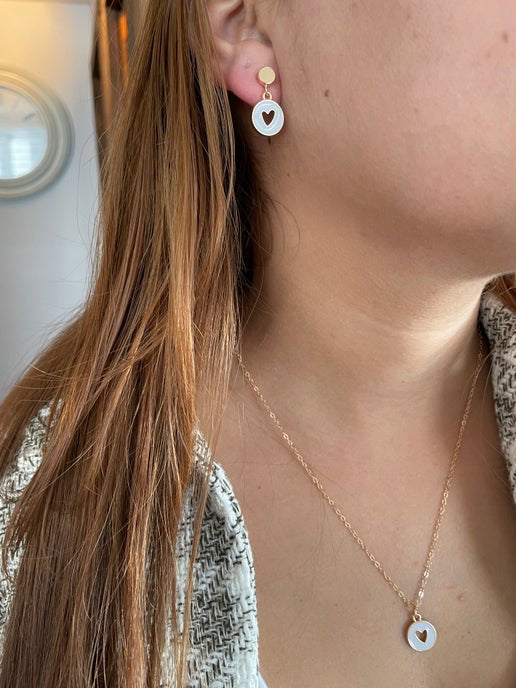 Add a touch of elegance to your collection with this Gold Heart in round pendant Necklace & Earring Set. Featuring a charming round heart design, the set is perfect for a refined, coordinated look. Available as a full set or as individual necklace or earrings, and in a different choice of colour(white, pink, blue, black). This versatile collection is crafted from gold-plated brass with enamel accents.
