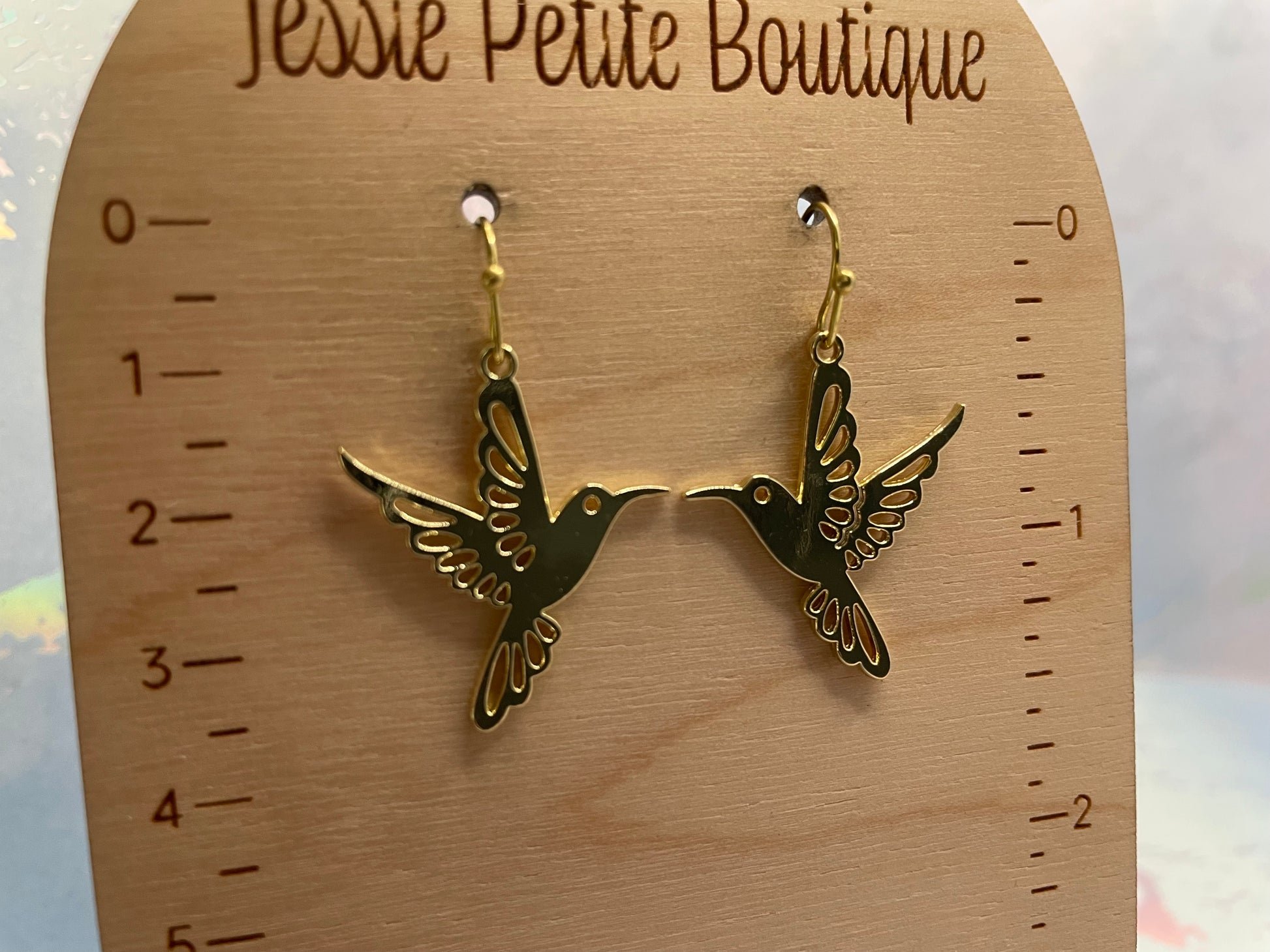 Delicate and eye-catching, these gold-tone drop earrings feature a finely detailed hummingbird silhouette with elegant openwork accents. Their lightweight design offers comfortable wear while adding a graceful touch of movement and shine.