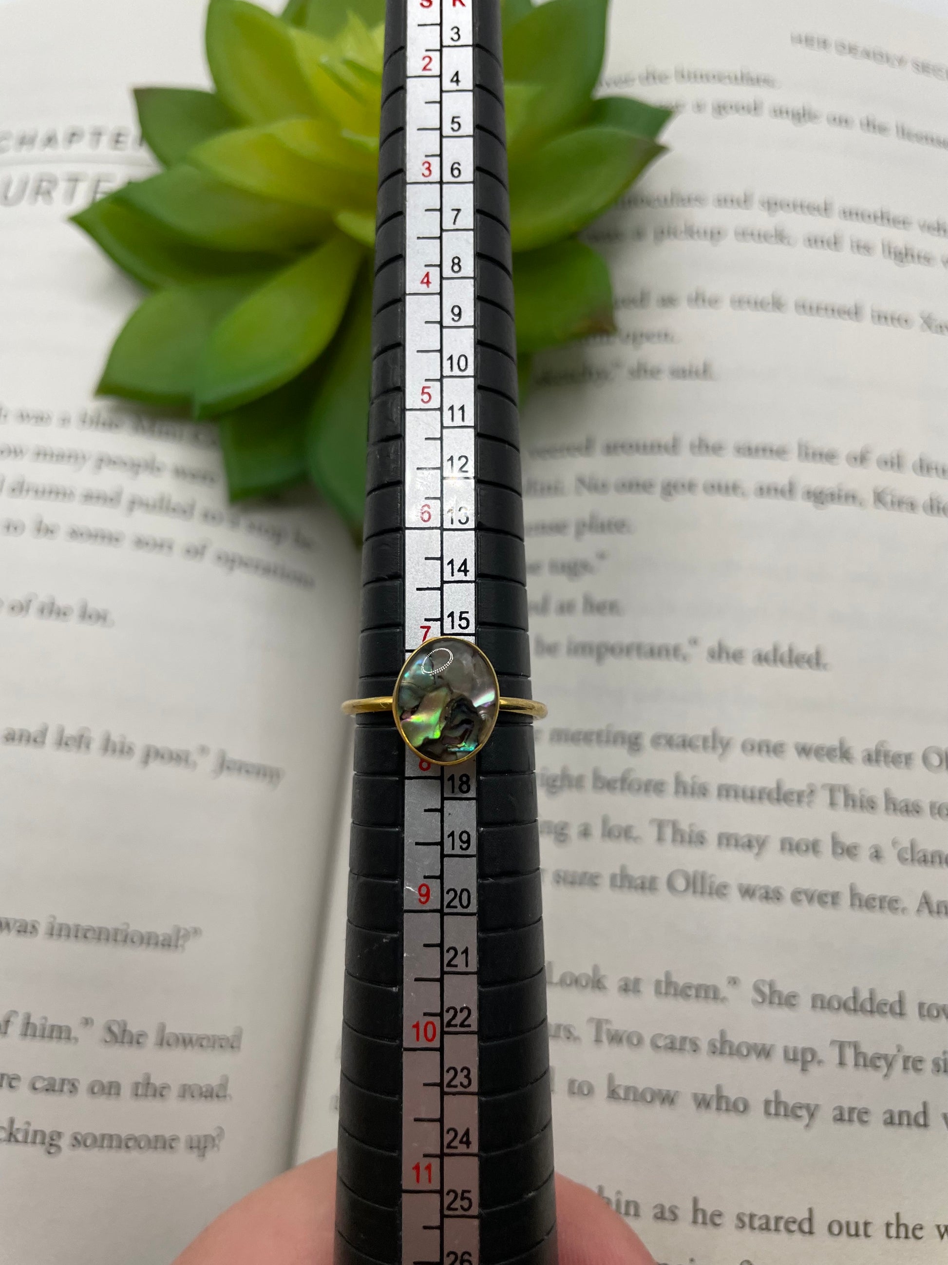 Elegant and timeless, this gold-plated 925 sterling silver ring features a 9×11 mm oval bezel filled with shimmering shell pieces encapsulated in resin.