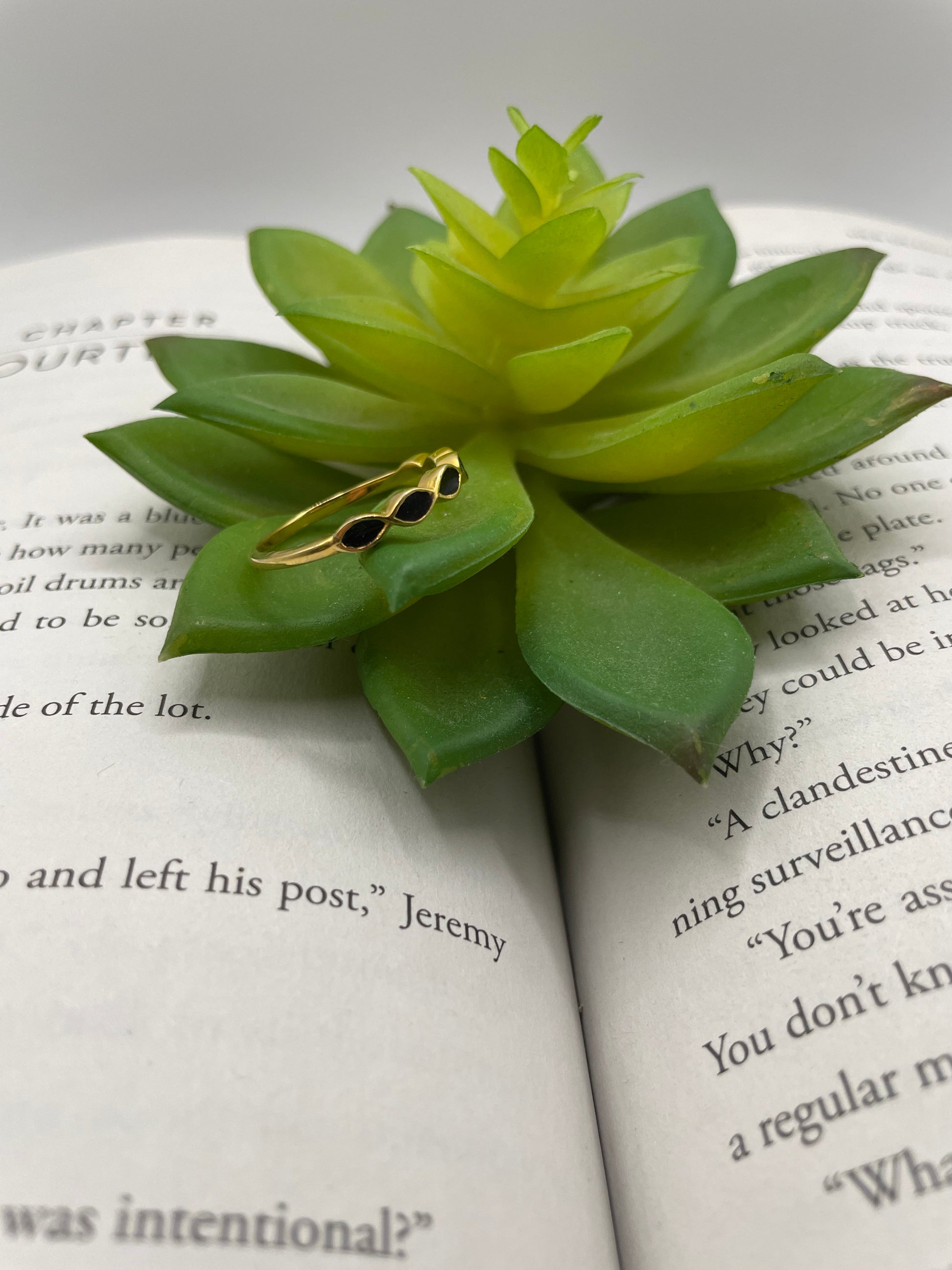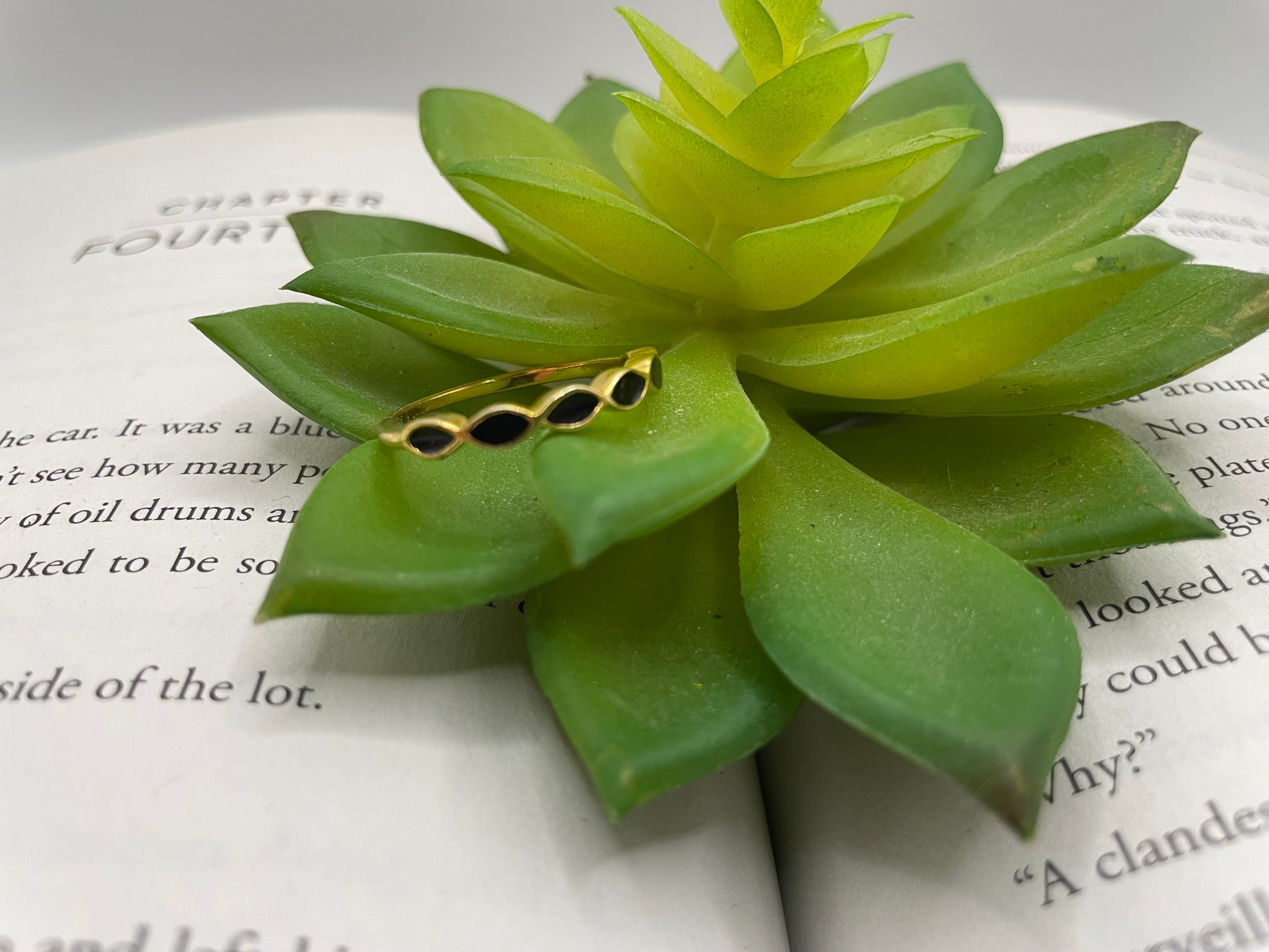 Elegant and timeless, this 925 sterling silver ring is gold-plated and features a series of 2 × 3 mm marquise-shaped bezels filled with black resin and mica powder. The alternating curved design adds a refined texture and a touch of sophistication.