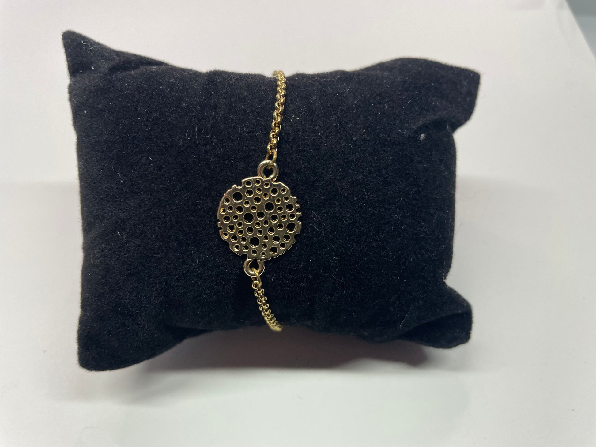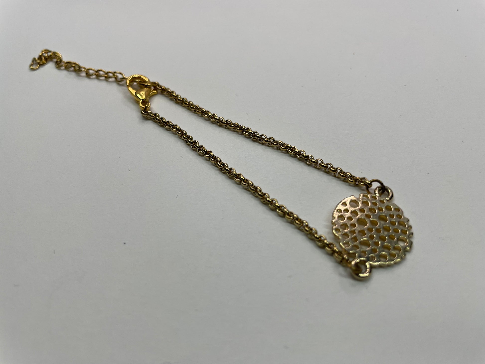 Delicate and modern, this stainless steel bracelet features a finely detailed openwork round charm with an airy, lace-like design. Its subtle texture adds visual interest while remaining lightweight and comfortable for everyday wear. Finished with a classic chain and an adjustable extension, it layers beautifully with other bracelets or stands elegantly on its own.
