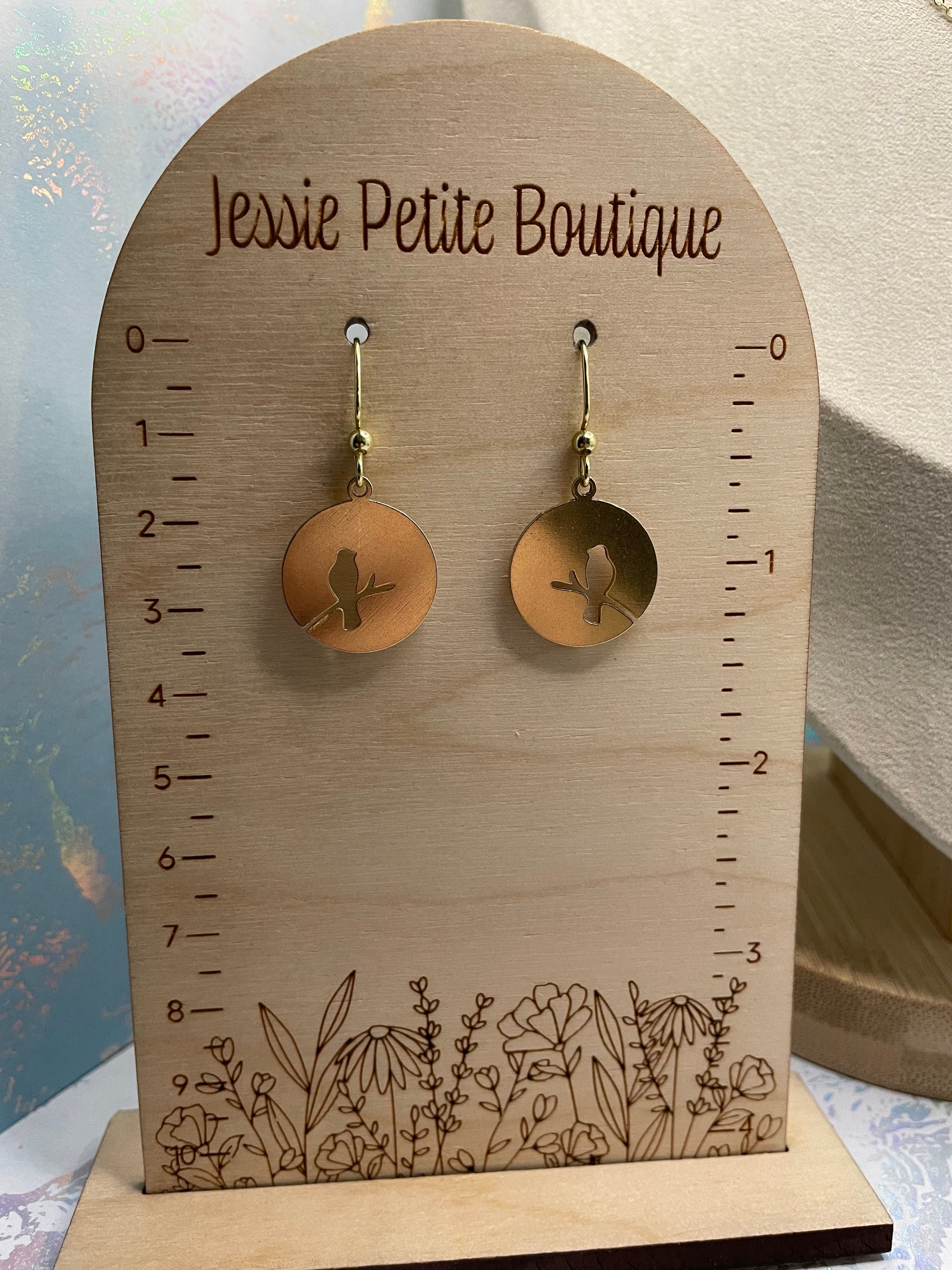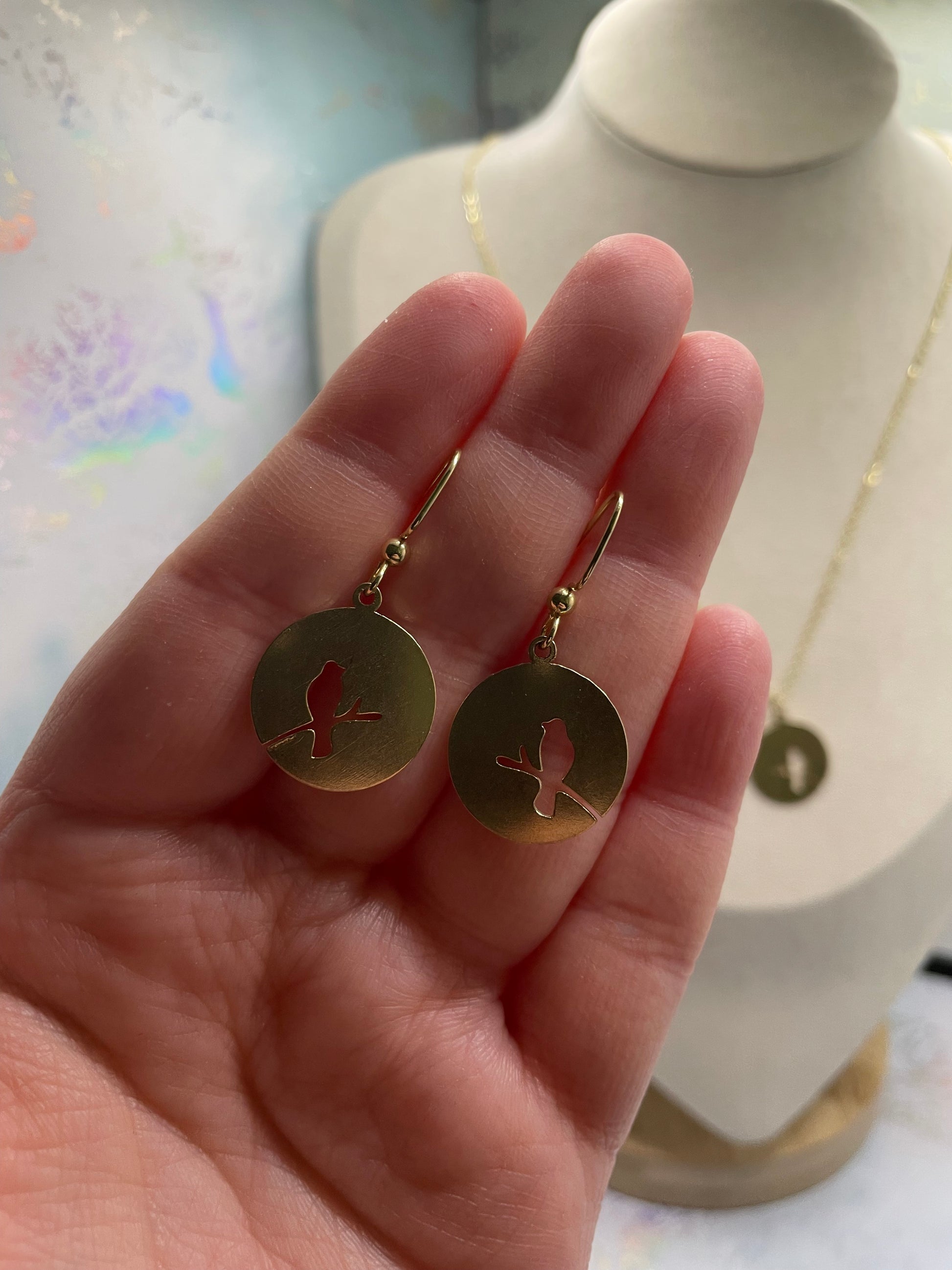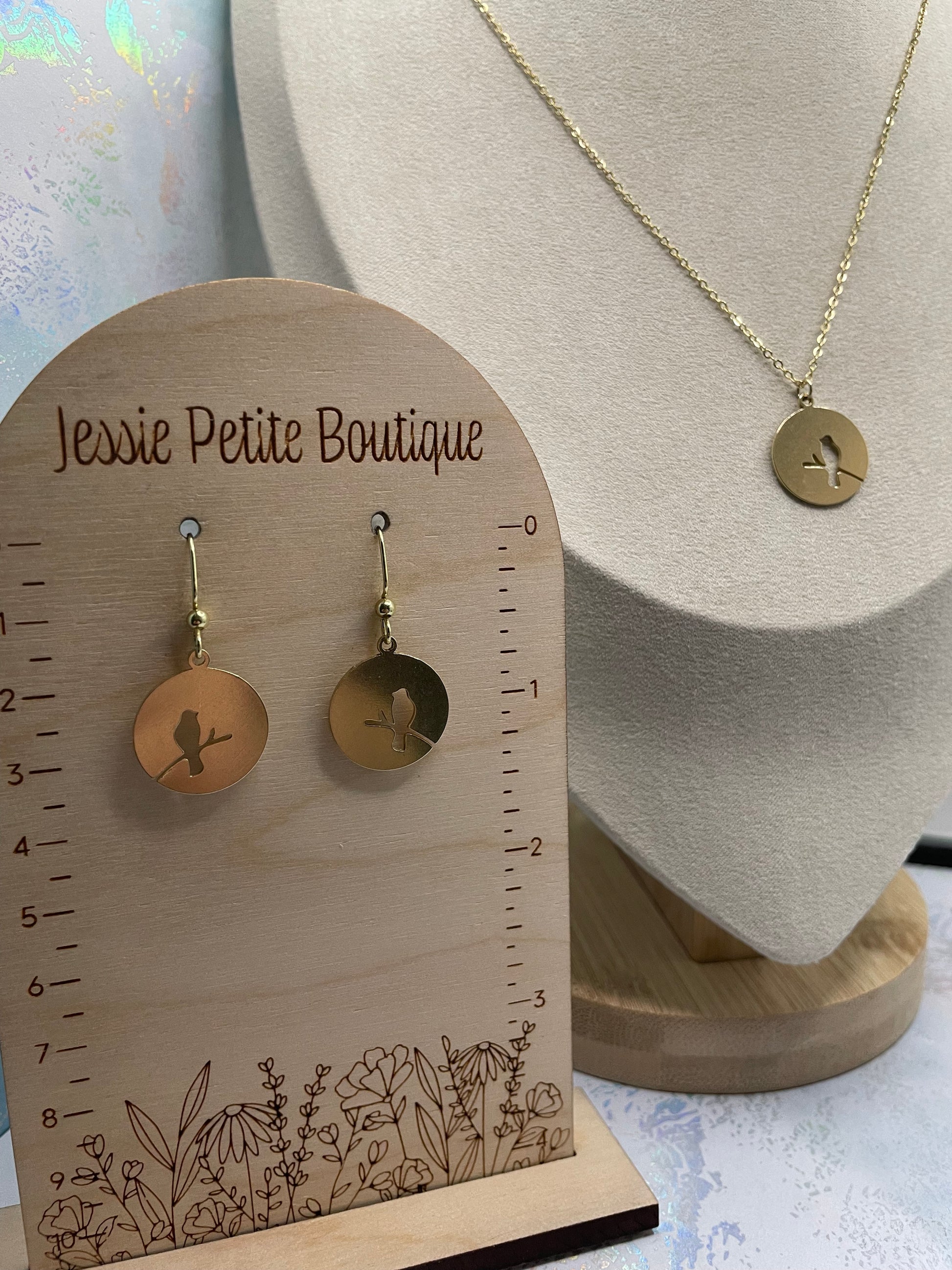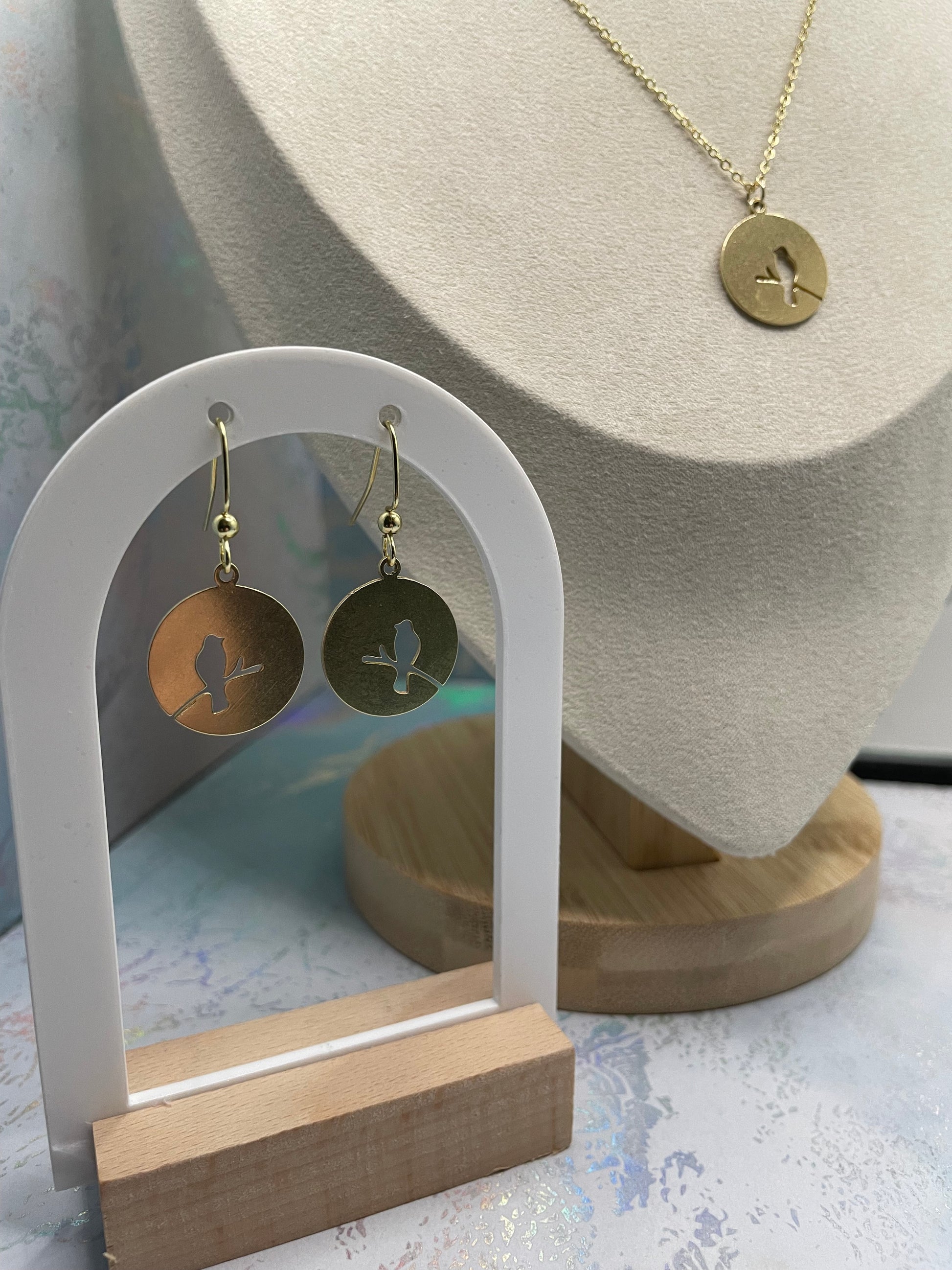 Delicate and timeless, this Sparrow on a Branch Jewelry Set features an intricate laser-cut design of a sparrow perched on a branch. The circular pendant and matching earrings are crafted from brass, offering a lightweight yet durable finish. With a warm golden hue, this set effortlessly complements any outfit, from casual to elegant occasions.