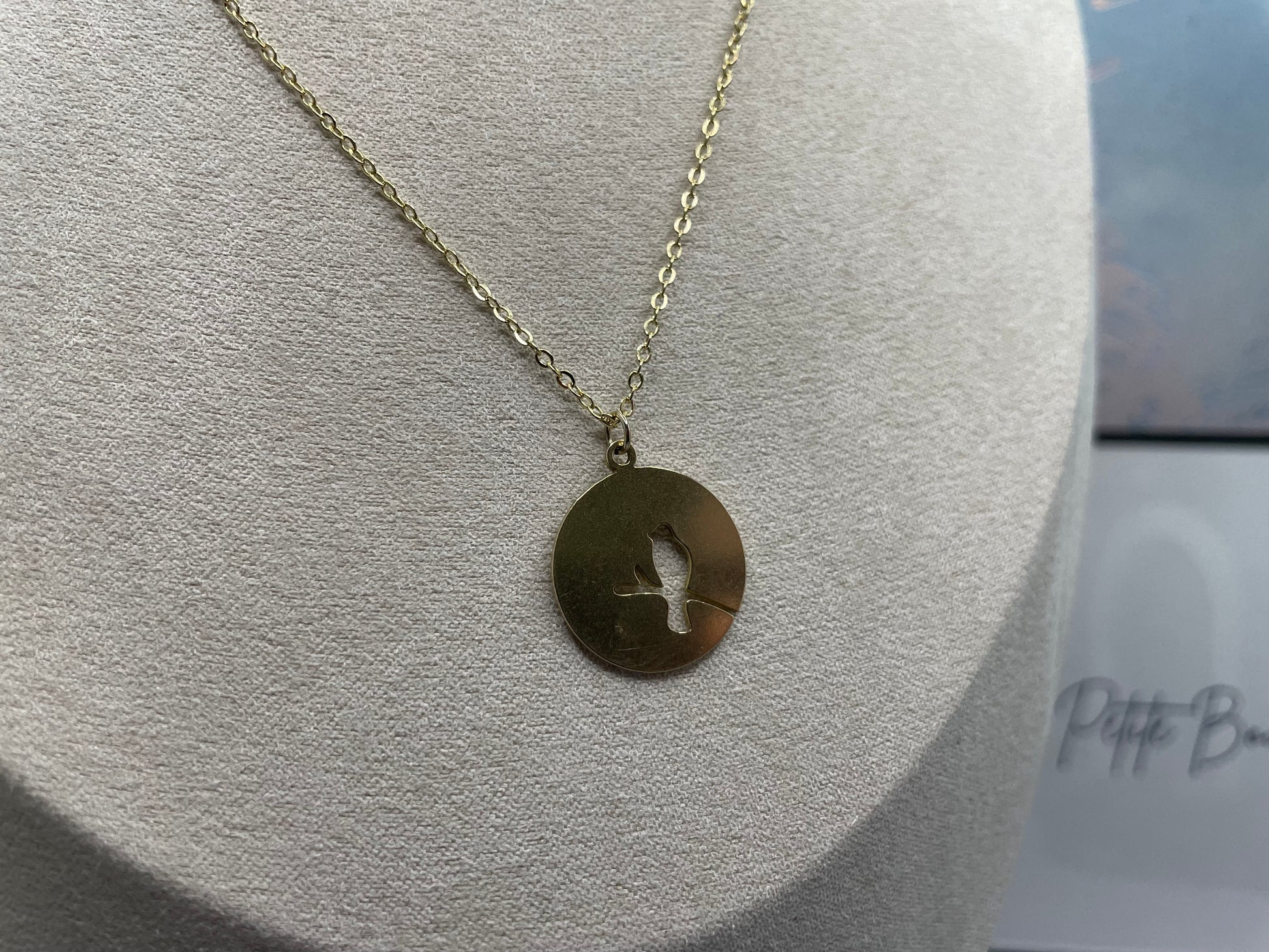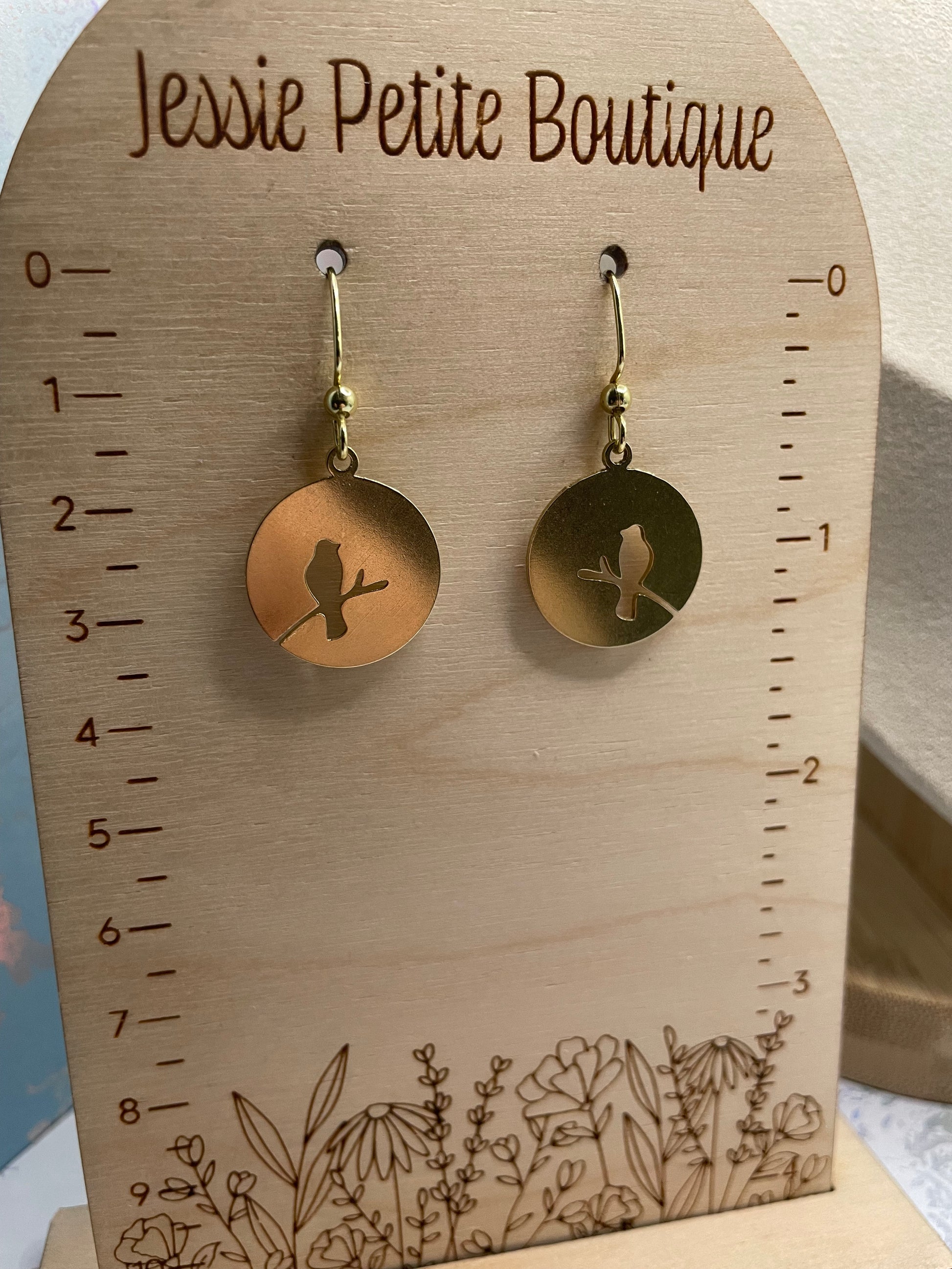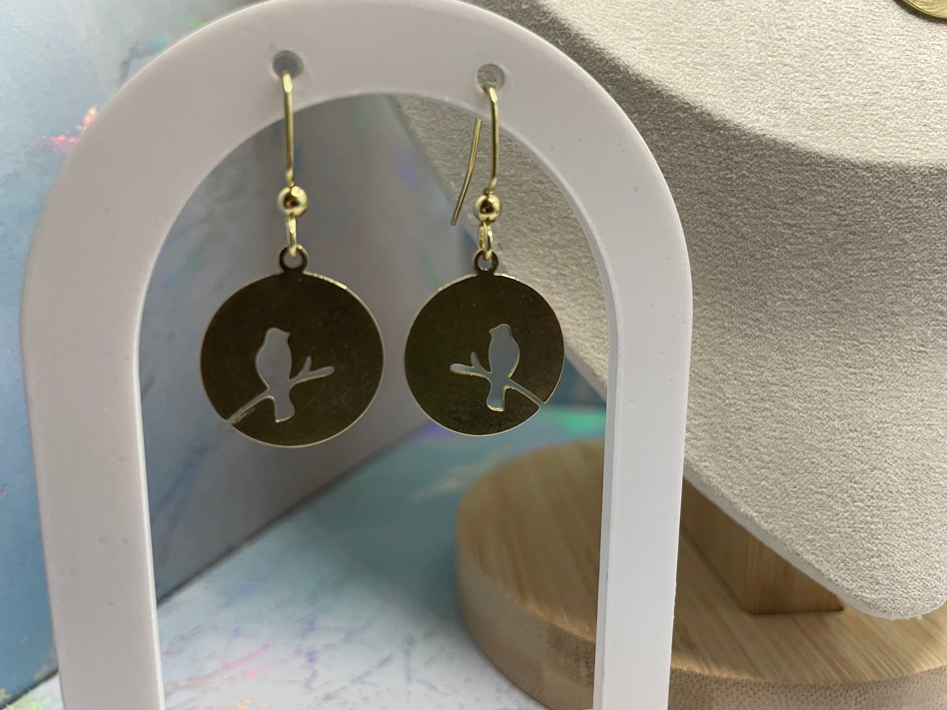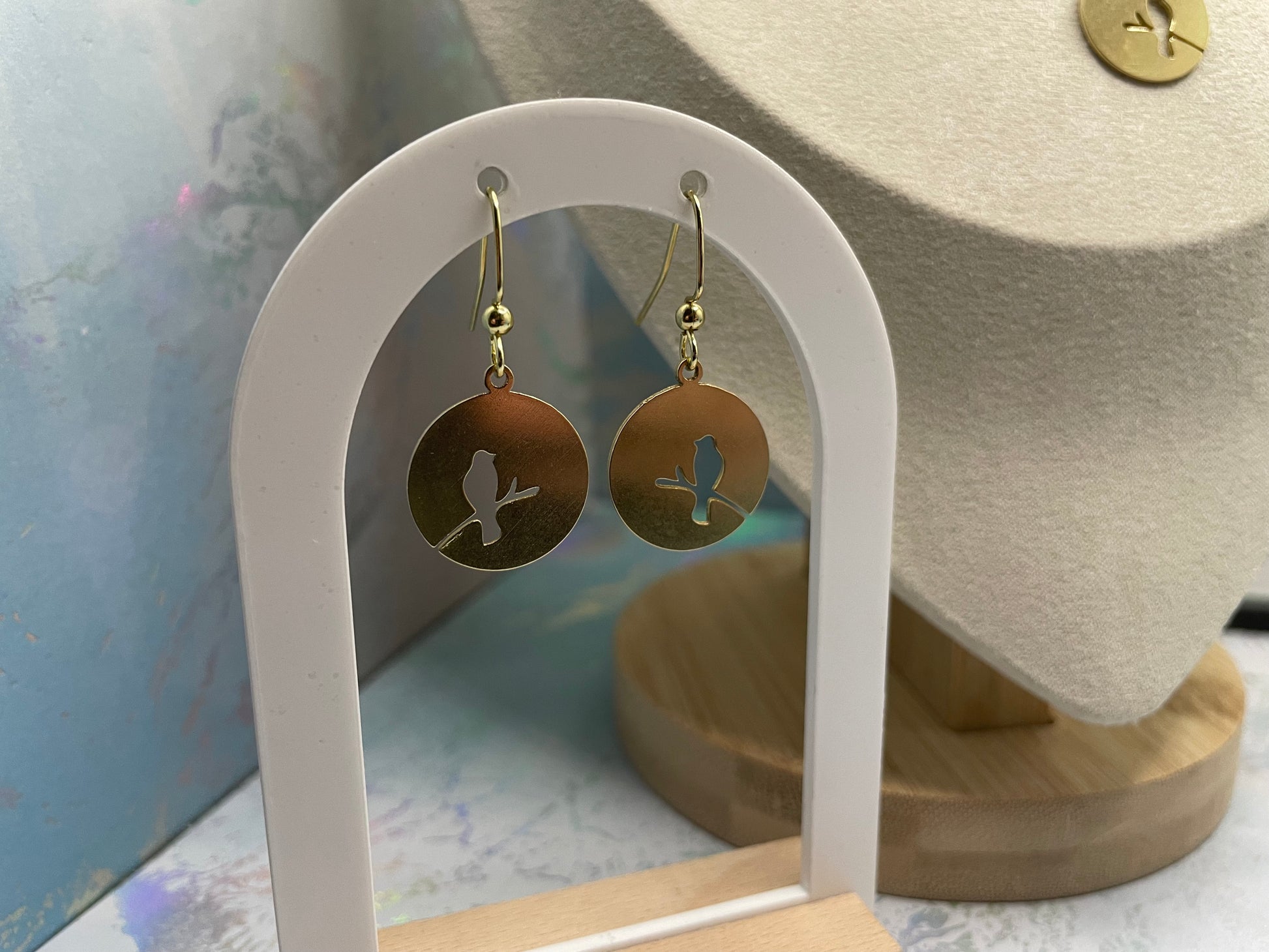 Delicate and timeless, this Sparrow on a Branch Jewelry Set features an intricate laser-cut design of a sparrow perched on a branch. The circular pendant and matching earrings are crafted from brass, offering a lightweight yet durable finish. With a warm golden hue, this set effortlessly complements any outfit, from casual to elegant occasions.