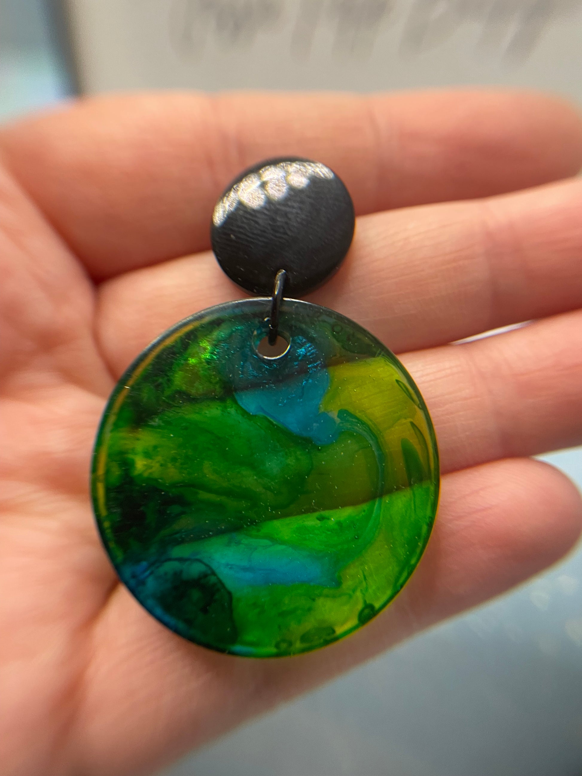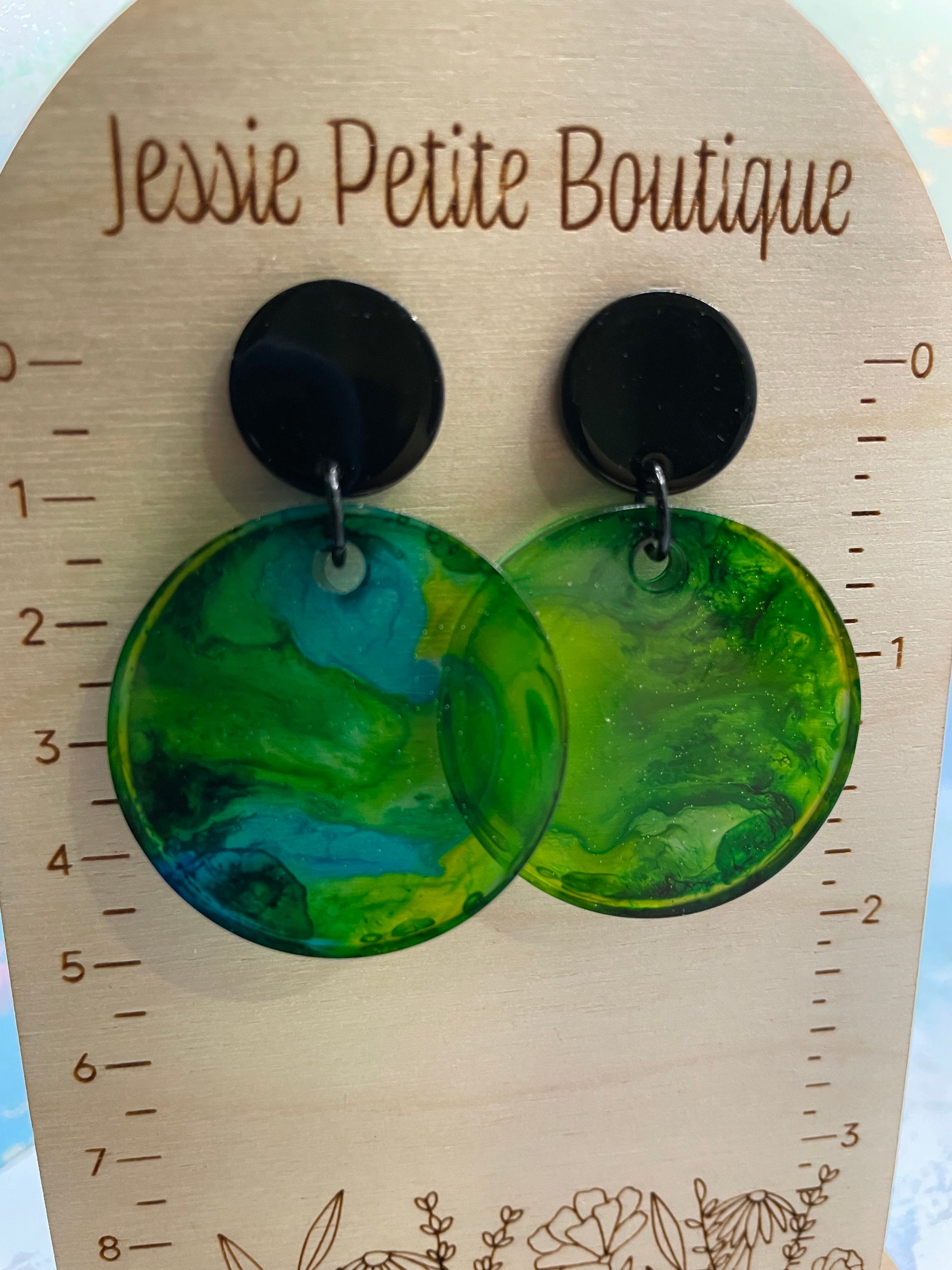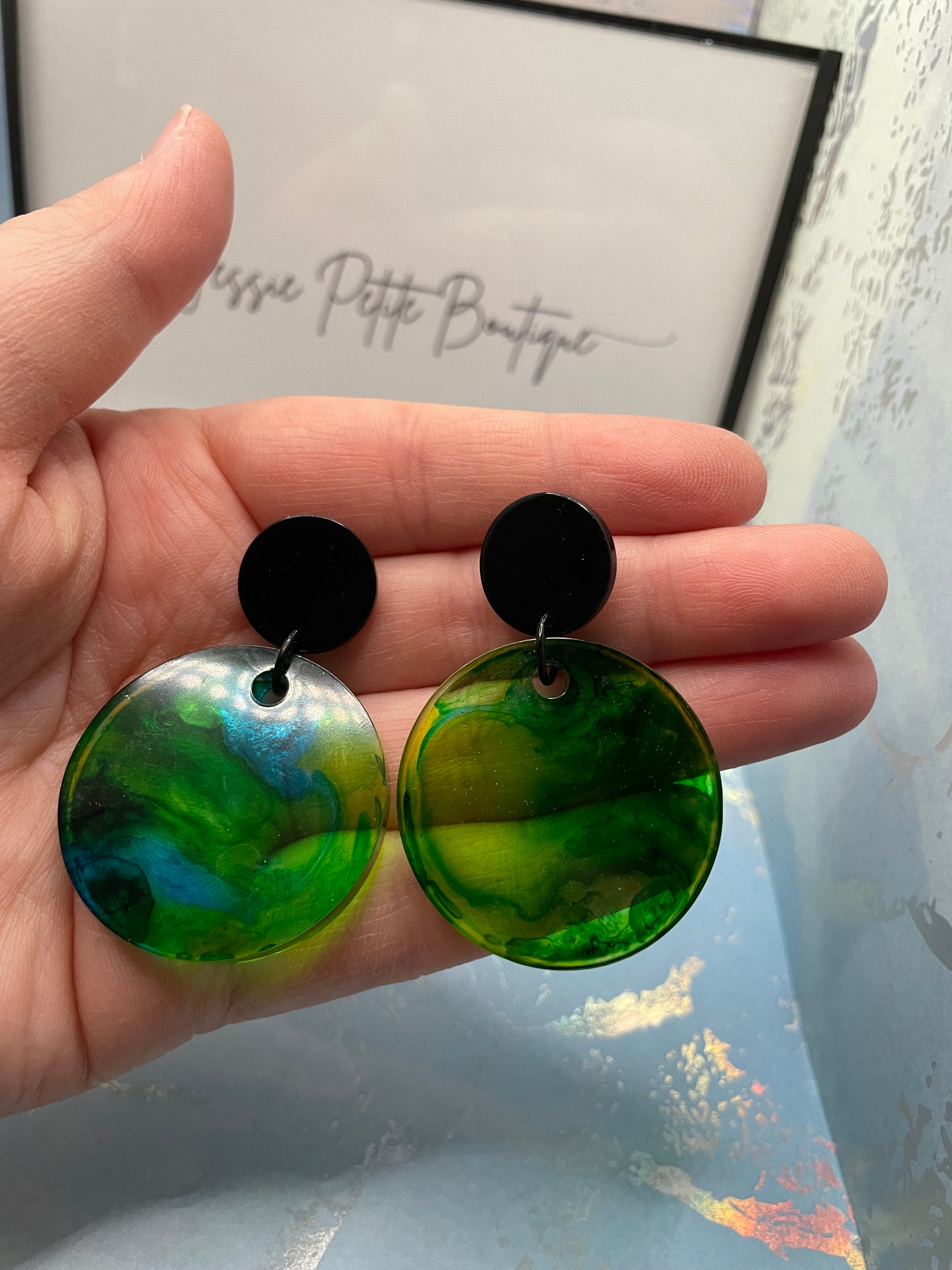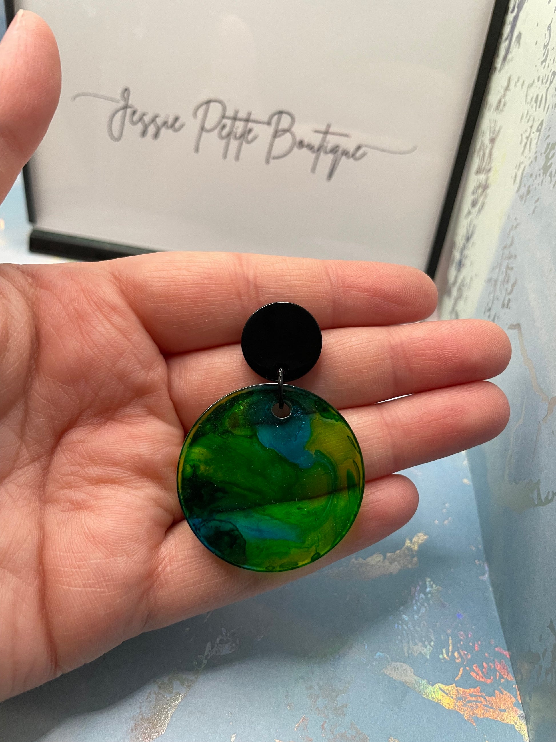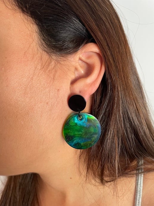 These stunning earrings feature a blend of green and blue translucent resin, paired with a black round stud for a bold contrast. The alcohol ink gives the earrings a dynamic and unique appearance, while the nickel-free butterfly closure ensures comfort for sensitive ears.