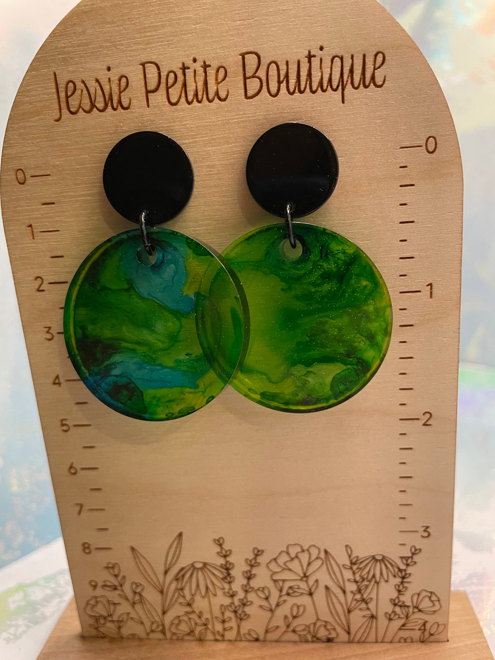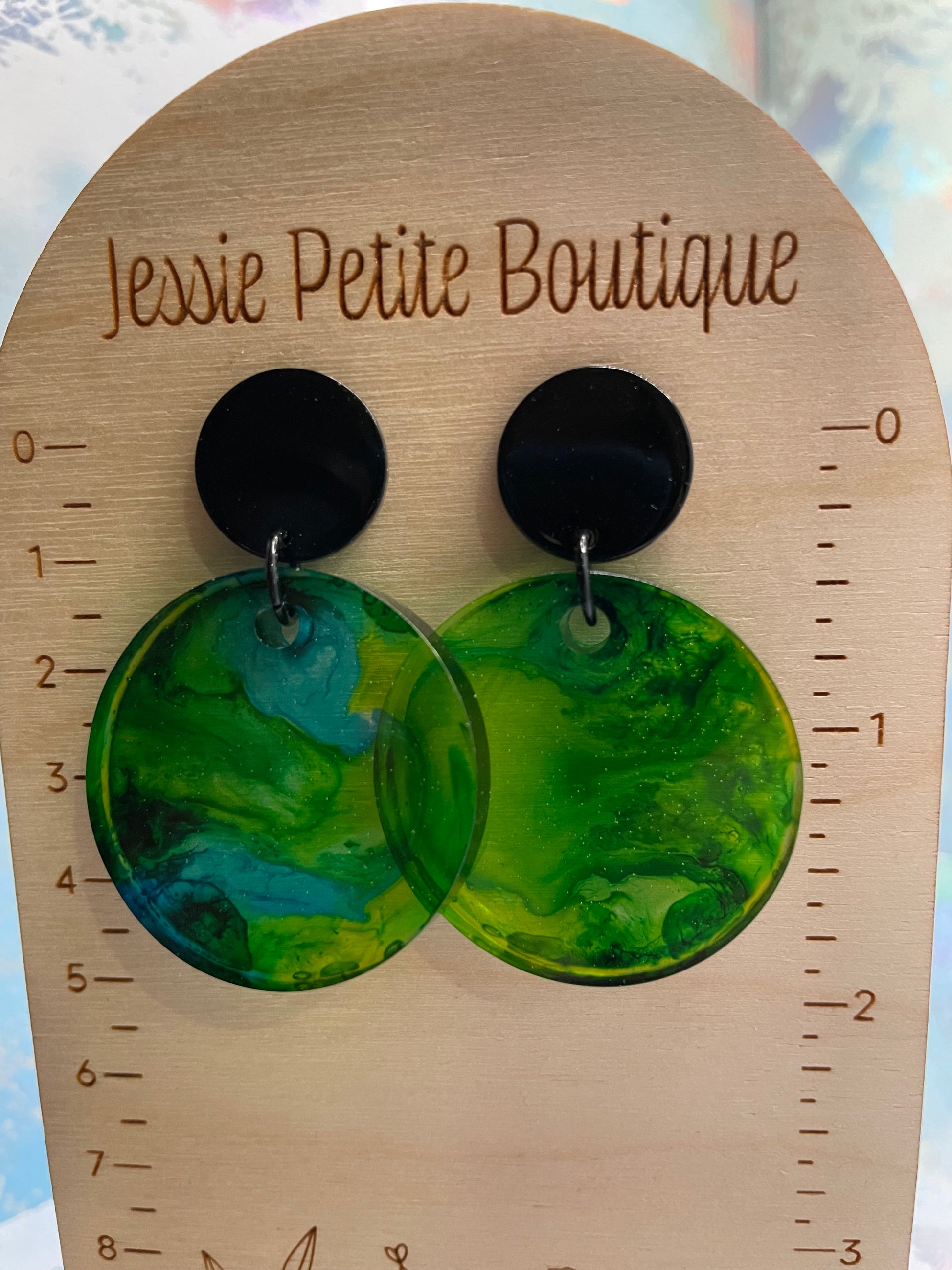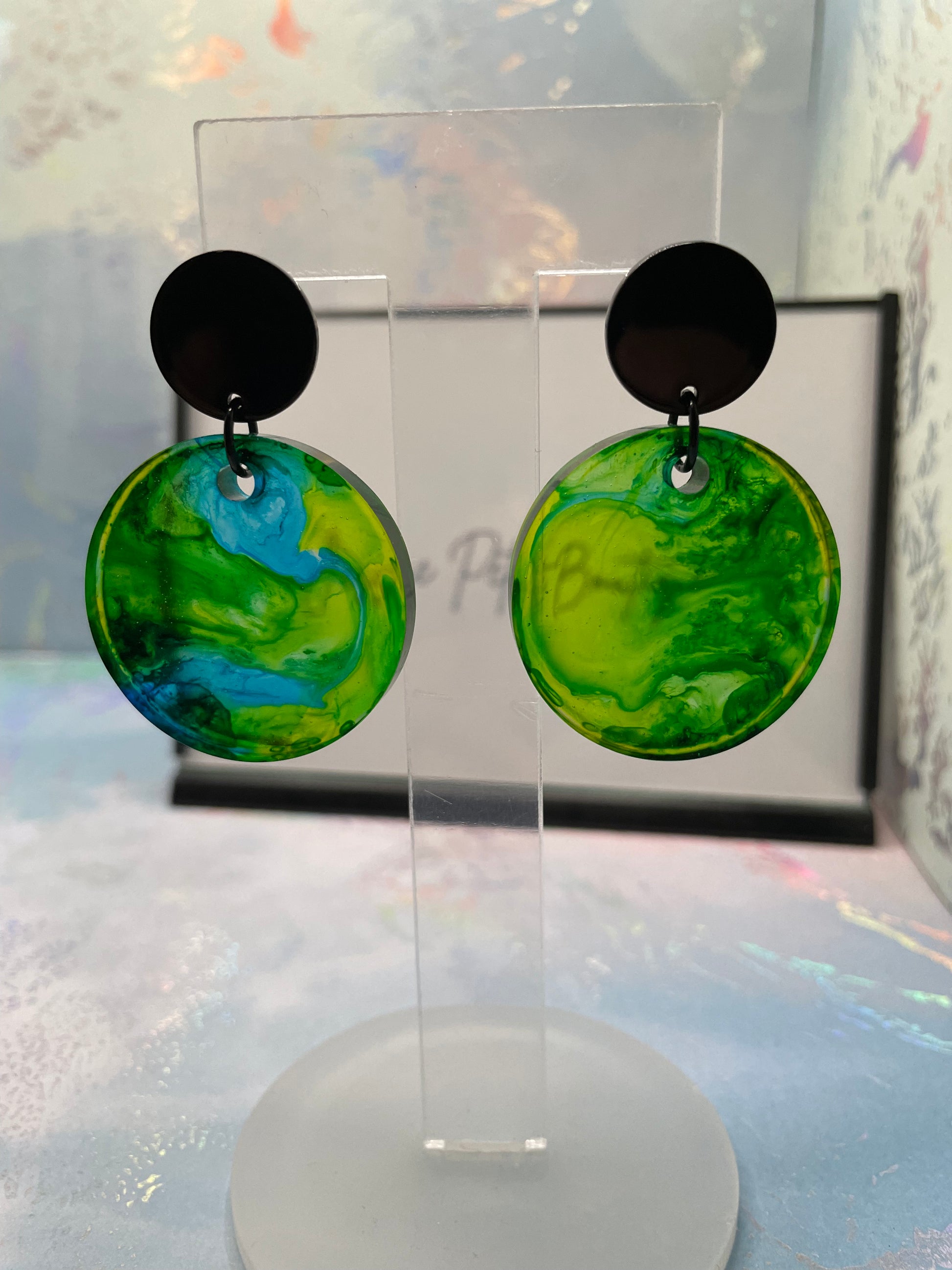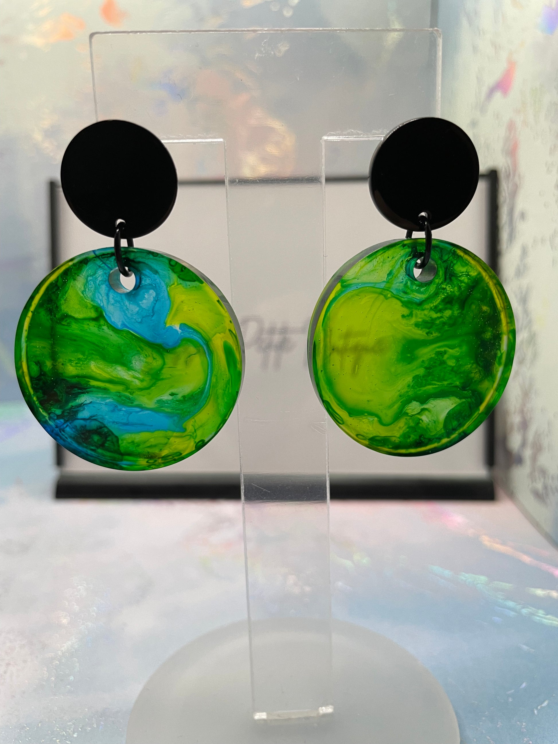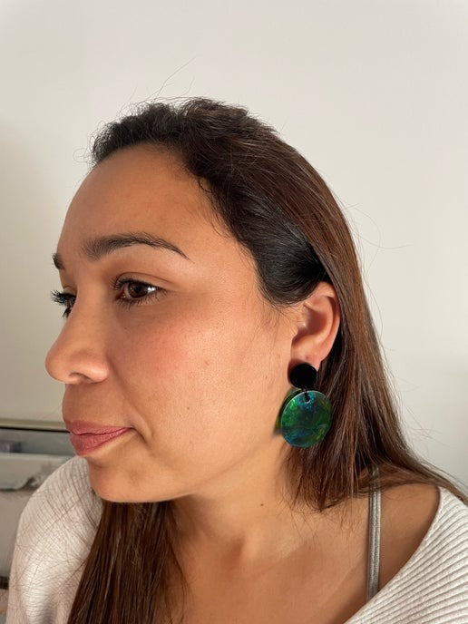 These stunning earrings feature a blend of green and blue translucent resin, paired with a black round stud for a bold contrast. The alcohol ink gives the earrings a dynamic and unique appearance, while the nickel-free butterfly closure ensures comfort for sensitive ears.