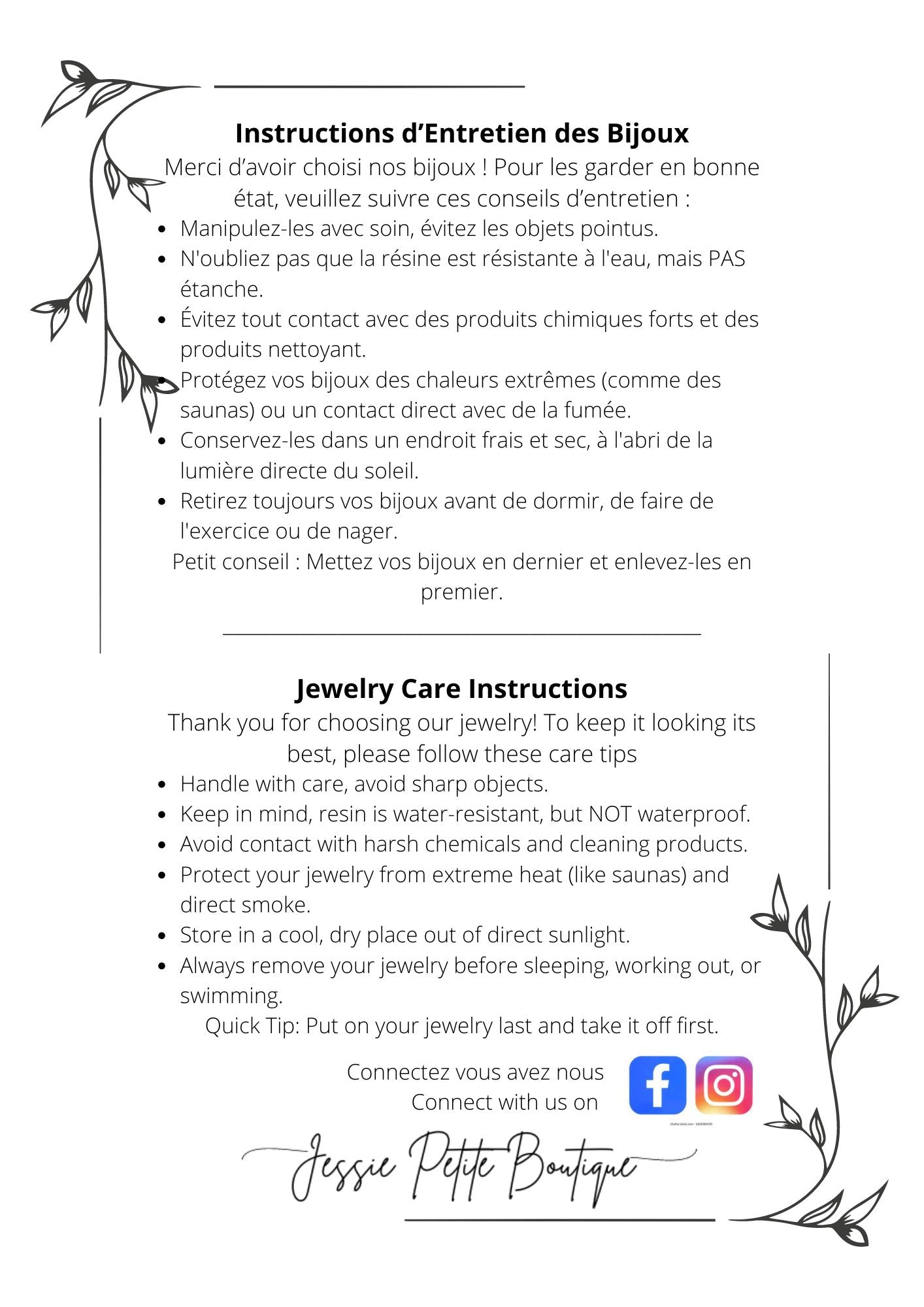 Care Instructions:We recommend removing your jewelry when exercising, showering/bathing, or sleeping. Avoid any contact with household products, creams/lotions, and smoke. Store them in a clean, dry place. You can polish your jewelry with a microfibre cloth