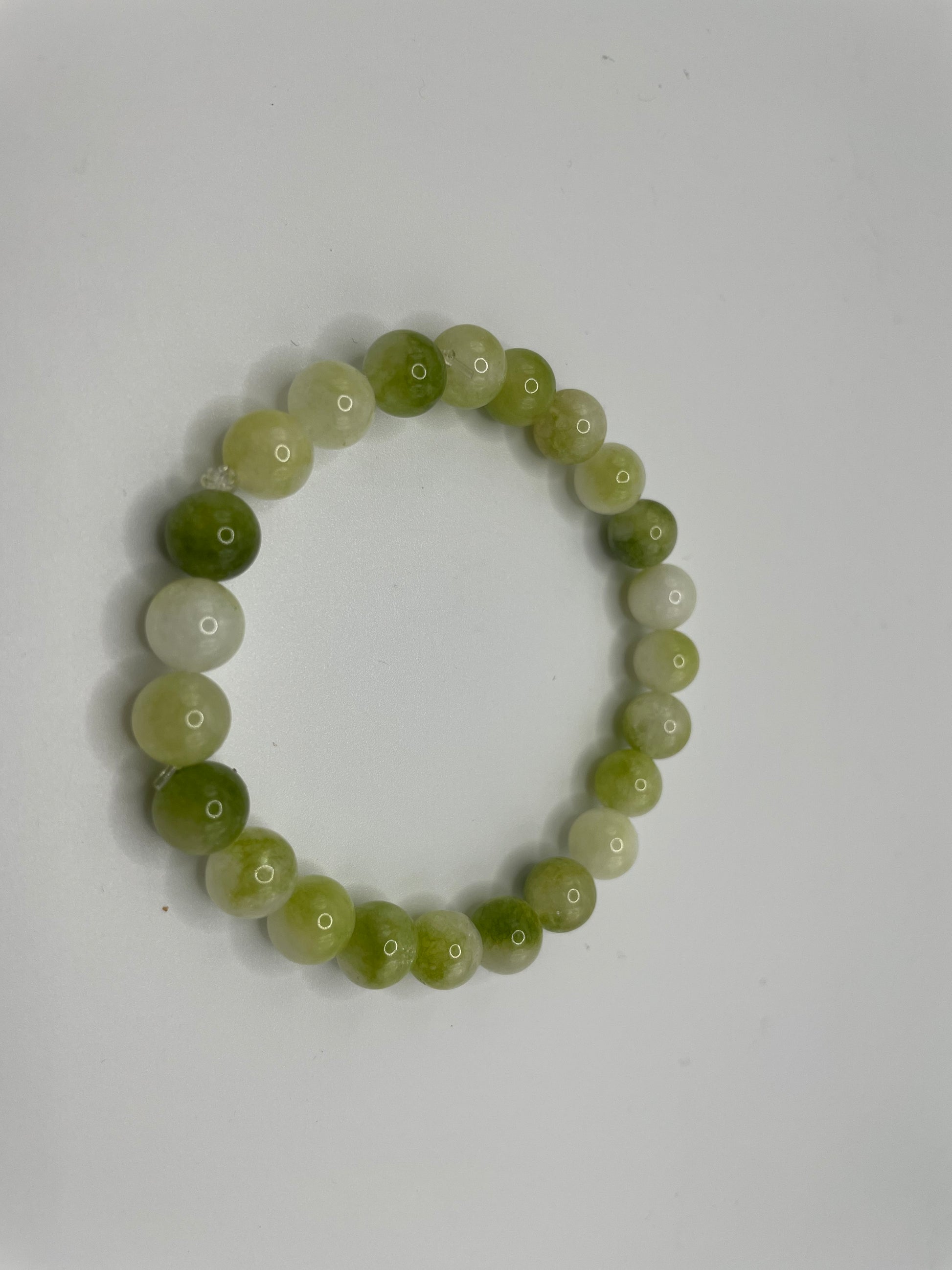 This handcrafted bracelet features a refreshing blend of green and white polished beads, creating a soft and natural look. Its minimalist design makes it an easy-to-wear accessory for any style, from casual to elegant.