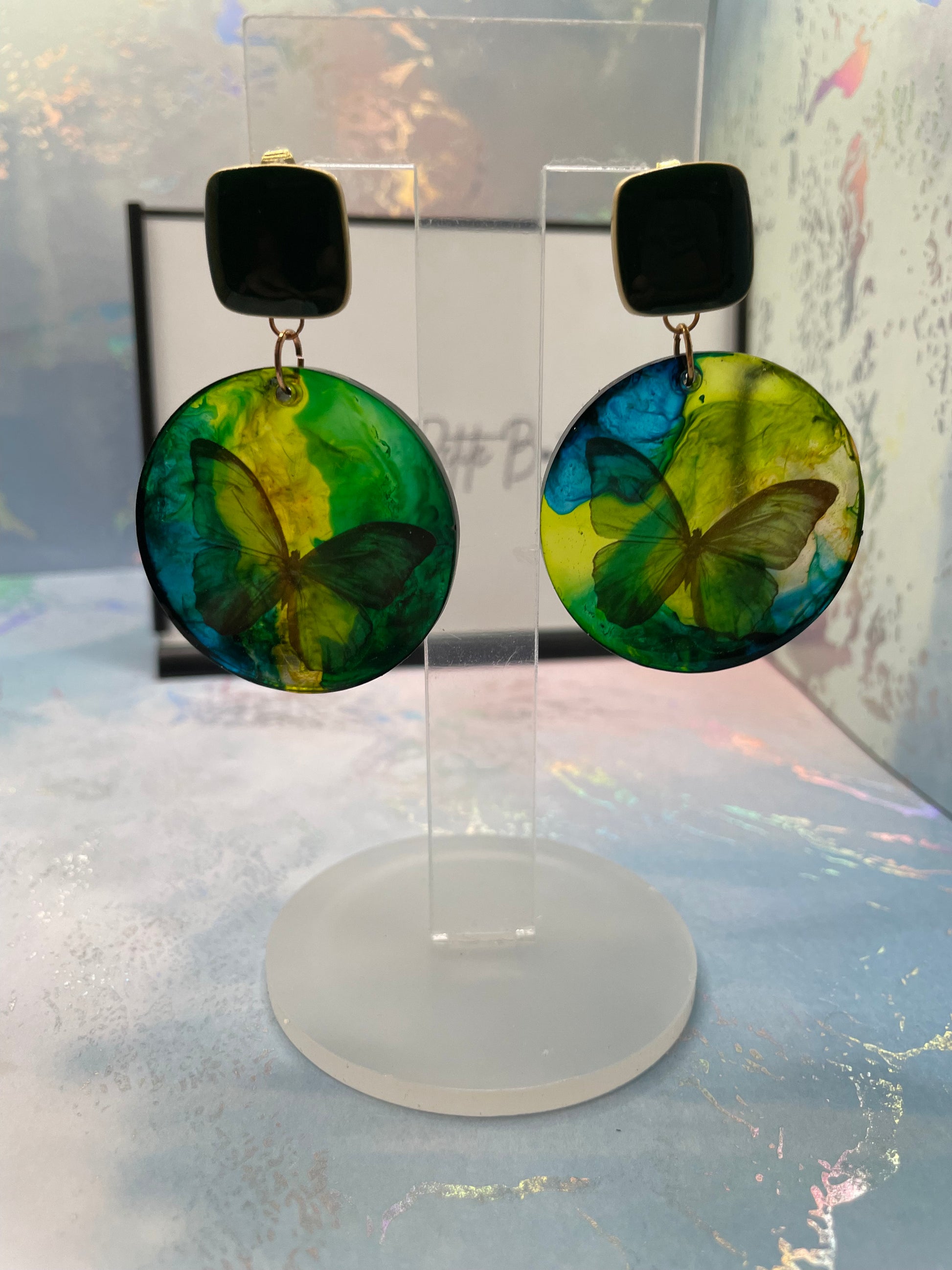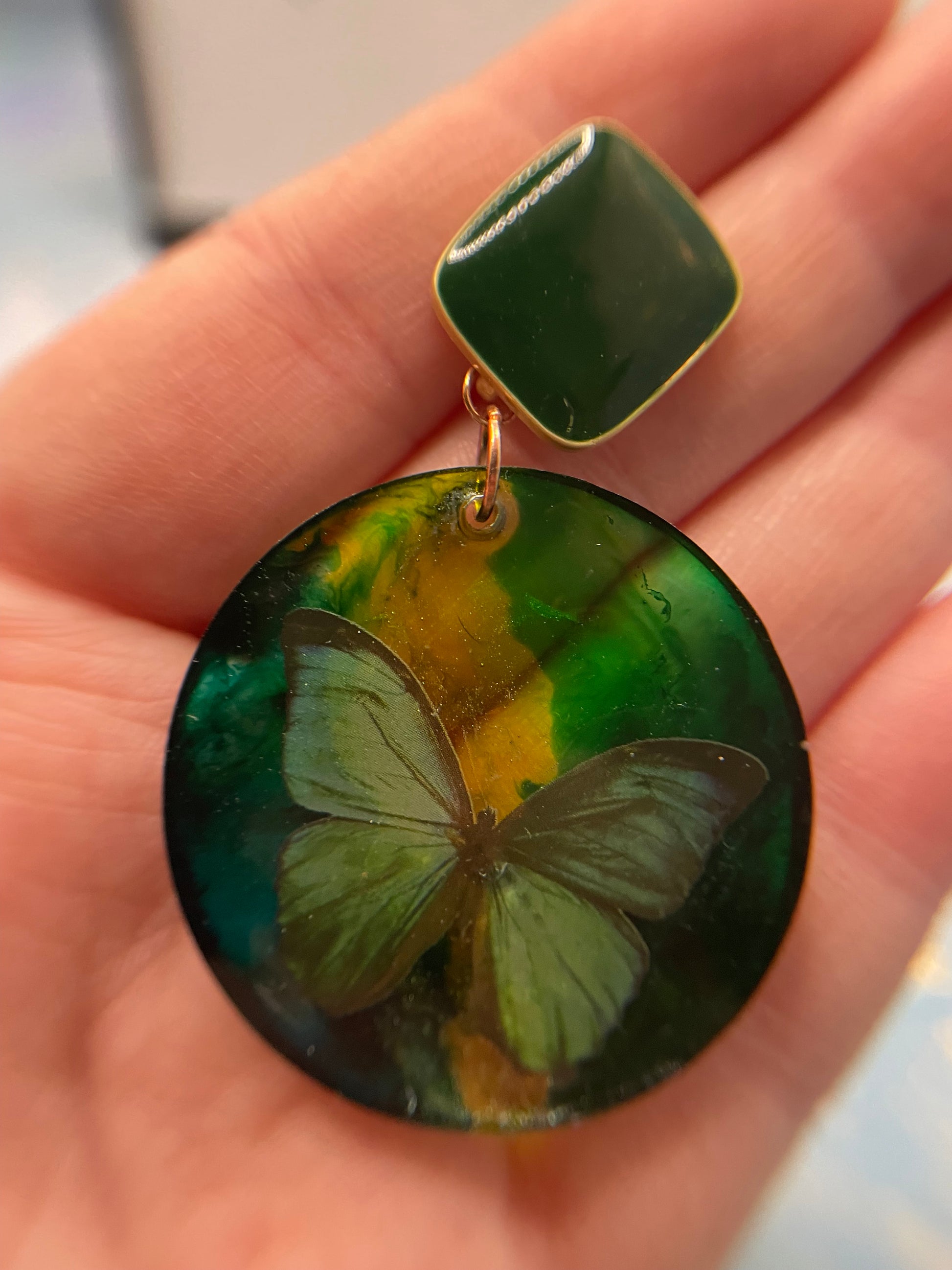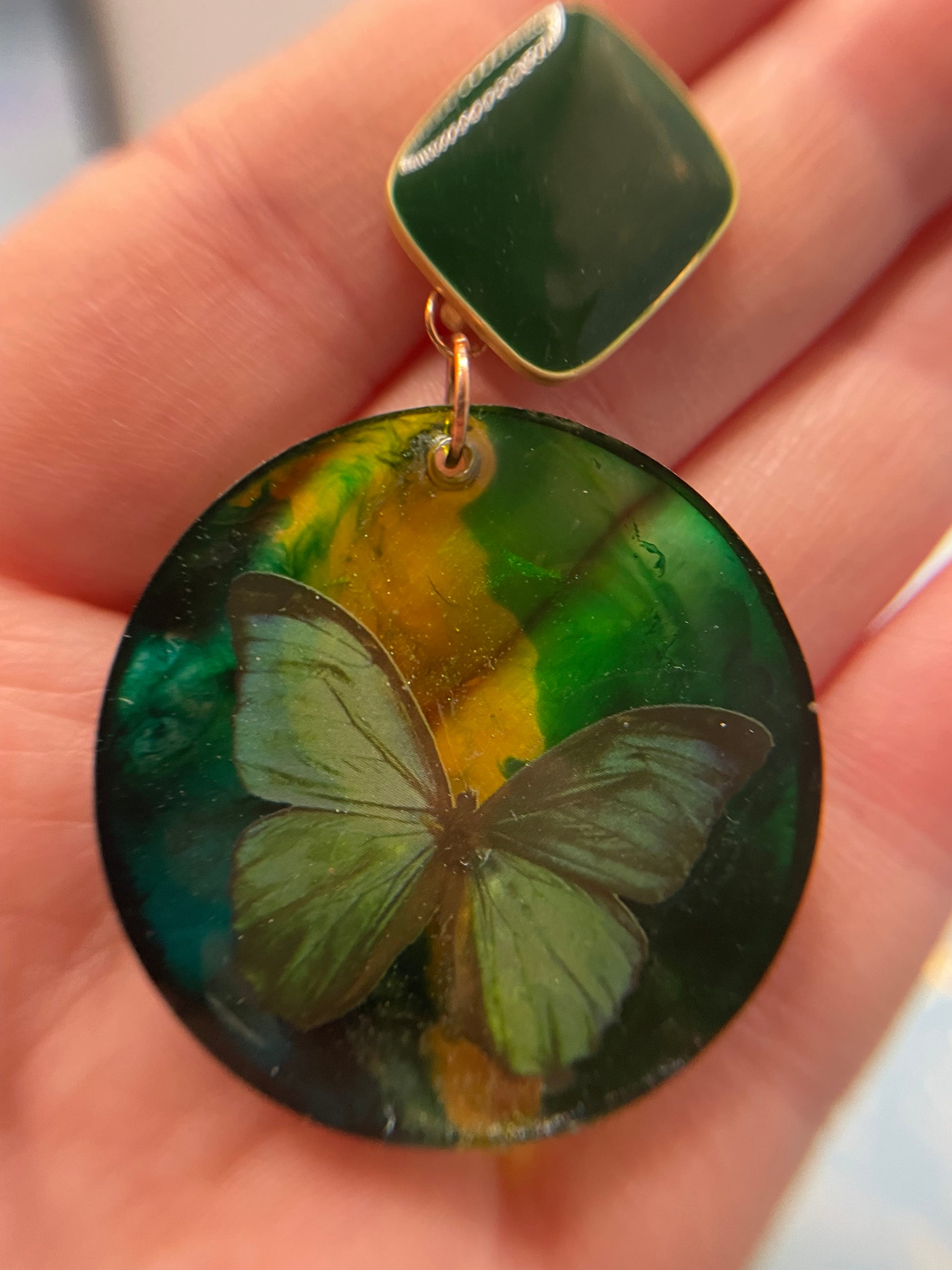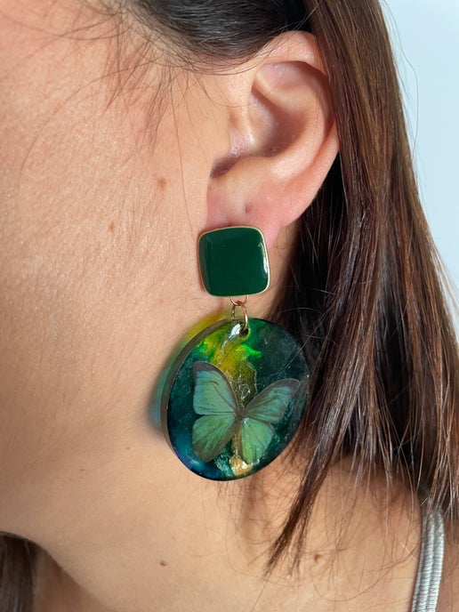 Materials: These earrings are crafted from a plastic butterfly, alcohol ink, and resin, with a green enamel and alloy stud. The nickel-free butterfly closure ensures comfort for sensitive ears.